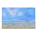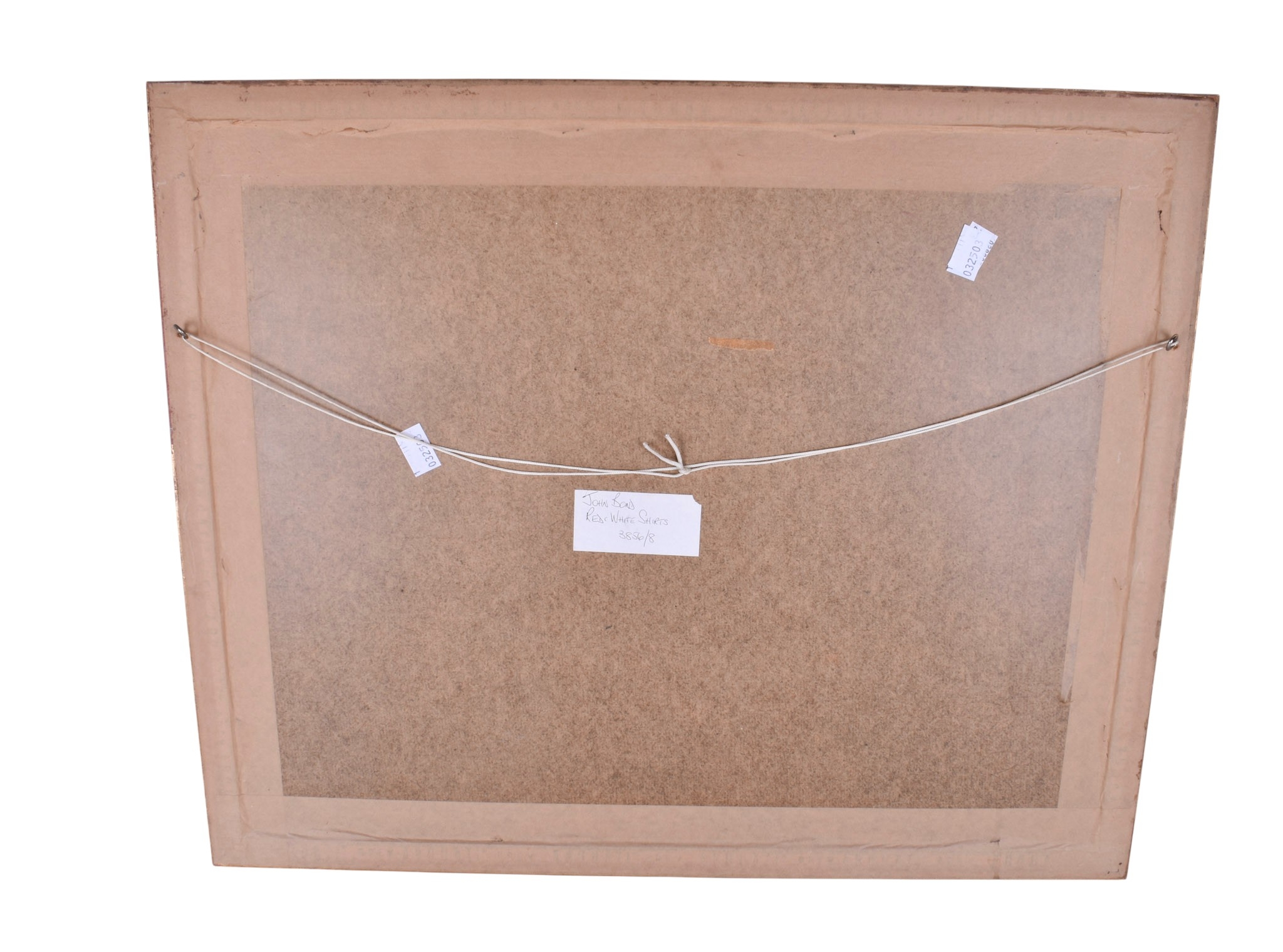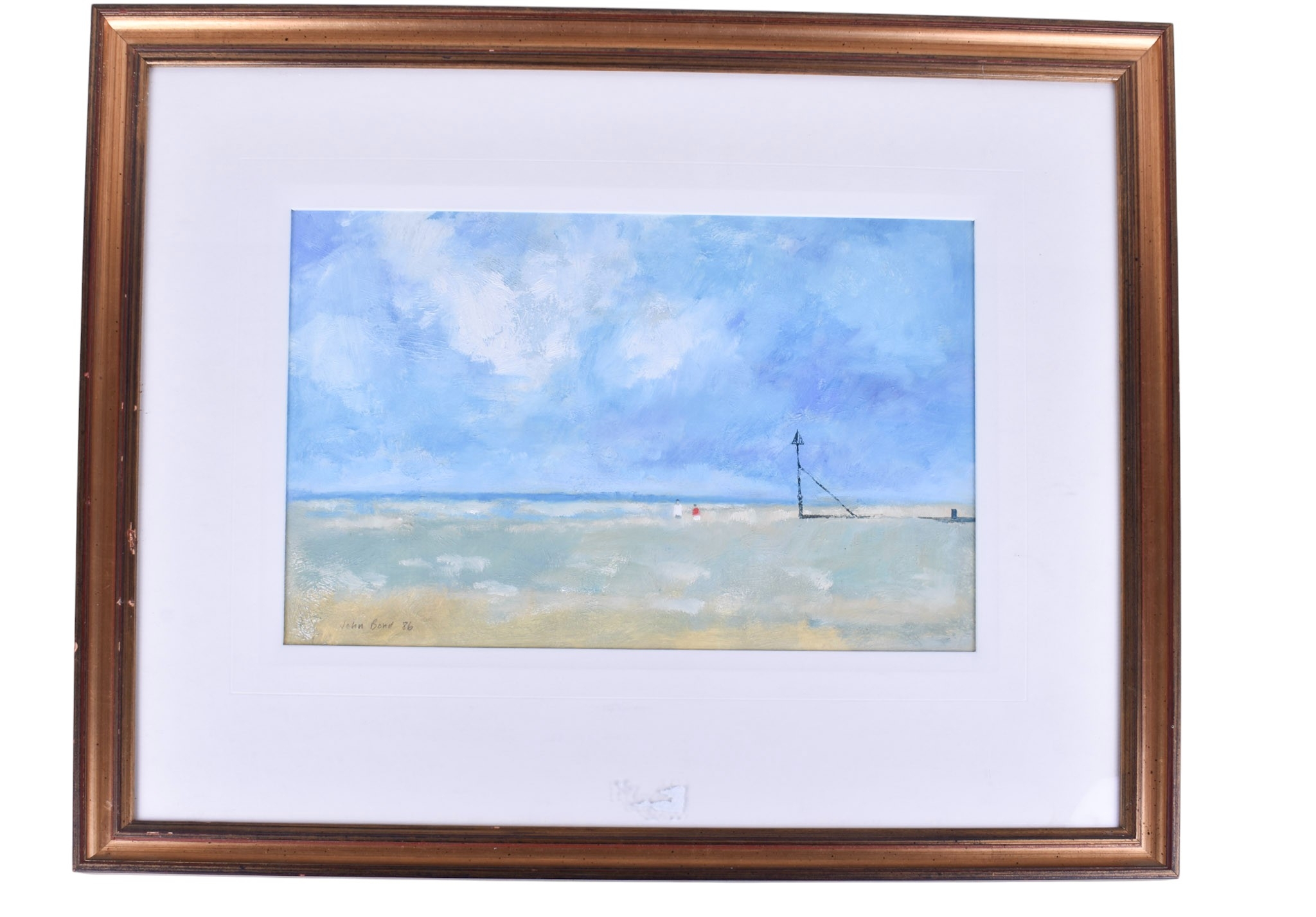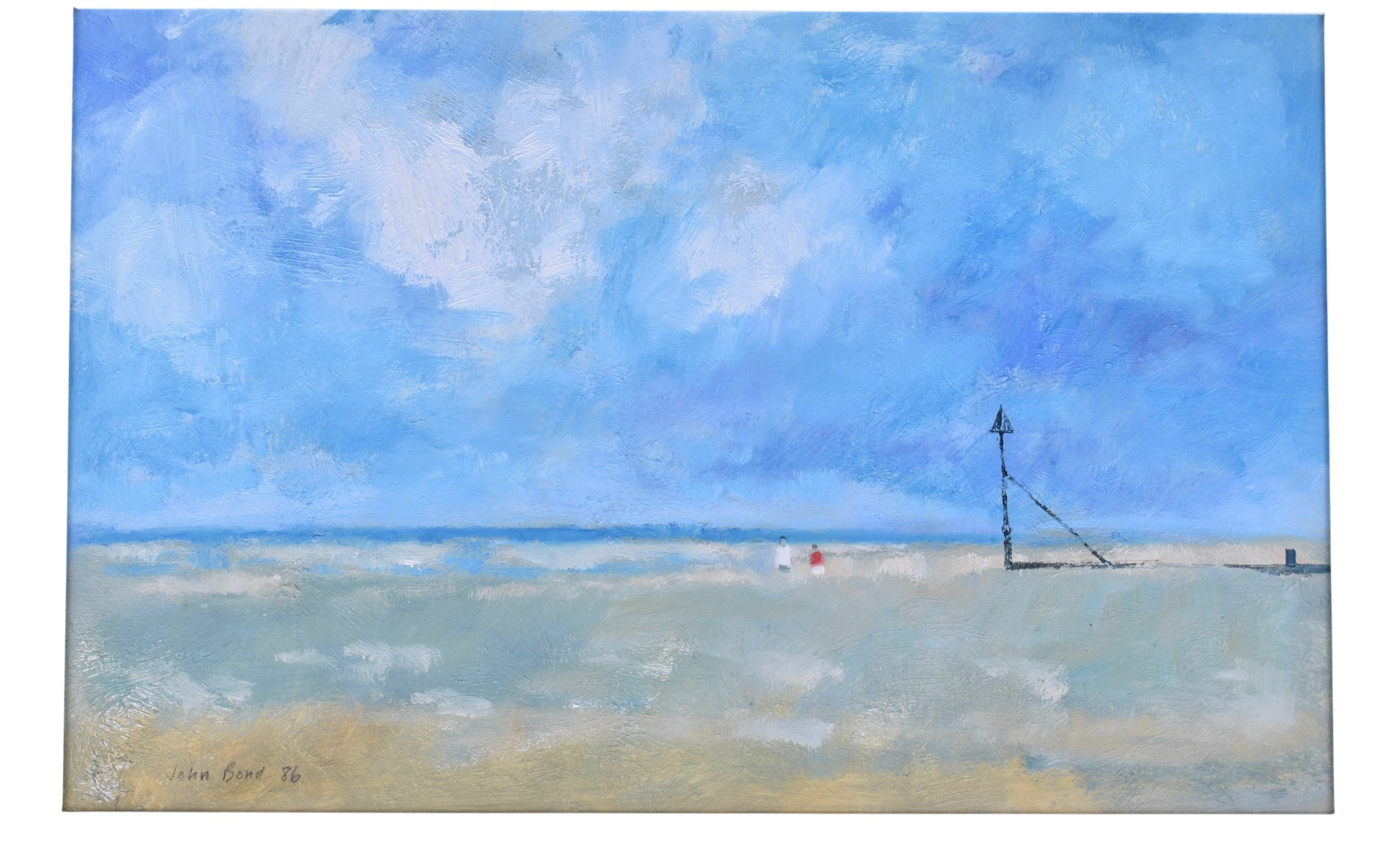 John Bond (British, 20th century) oil painting, titled verso 'Red and White Shirts'. Signed lower left and dated '86, numbered verso 3855/8, 23cm x 35.5cm, framed and glazed.