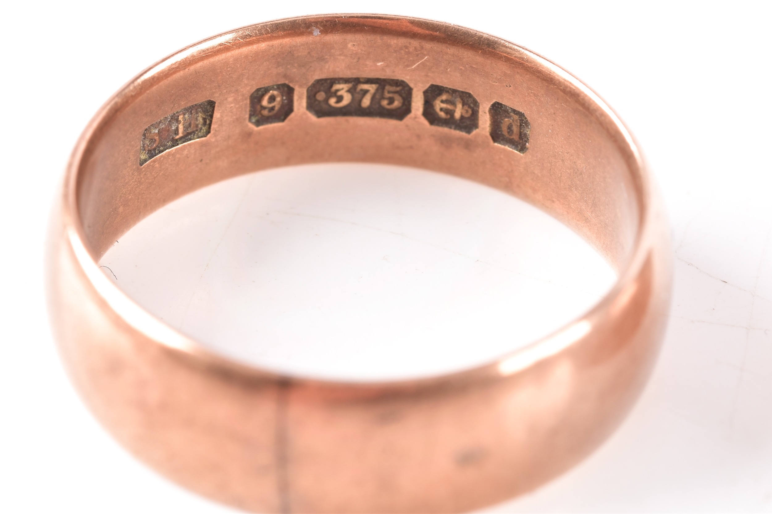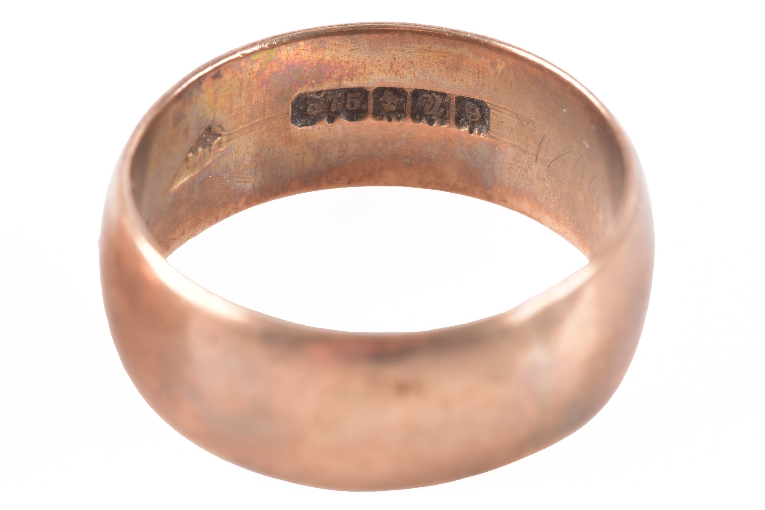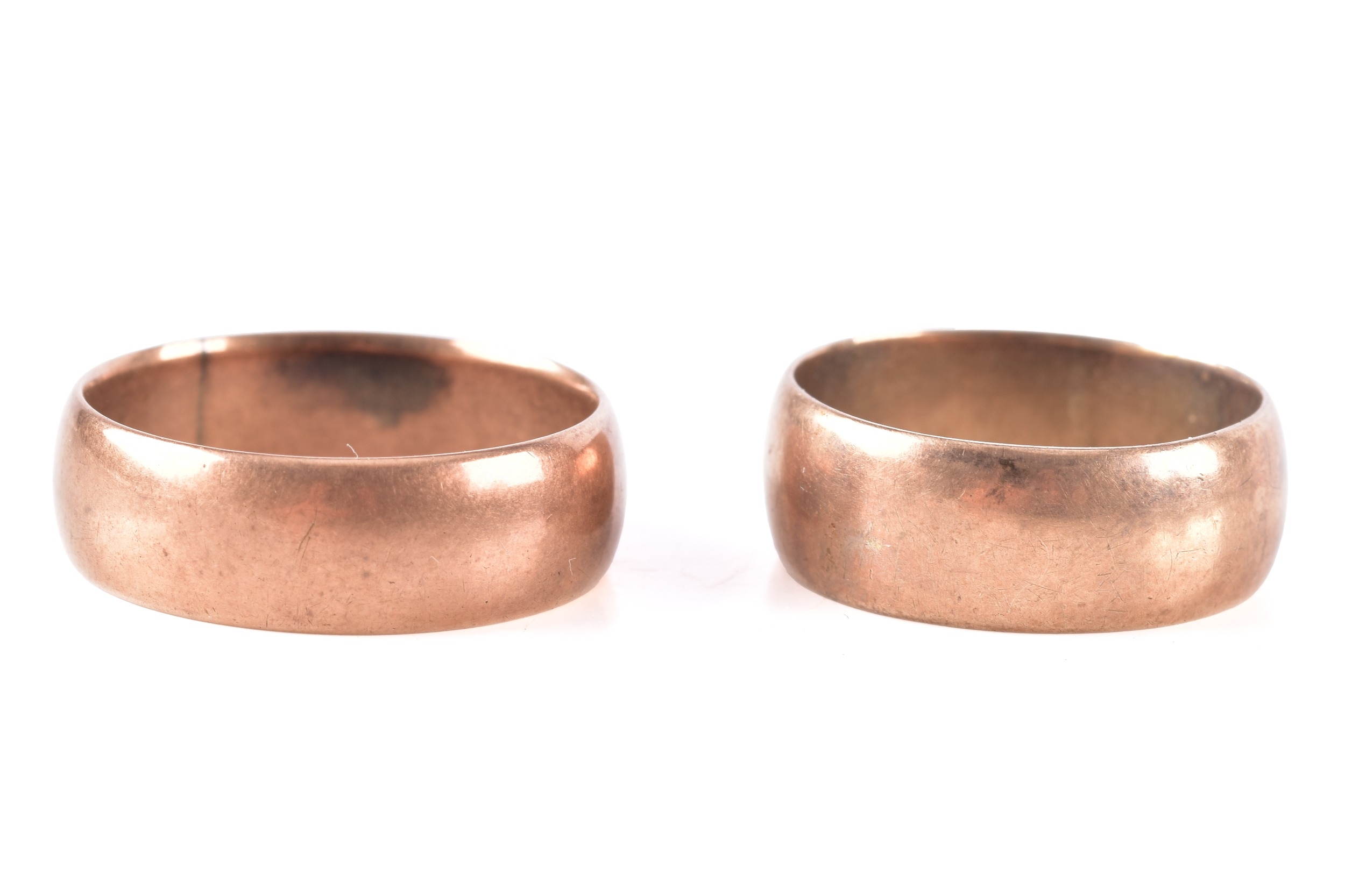 Two 9ct rose gold court shape wedding bands, one hallmarked for Glasgow 1917, 6.8 mm width, size K 1/2, the other hallmarked for Birmingham 1903, 6.3 mm width, size O 1/2. (2)