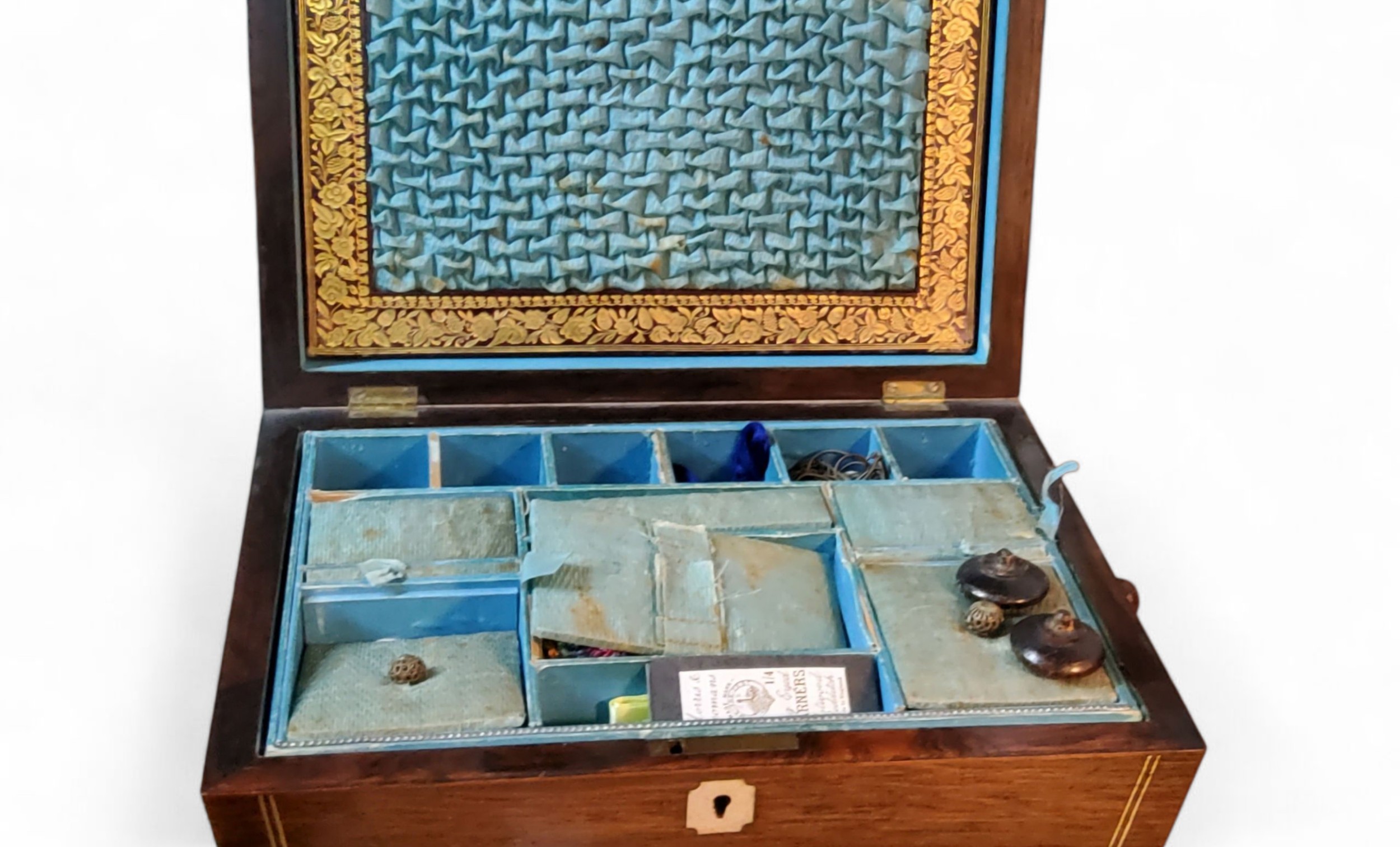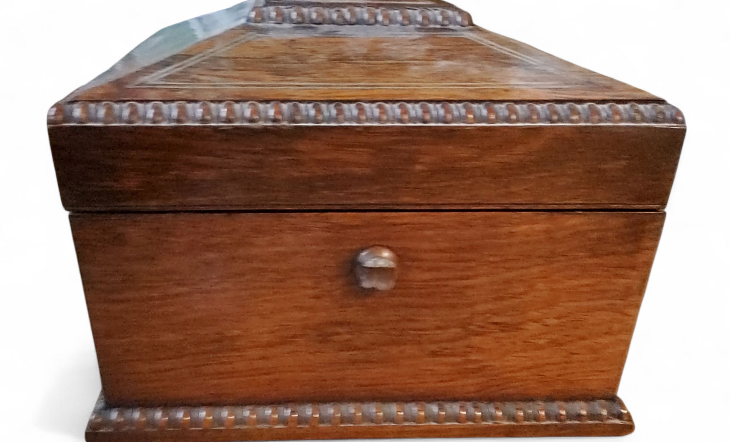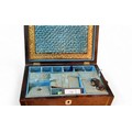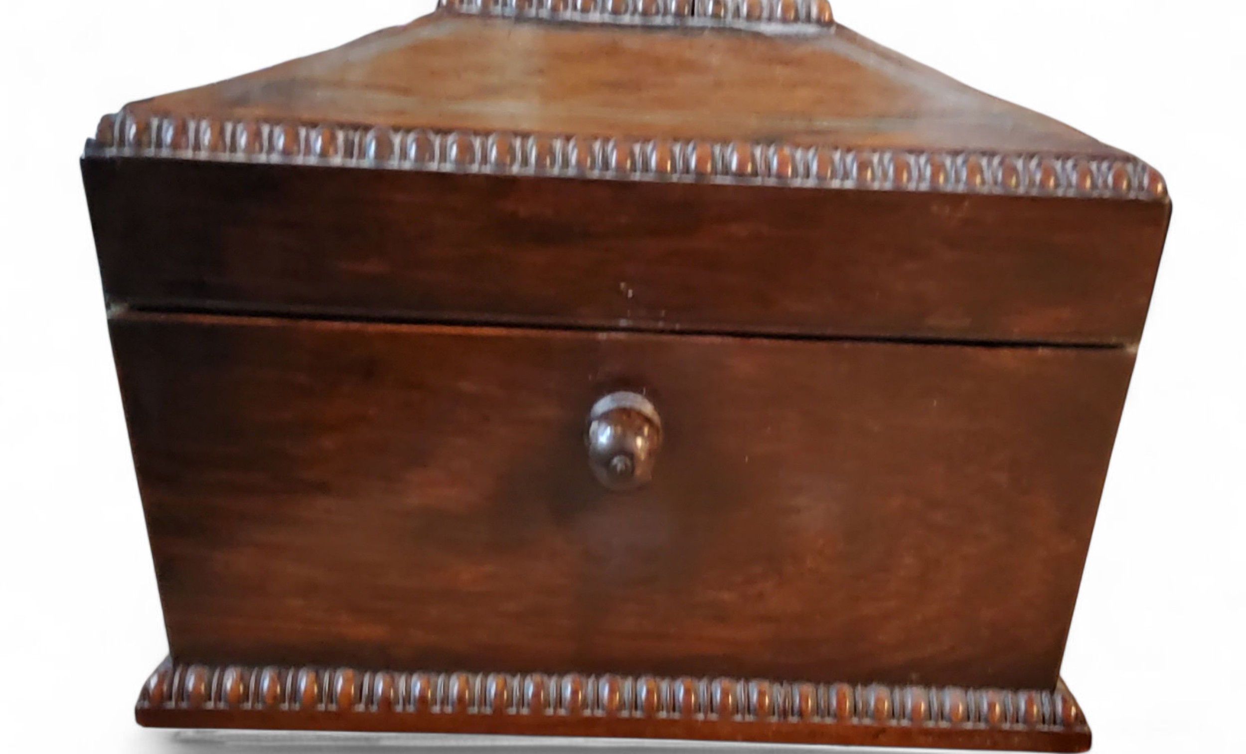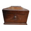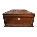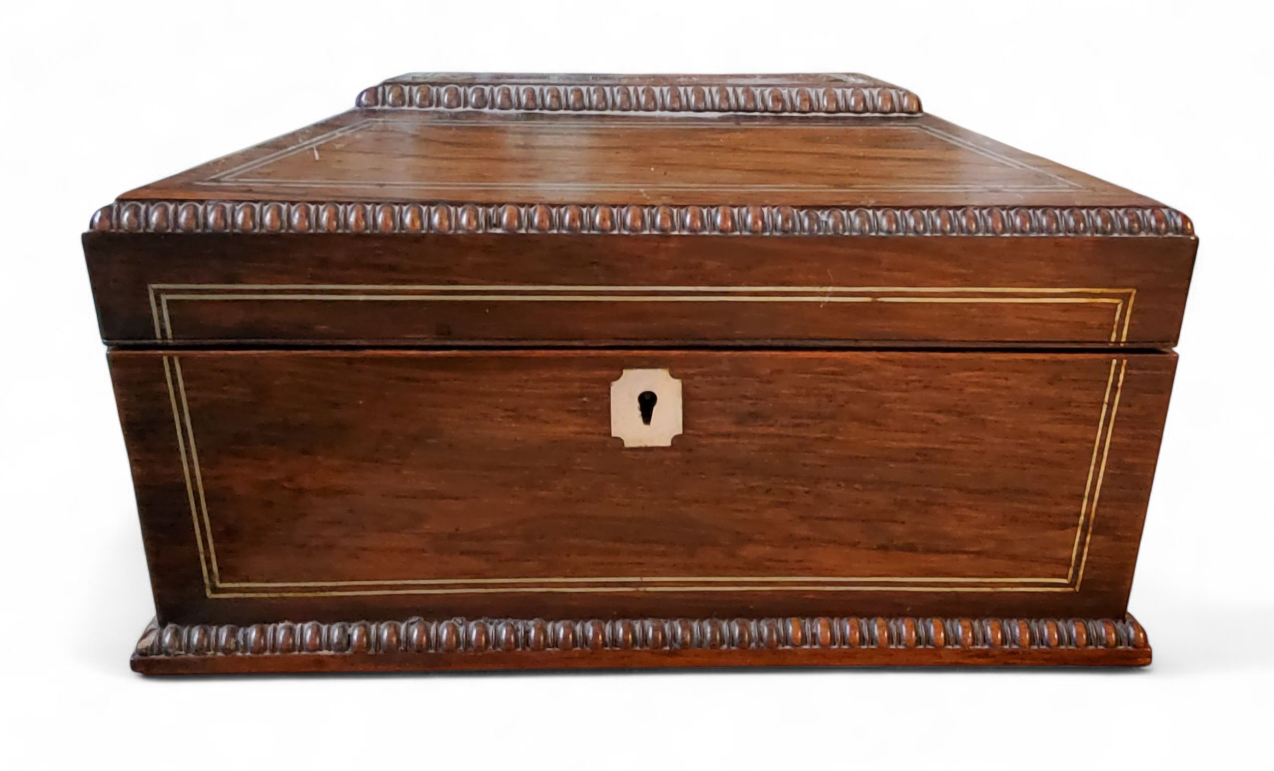 A Scottish 19th century rosewood sarcophagus work box, William Wilson George Street, Edinburgh, the cover with egg-and-dart tablet, centred with mother-of-pearl boss, the interior fitted, 17cm high, cm wide, c.1860