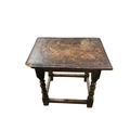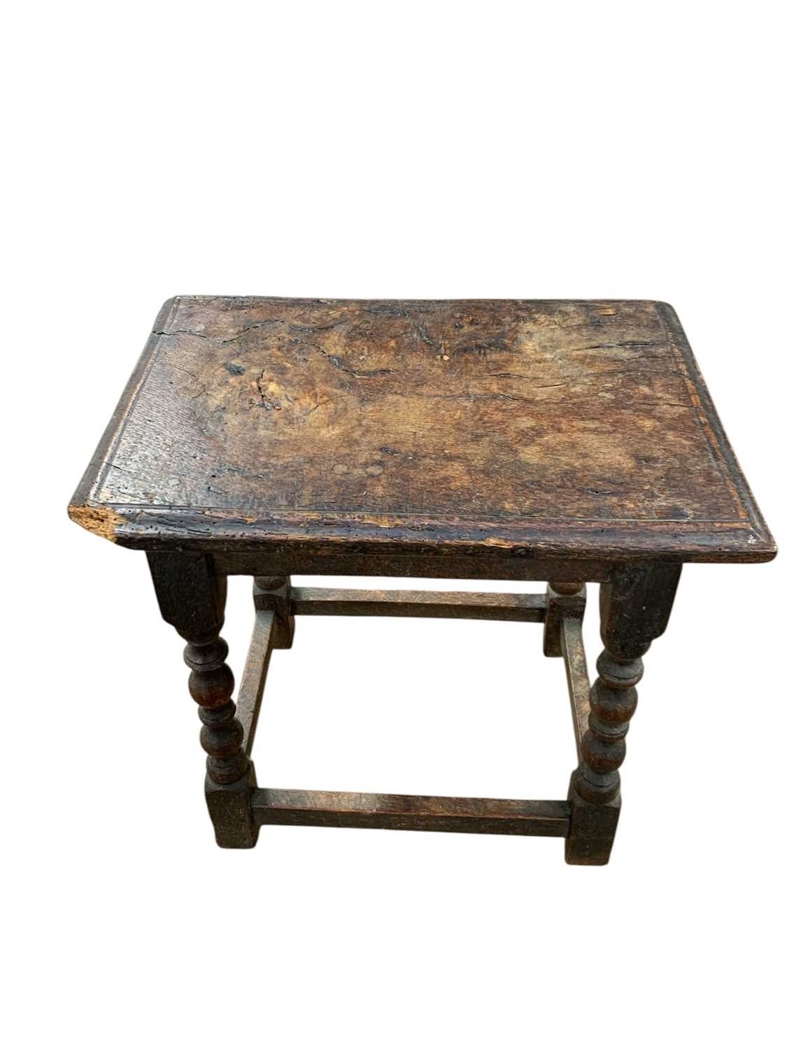 A 17th century oak joint stool. The figured top with a moulded edge and raised on reel and bobbin turned square section legs, height 48cm, width 46cm, depth 31.5cm.