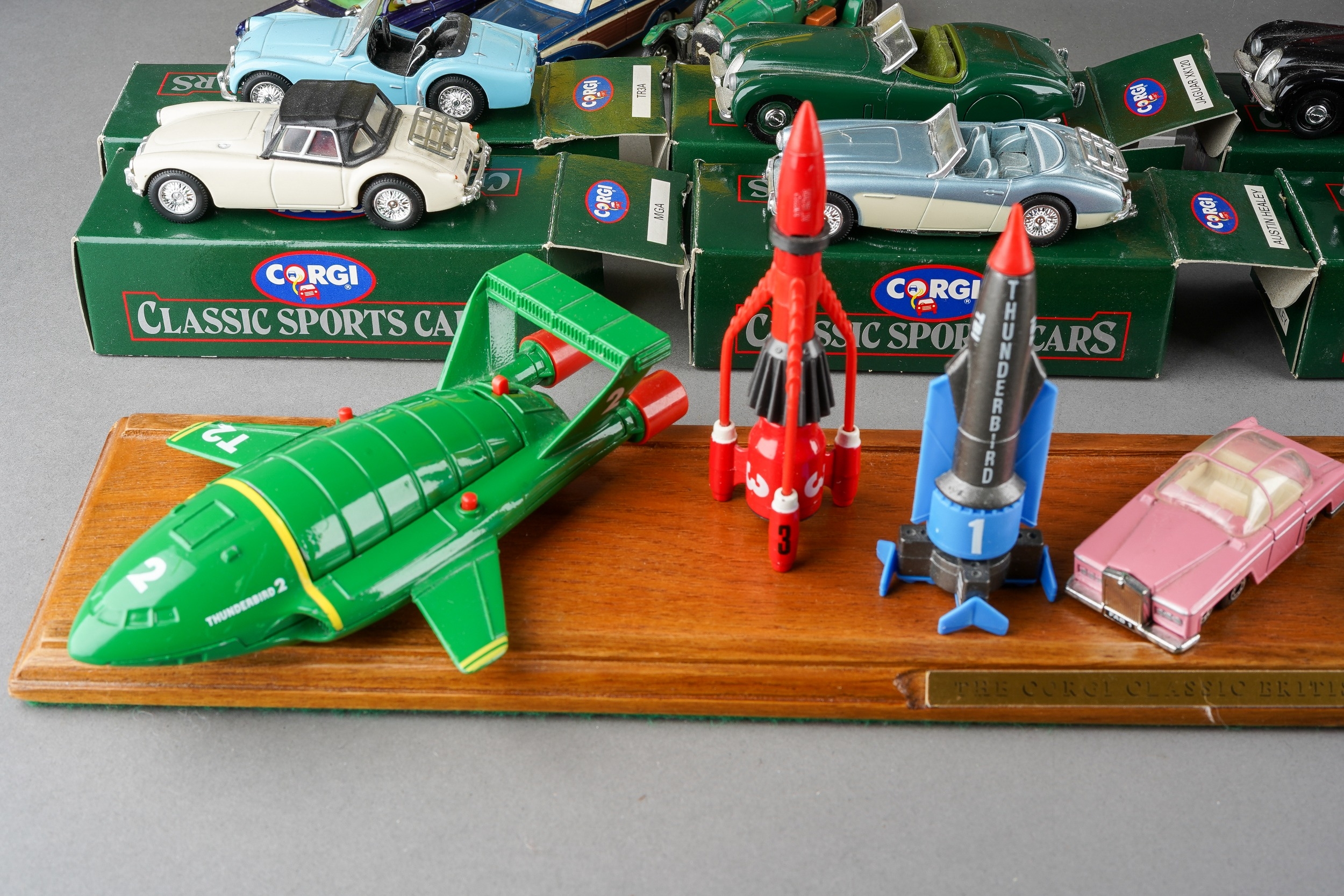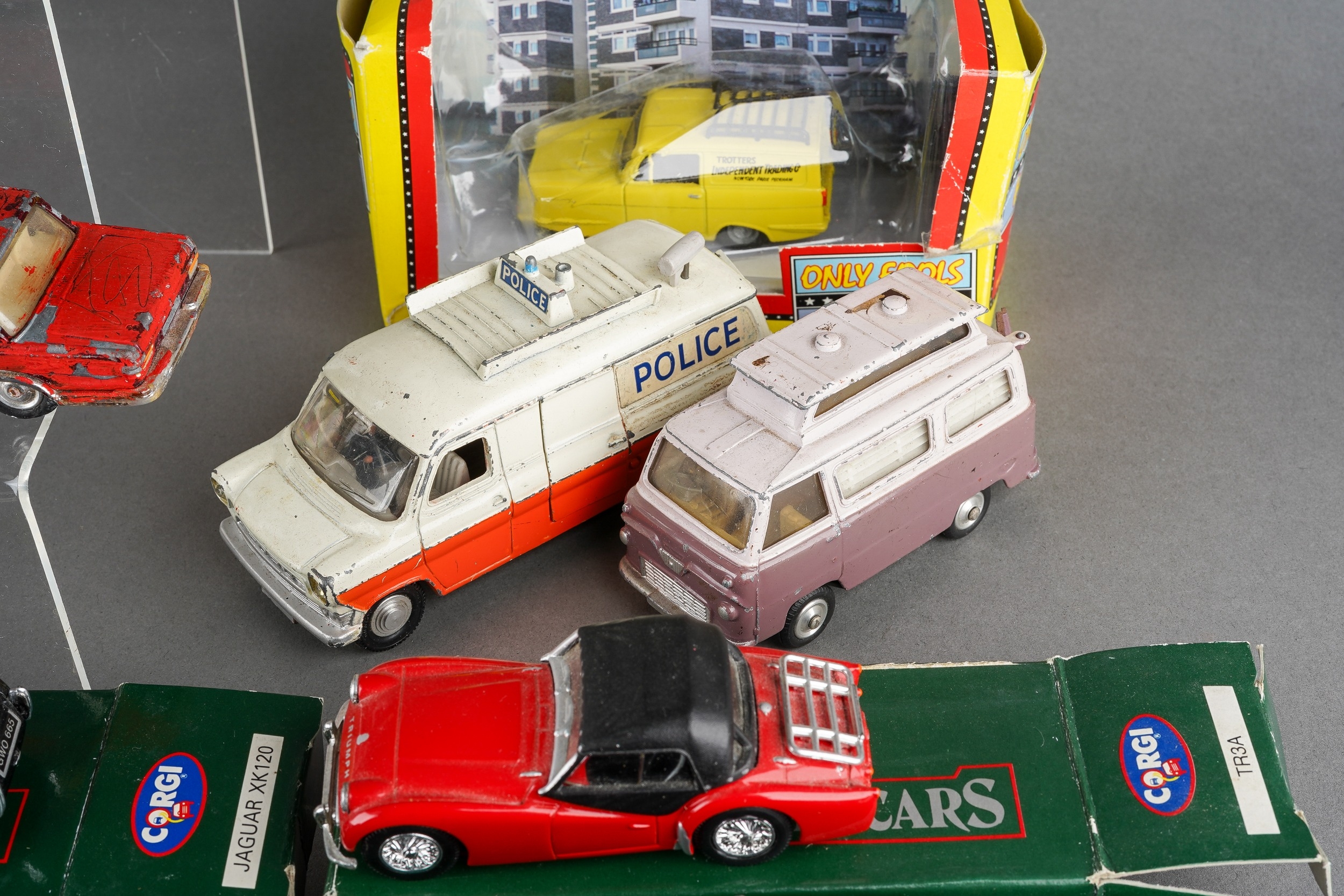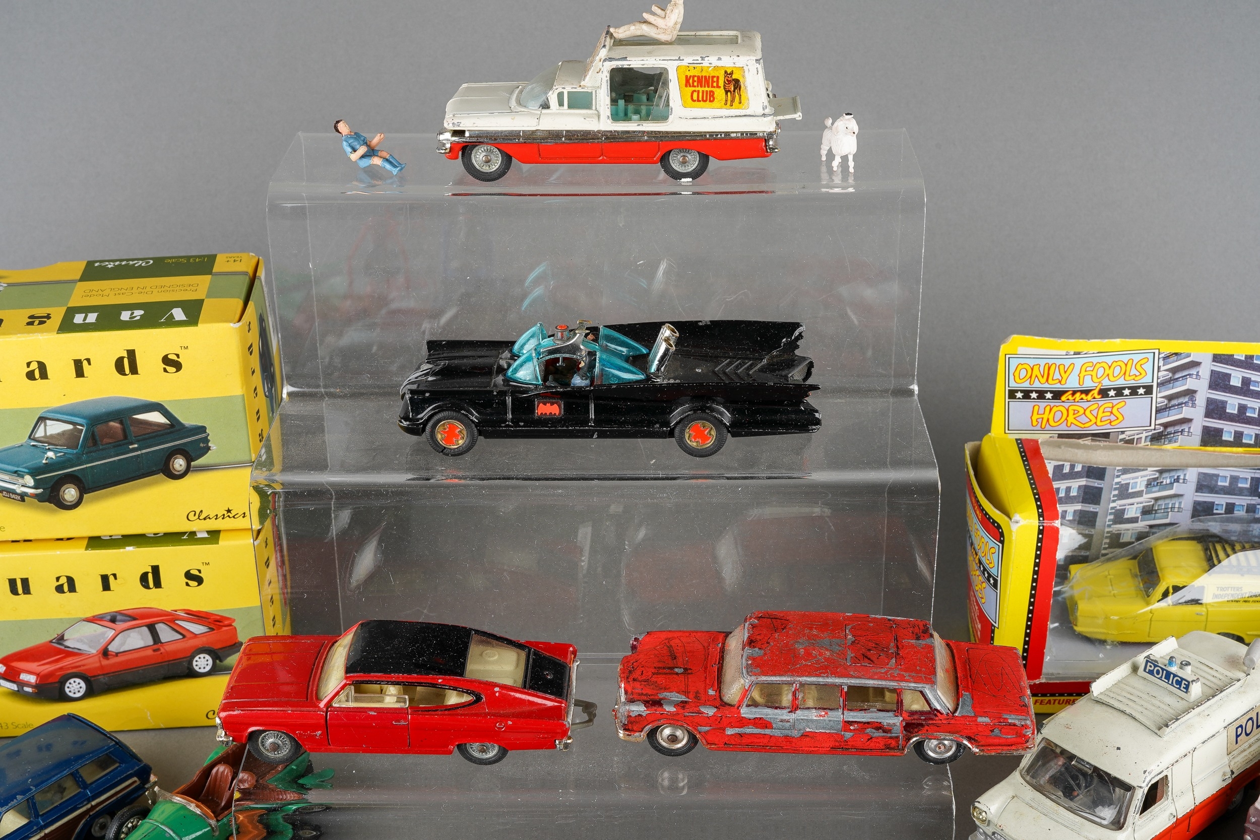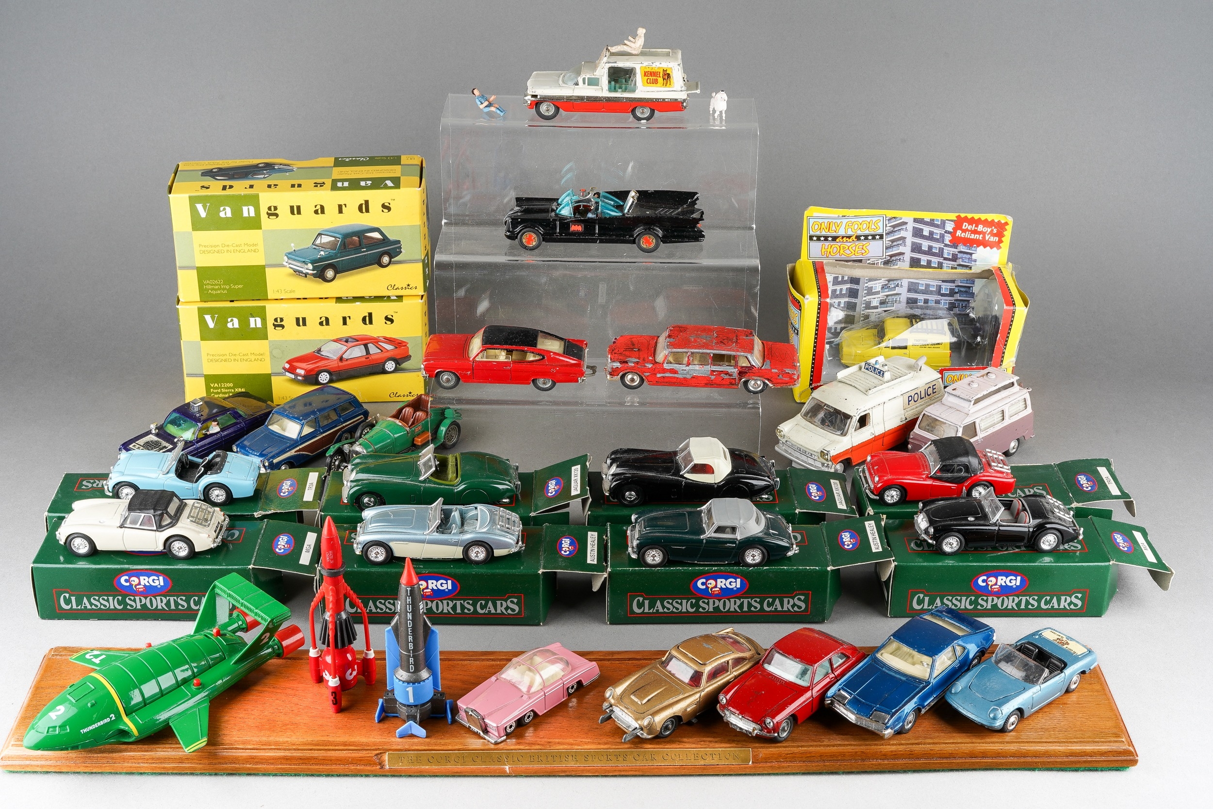 A collection of Dinky and Corgi playworn diecast model cars to include Merceded Benx 600 Pullman, Ford Tens Caravan, Oldsmobile Super 88, Chevrolet Impala, Ford Transit Van (Police), MG BGT, Ford Consul, James Bond Aston Martin DB5 in gold, Louts Elan S2, Marlin Rambler Fastback, together with Matchbox 1992 Thunderbird 2 plus Thunderbirds 1, 3 and 4 and Lady Penelope pink Rolls Royce , boxed British sports car collection MGA x2, Austin Healy x2, TR3A x2, Jaguar XK120 x2 - with wooden mount, Corgi Vanguards boxed x2, Only Fools and Horses Reliant Van, Batman and Robin batmobile from 1967 etc [1 Box - Q]