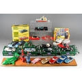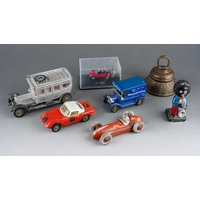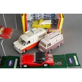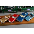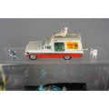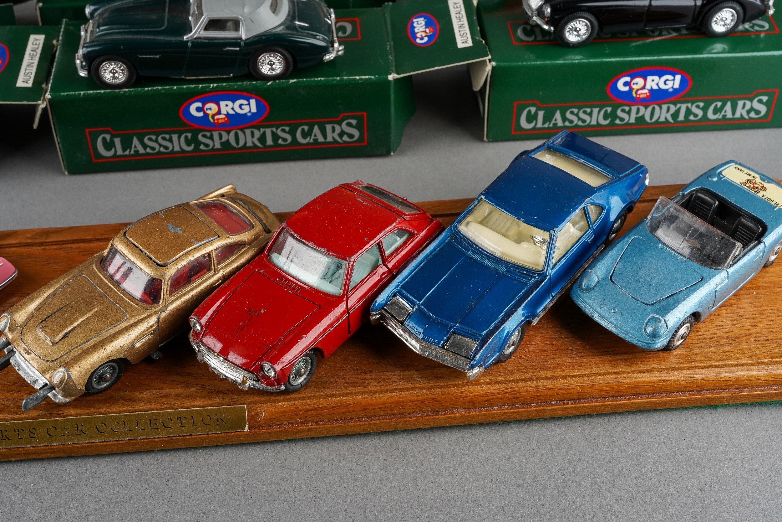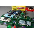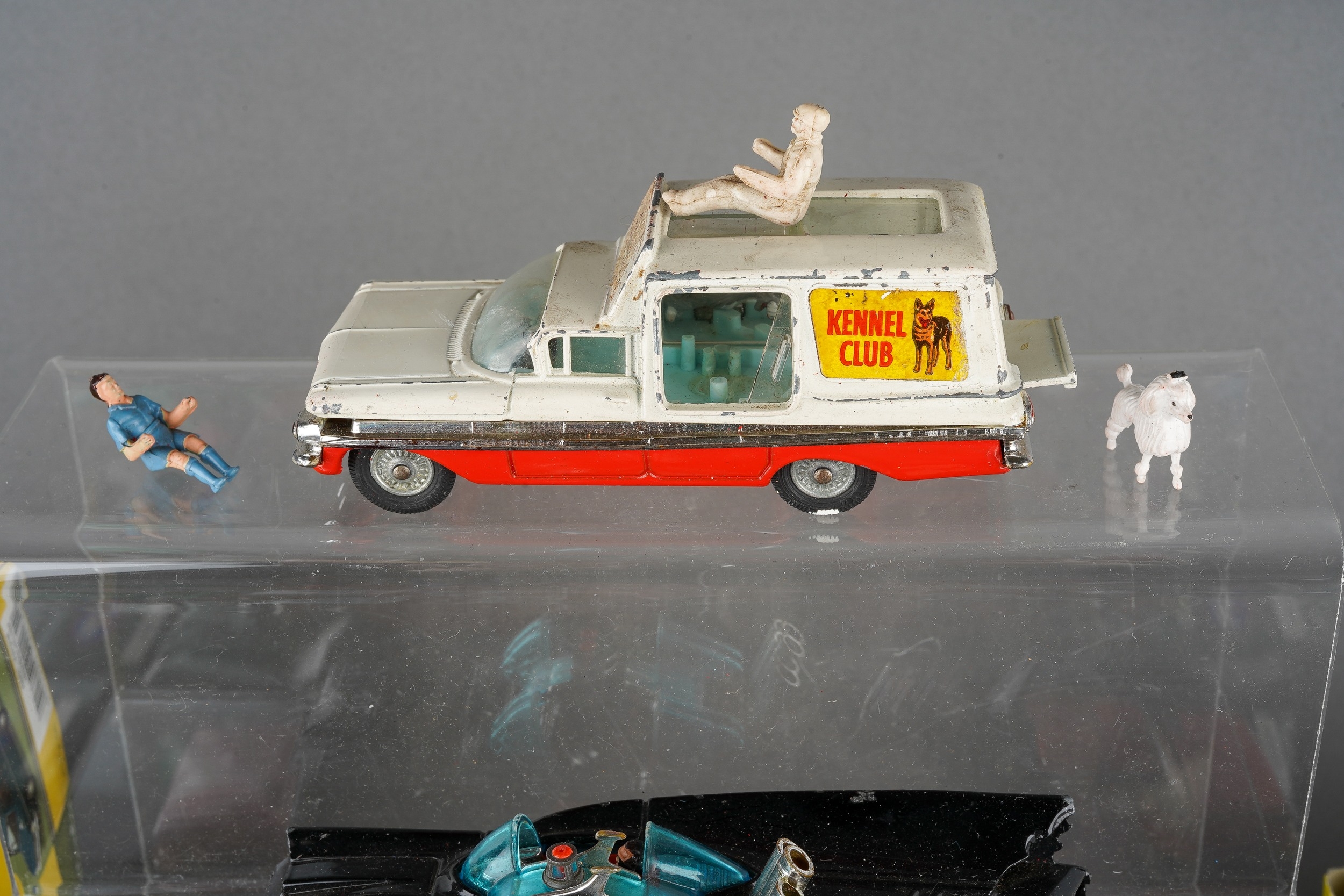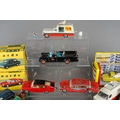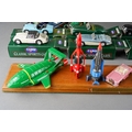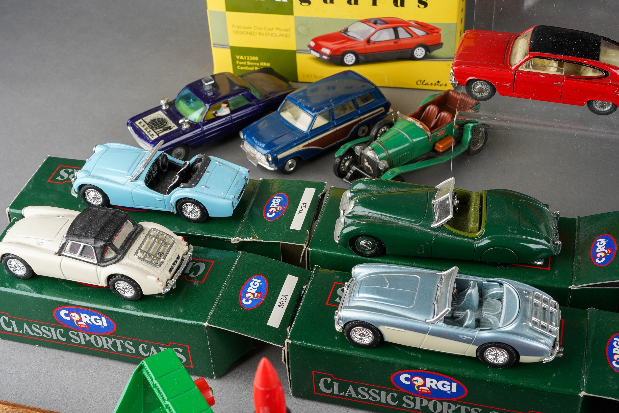 A collection of Dinky and Corgi playworn diecast model cars to include Merceded Benx 600 Pullman, Ford Tens Caravan, Oldsmobile Super 88, Chevrolet Impala, Ford Transit Van (Police), MG BGT, Ford Consul, James Bond Aston Martin DB5 in gold, Louts Elan S2, Marlin Rambler Fastback, together with Matchbox 1992 Thunderbird 2 plus Thunderbirds 1, 3 and 4 and Lady Penelope pink Rolls Royce , boxed British sports car collection MGA x2, Austin Healy x2, TR3A x2, Jaguar XK120 x2 - with wooden mount, Corgi Vanguards boxed x2, Only Fools and Horses Reliant Van, Batman and Robin batmobile from 1967 etc [1 Box - Q]