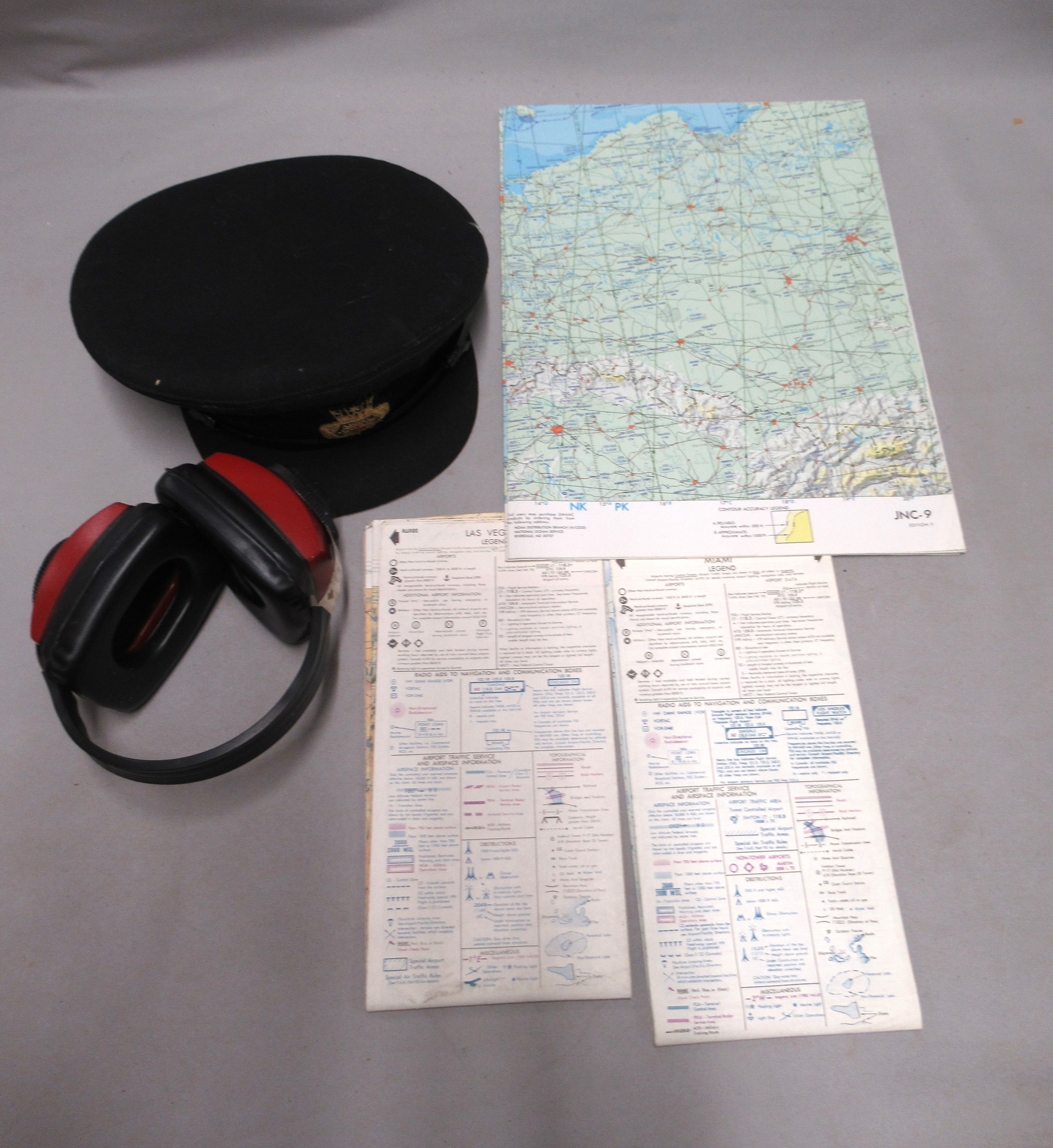 Pilot's cap, rank insignia, ear defenders and a quantity of aeronautical ephemera, including charts circa 1980s