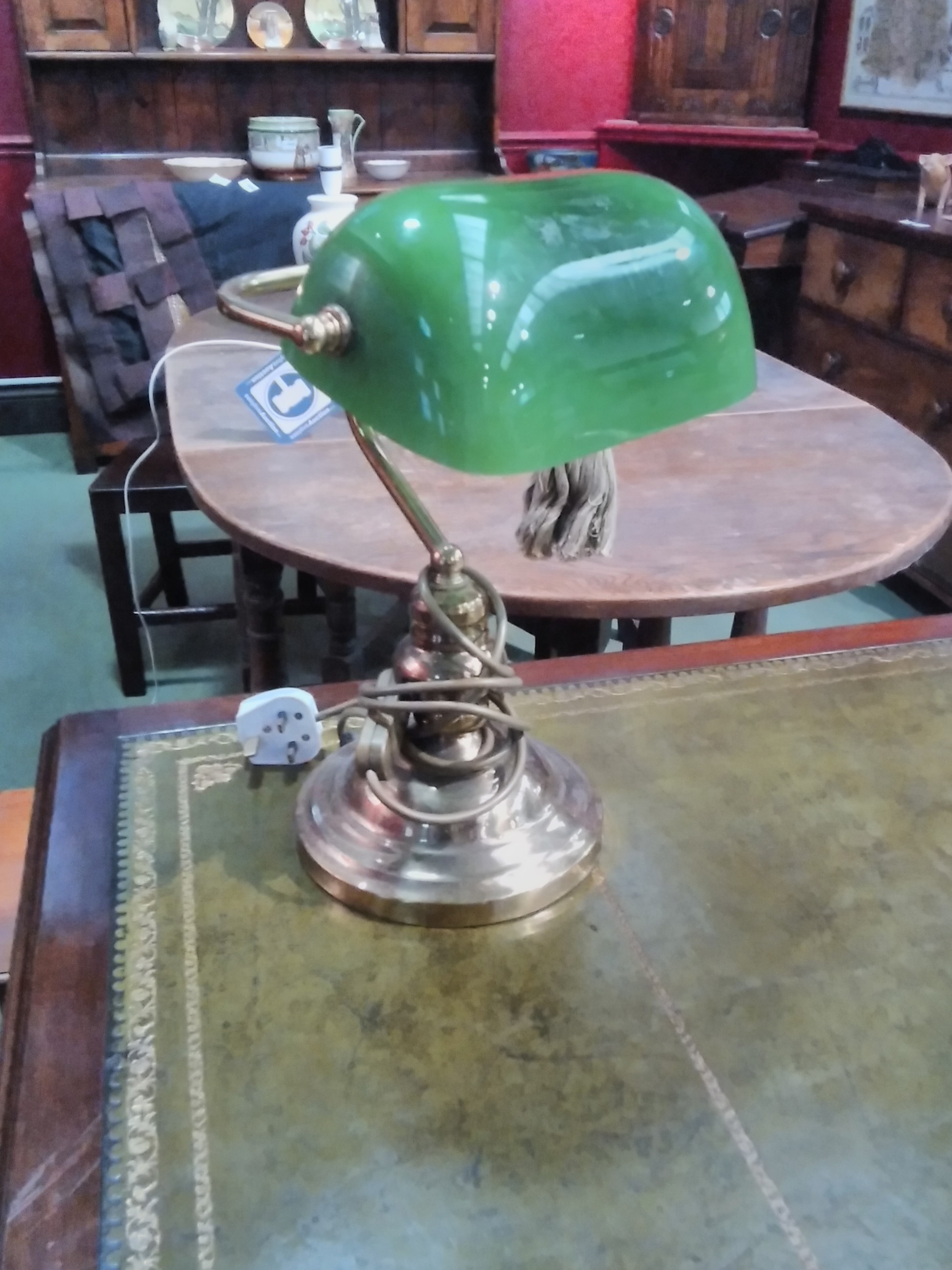 A brass based banker's lamp with green shade