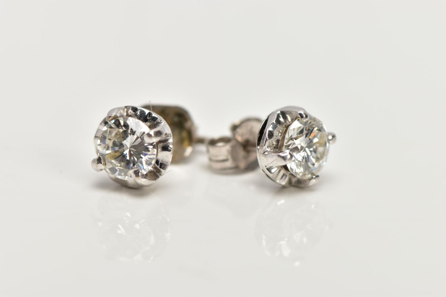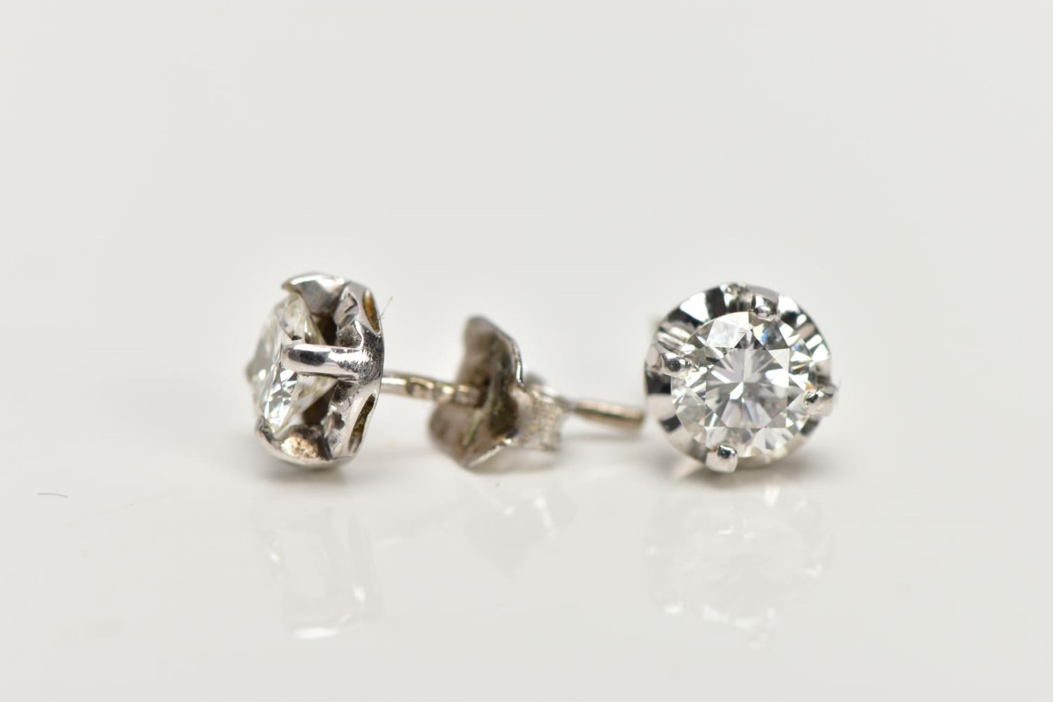 A PAIR OF 14CT WHITE GOLD DIAMOND STUD EARRINGS, each designed with a claw set round brilliant cut diamond, within an illusion setting, total estimated diamond weight 0.80cts, colour assessed as G-H, clarity assessed as VS2-SI1, post and scroll fittings, hallmarked 14ct gold Birmingham import, (one post slight misshapen at the end) approximate gross weight 1.4 grams (Condition report: overall condition good, general light wear, nice bright lively diamonds)