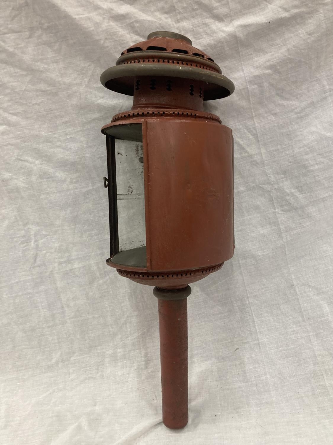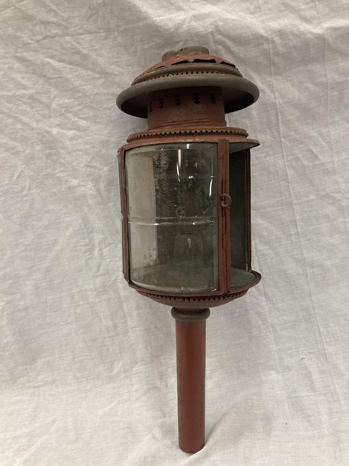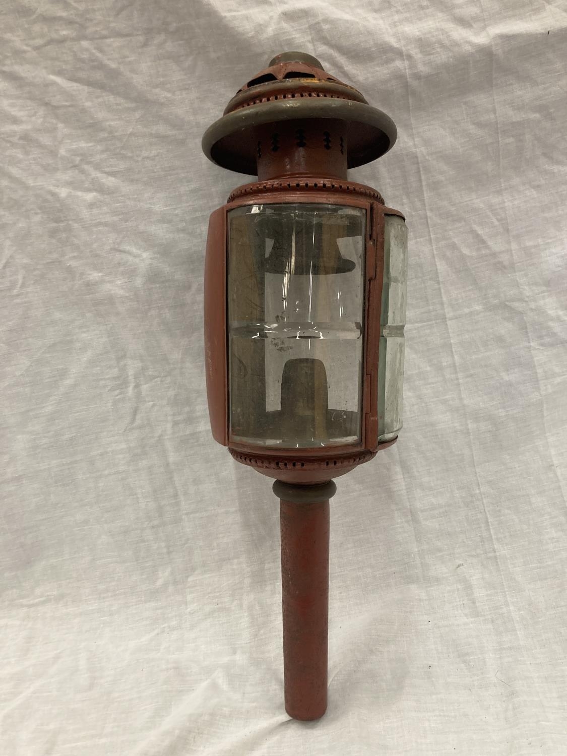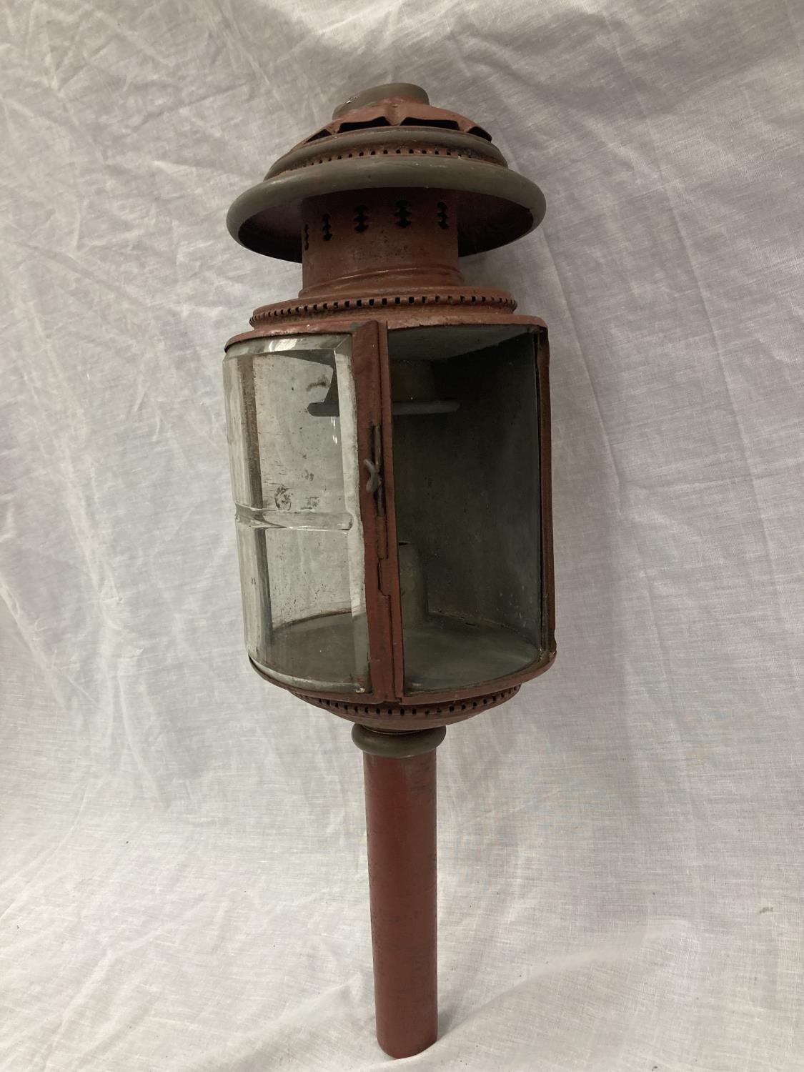 A VINTAGE COACHING LAMP WITH BEVELLED GLASS - MISSING ONE GLASS PANEL HEIGHT APPROX 52CM
