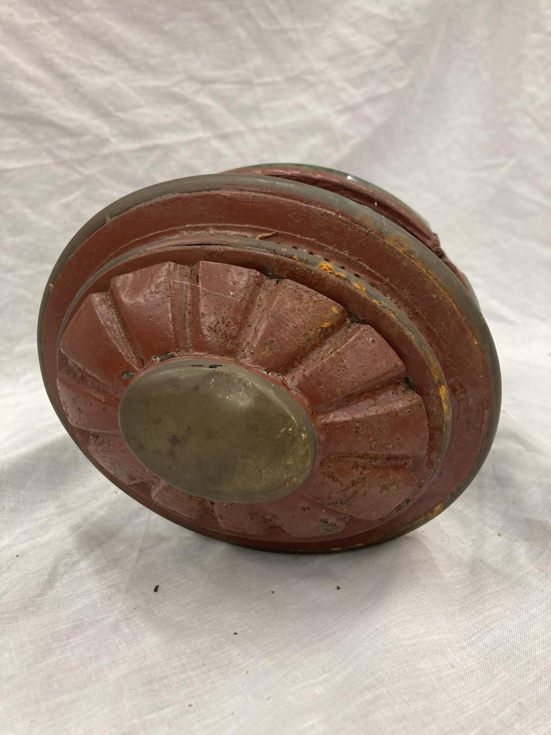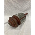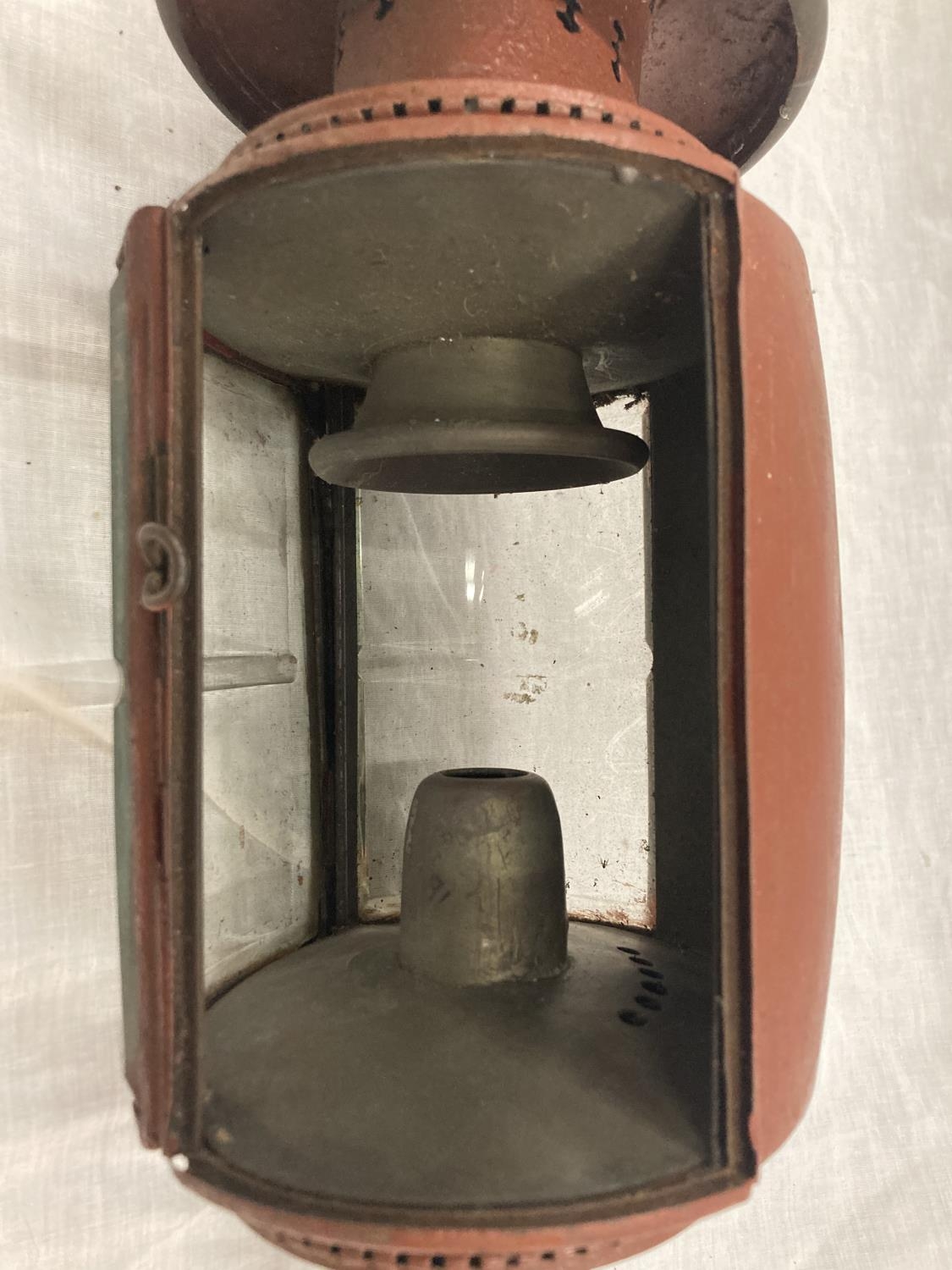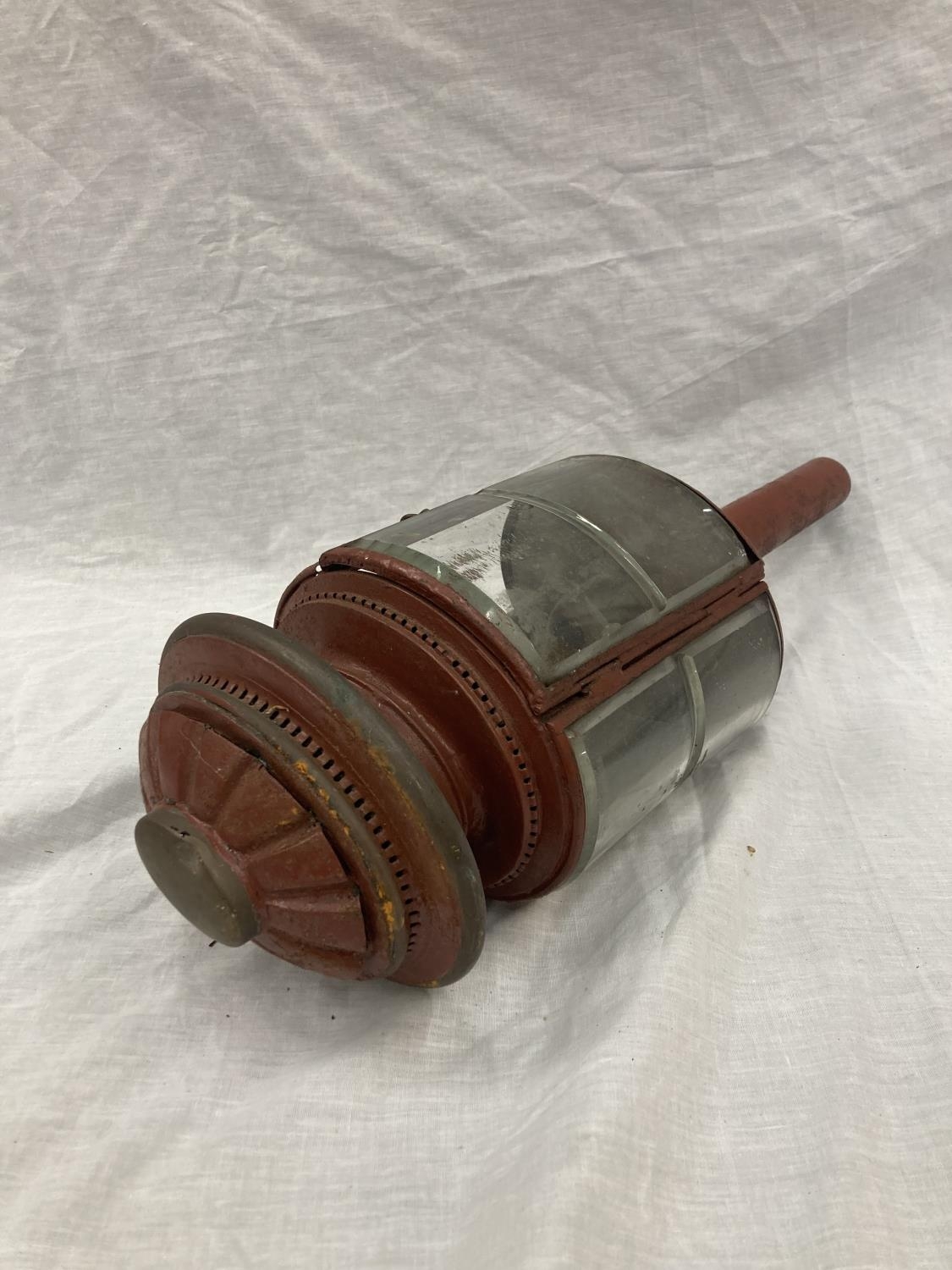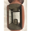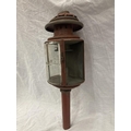 A VINTAGE COACHING LAMP WITH BEVELLED GLASS - MISSING ONE GLASS PANEL HEIGHT APPROX 52CM