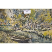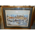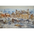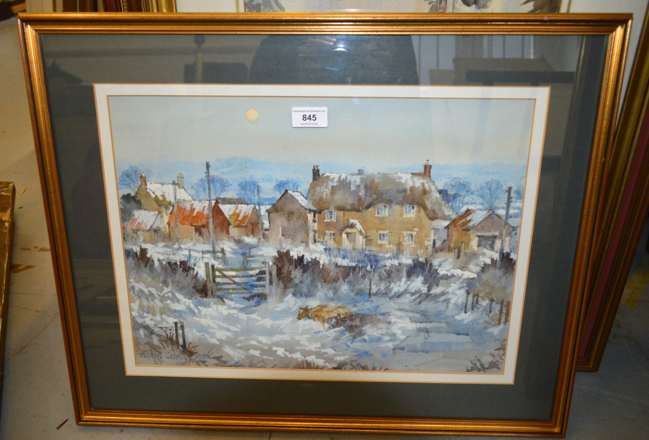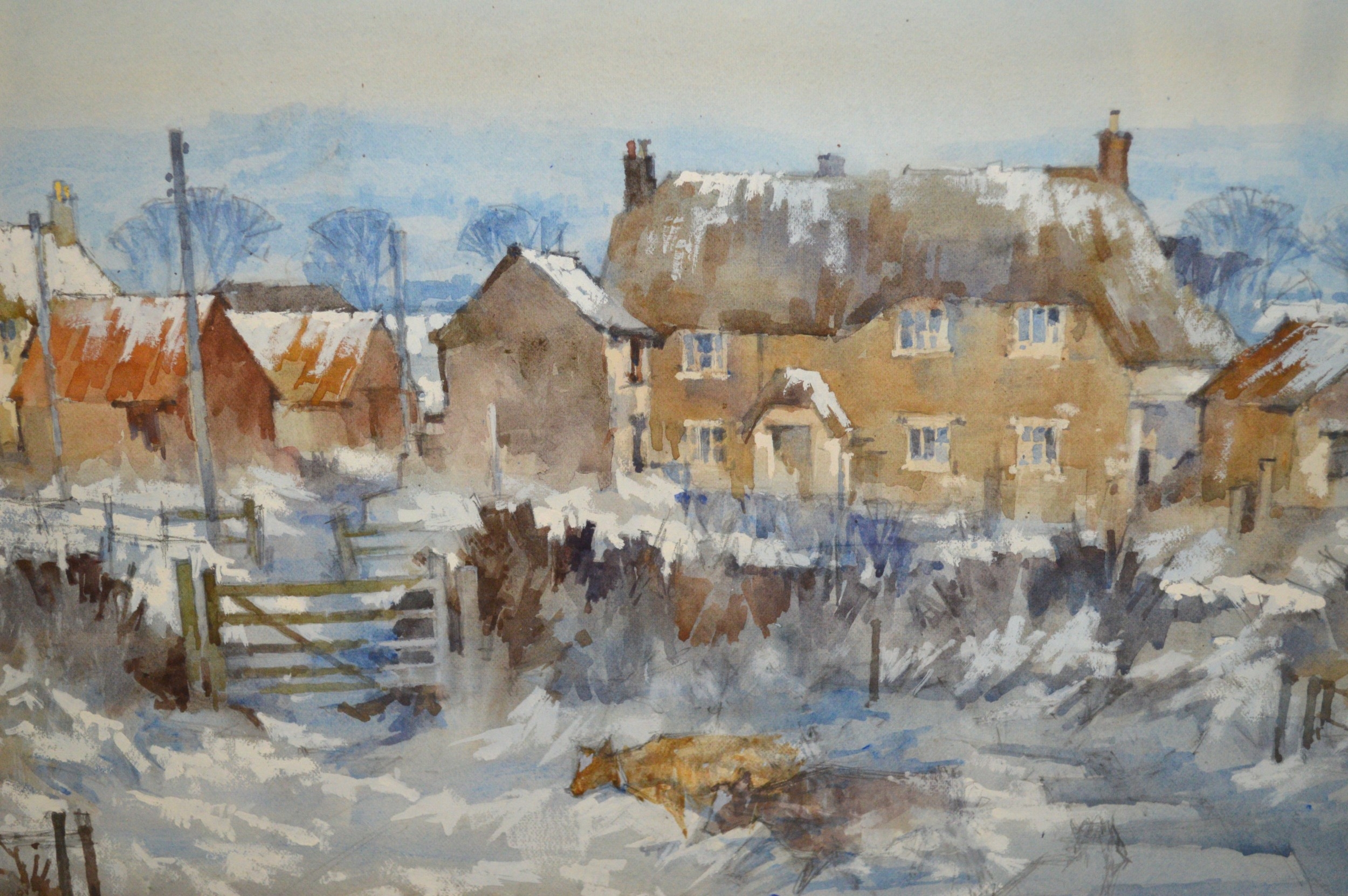 Michael Cadman, watercolour, winter landscape with cottages and cattle, signed, 33 x 45cm, gilt framed