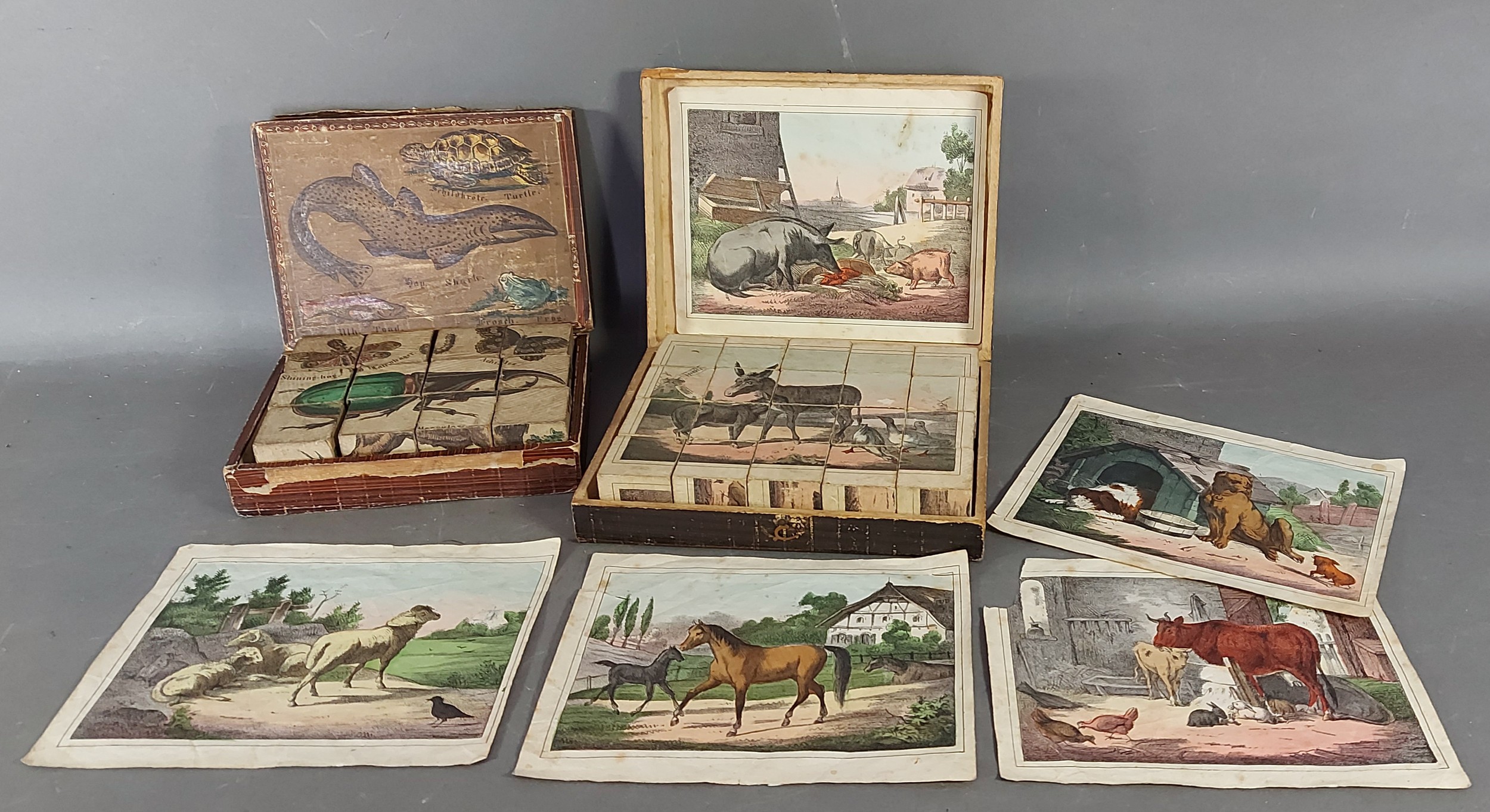 A Victorian block Jigsaw puzzle depicting Natural History with insects and sea creatures together with another similar depicting Farm scenes