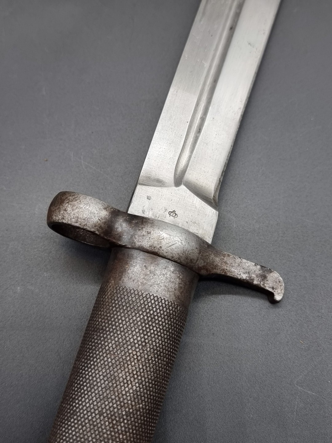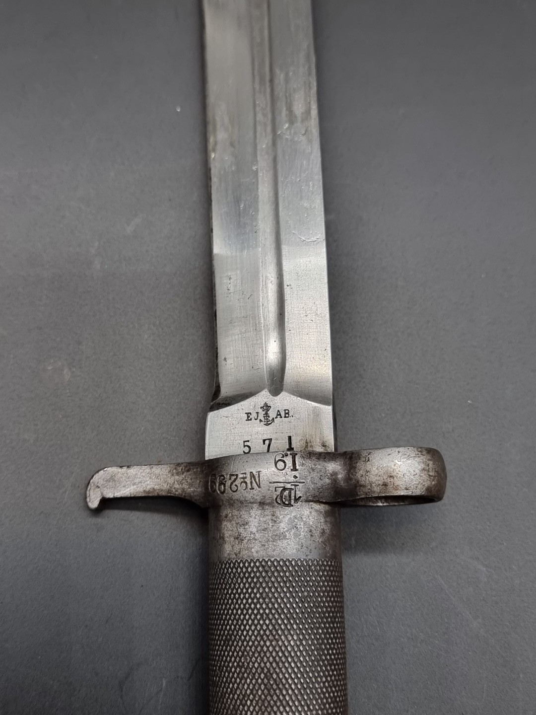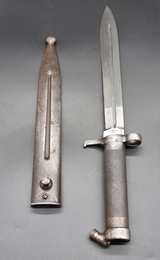 A Swedish M1896 Mauser bayonet and scabbard, having 21cm blade, marked to ricasso E.J A.B. for Eskilstuna Jenmanufakur, and numbered 571.