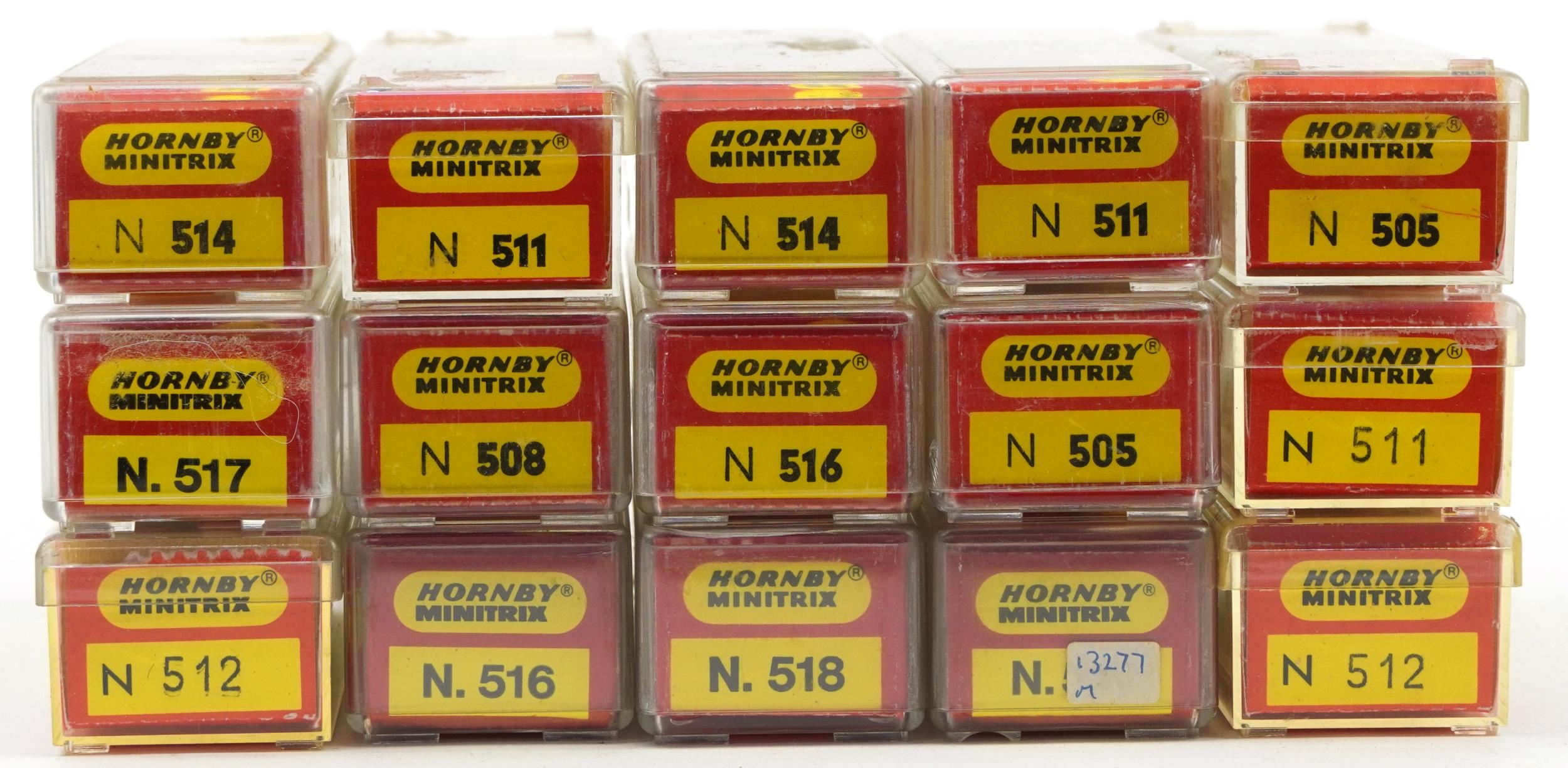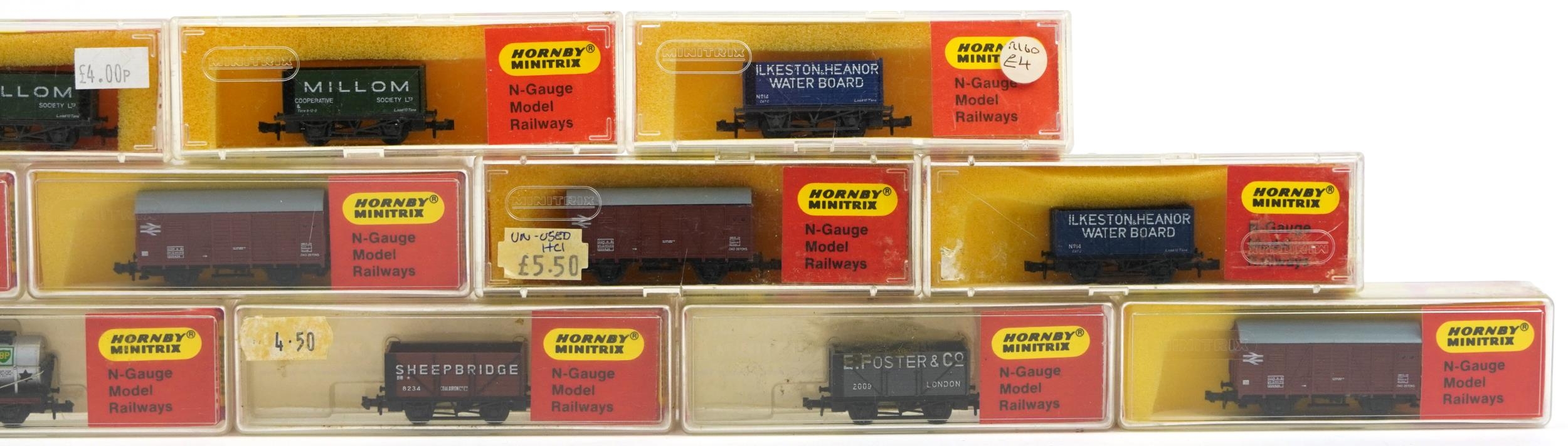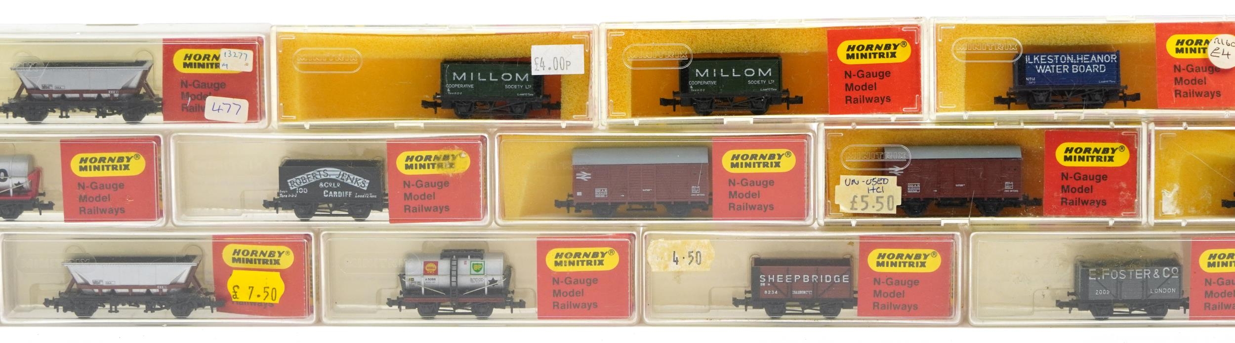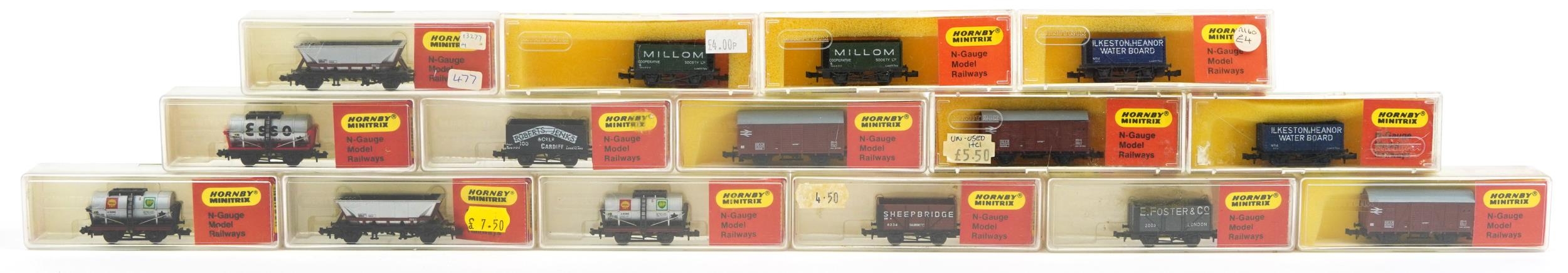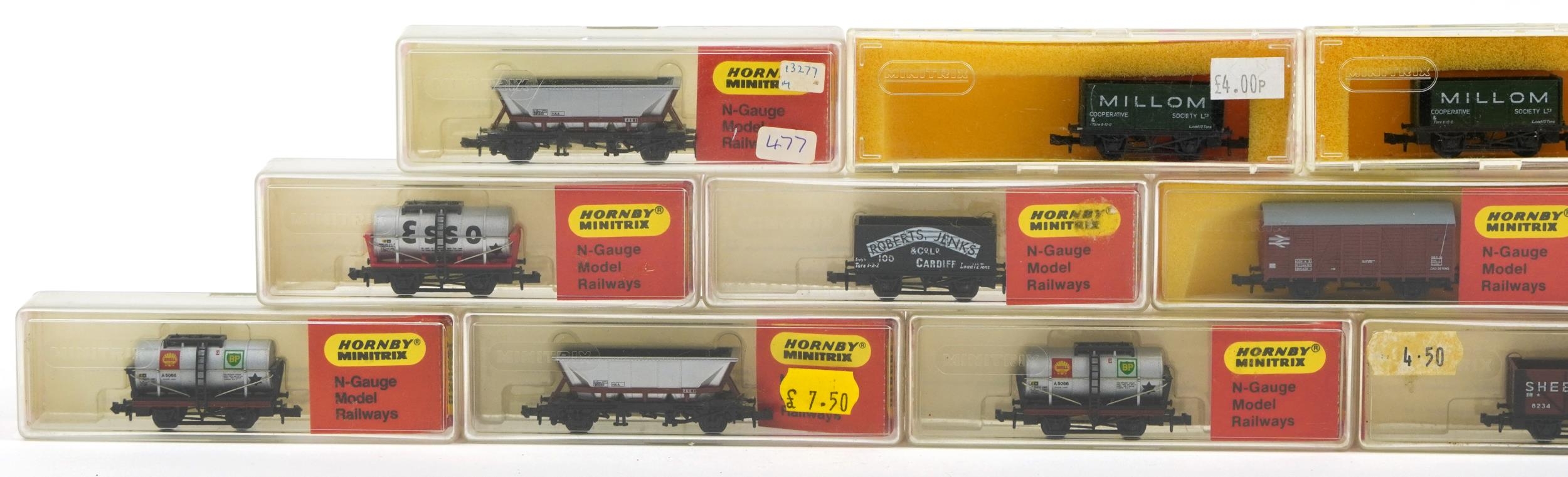 Fifteen Hornby Minitrix N gauge model railway tankers and wagons with cases