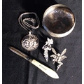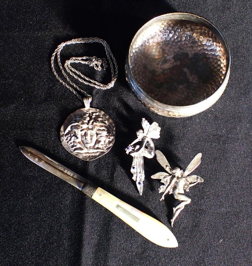 A VICTORIAN SILVER BLADED FRUIT KNIFE with mother of pearl handle, the silver by A&N, Sheffield 1898, 8.5cm long (closed), an Elizabeth II silver Medusa pendant by PAN, London 1979, a 925 silver Fairy brooch with blue cabochons, a similar white metal ditto and a planished silver lid