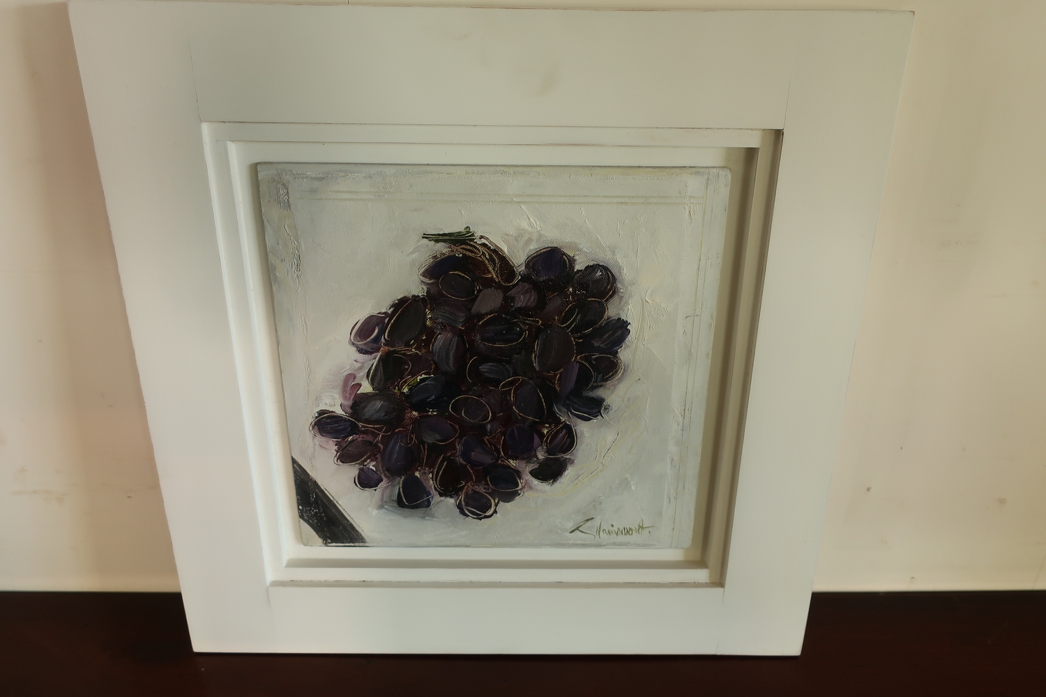 Modern contemporary artwork oil on board entitled "Grapes 2009" signed George Hainsworth (50cm x 50cm including frame and mount)
