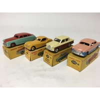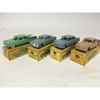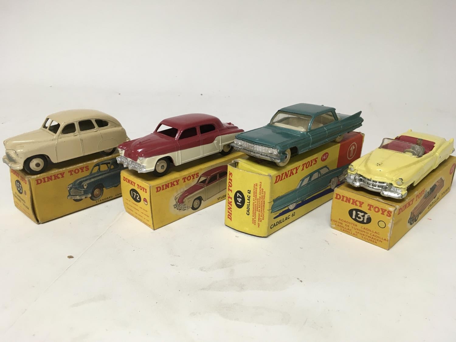Dinky toys, #153 Standard Vanguard saloon, #172 Studebaker land cruiser, #147 Cadillac 62 and #131 Cadillac tourer, boxed