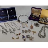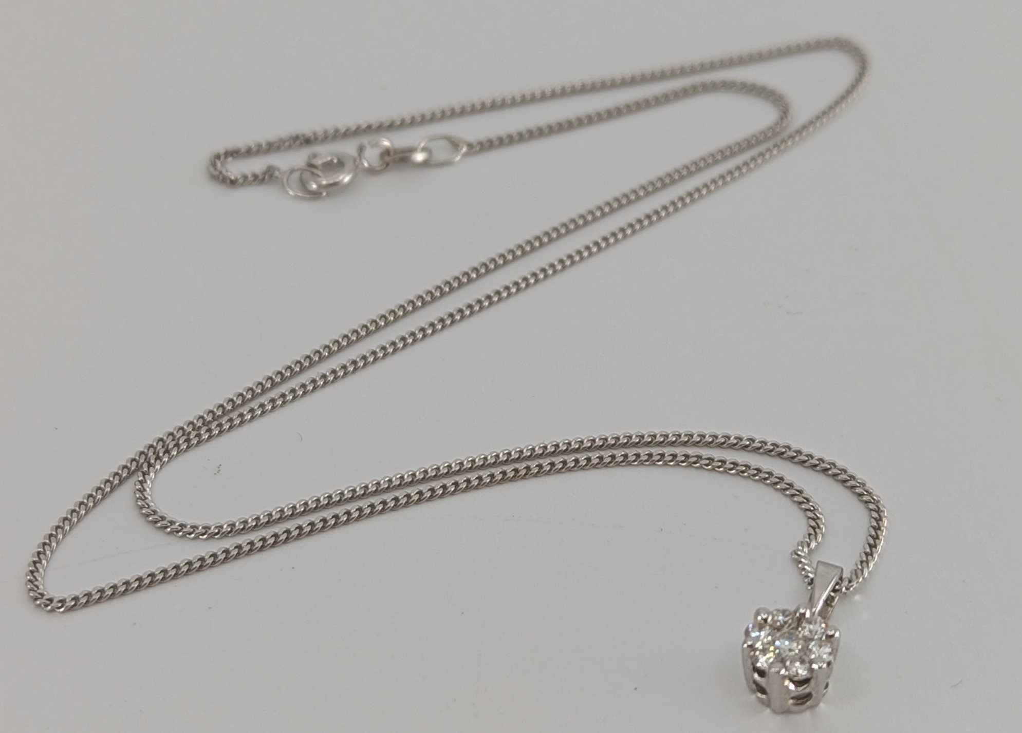 An 18ct white gold diamond cluster pendant with 18ct white gold fine curb link chain and a spare 18ct white gold fine curb link chain,