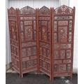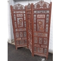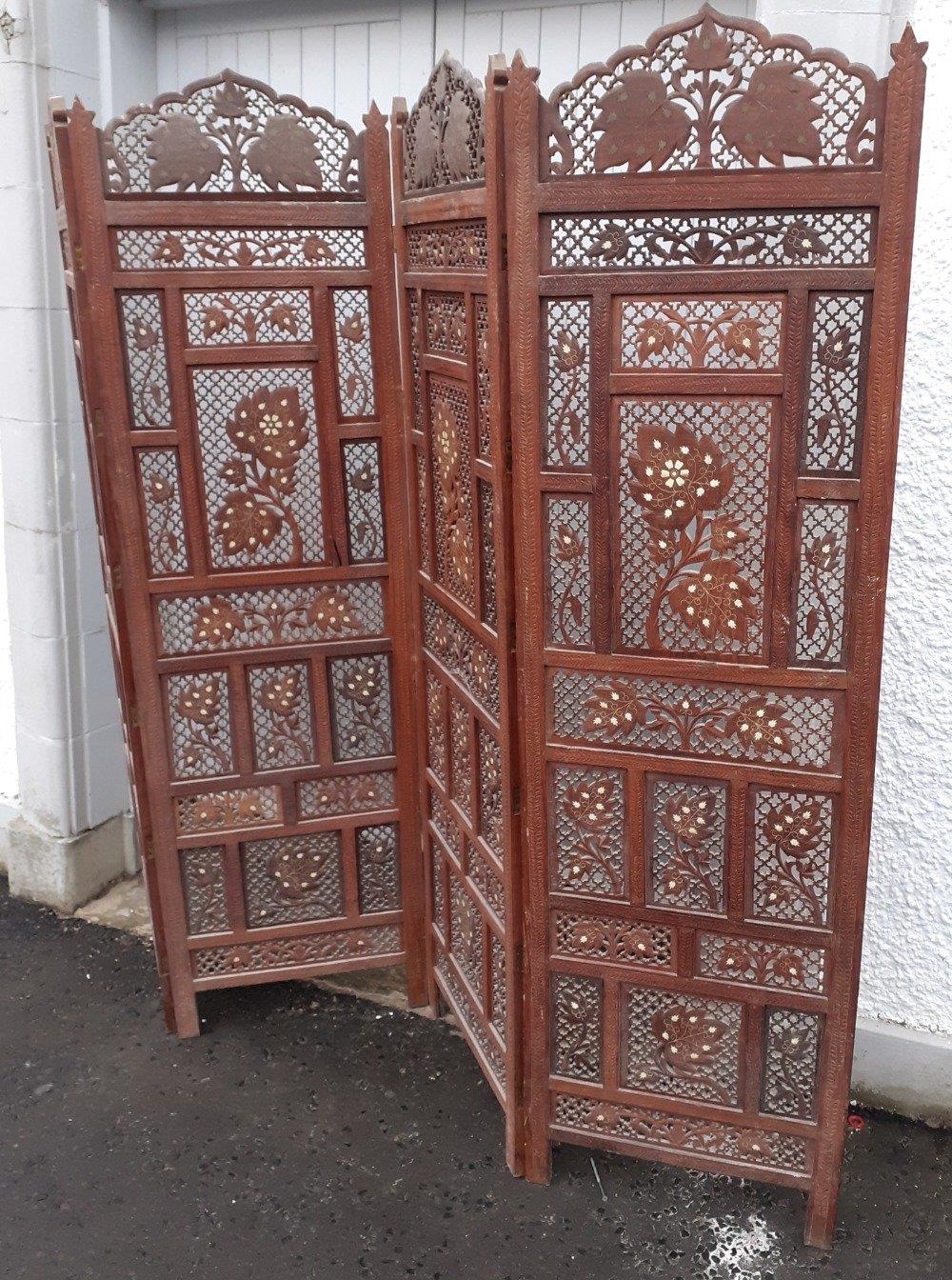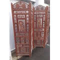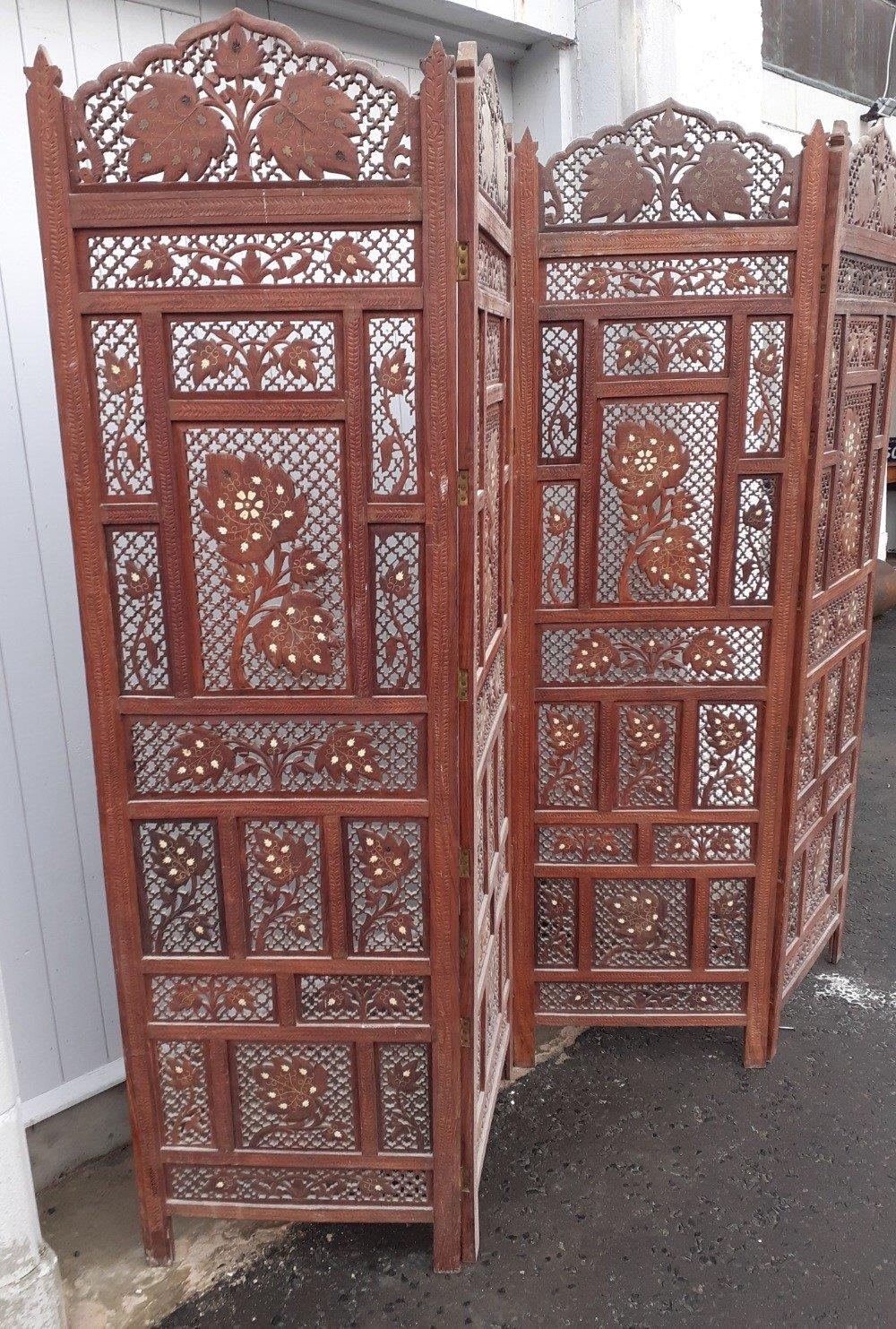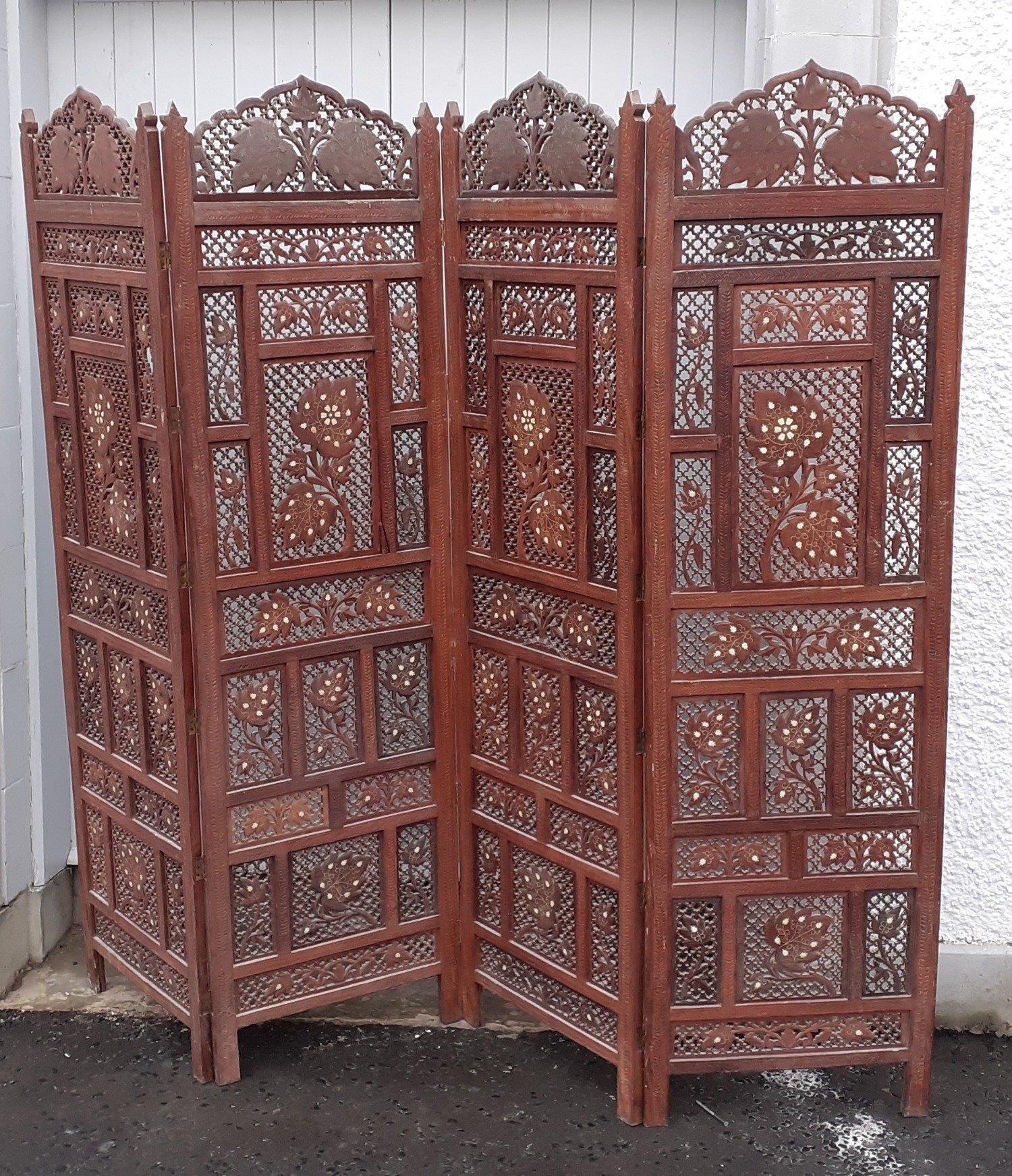 BEAUTIFUL!! An Oriental four part room screen in lovely condition with inset white wood accented floral designs. Measures 6ft tall and each panel is 52cm wide approx. A very attractive screen.
