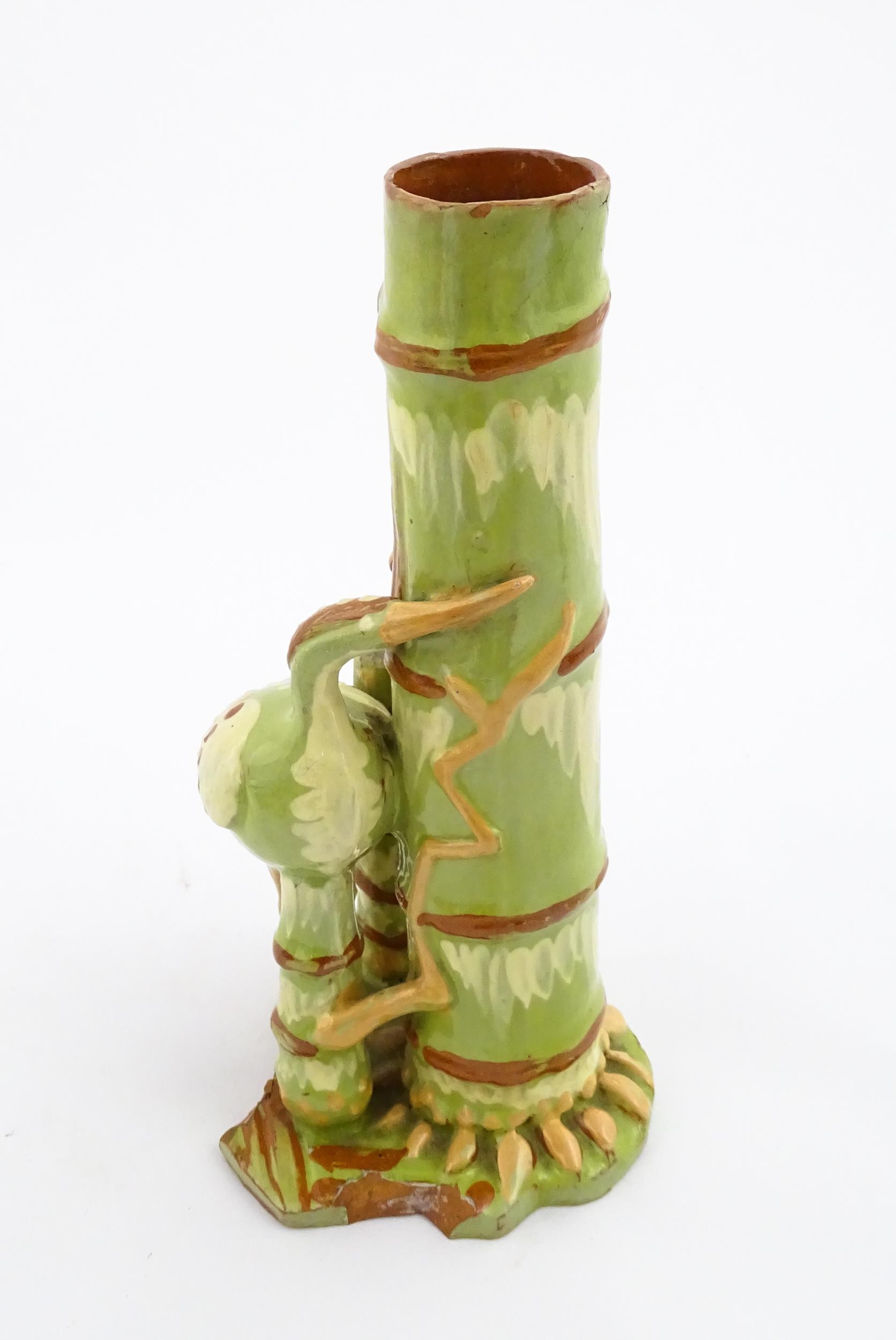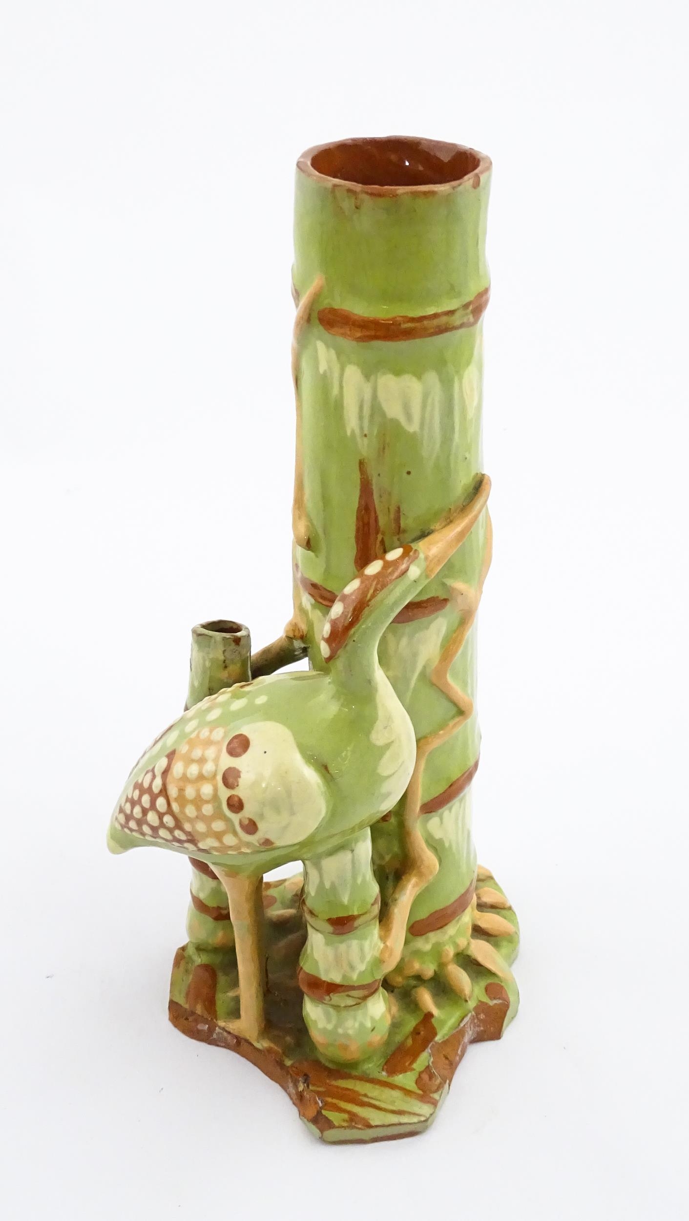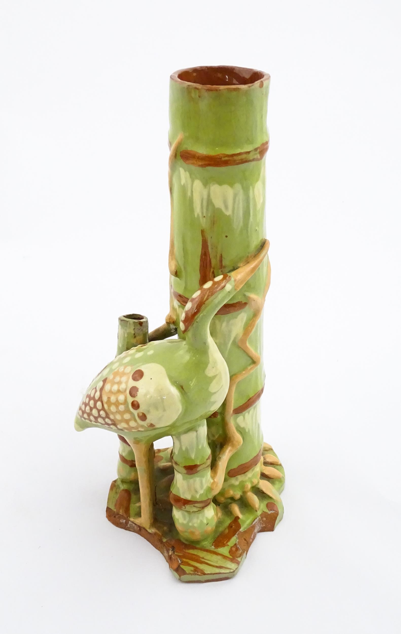 A C. H. Brannam Barum art pottery spill vase of bamboo form with heron bird detail. Signed and dated 1896 under. Approx. 9 1/2" high