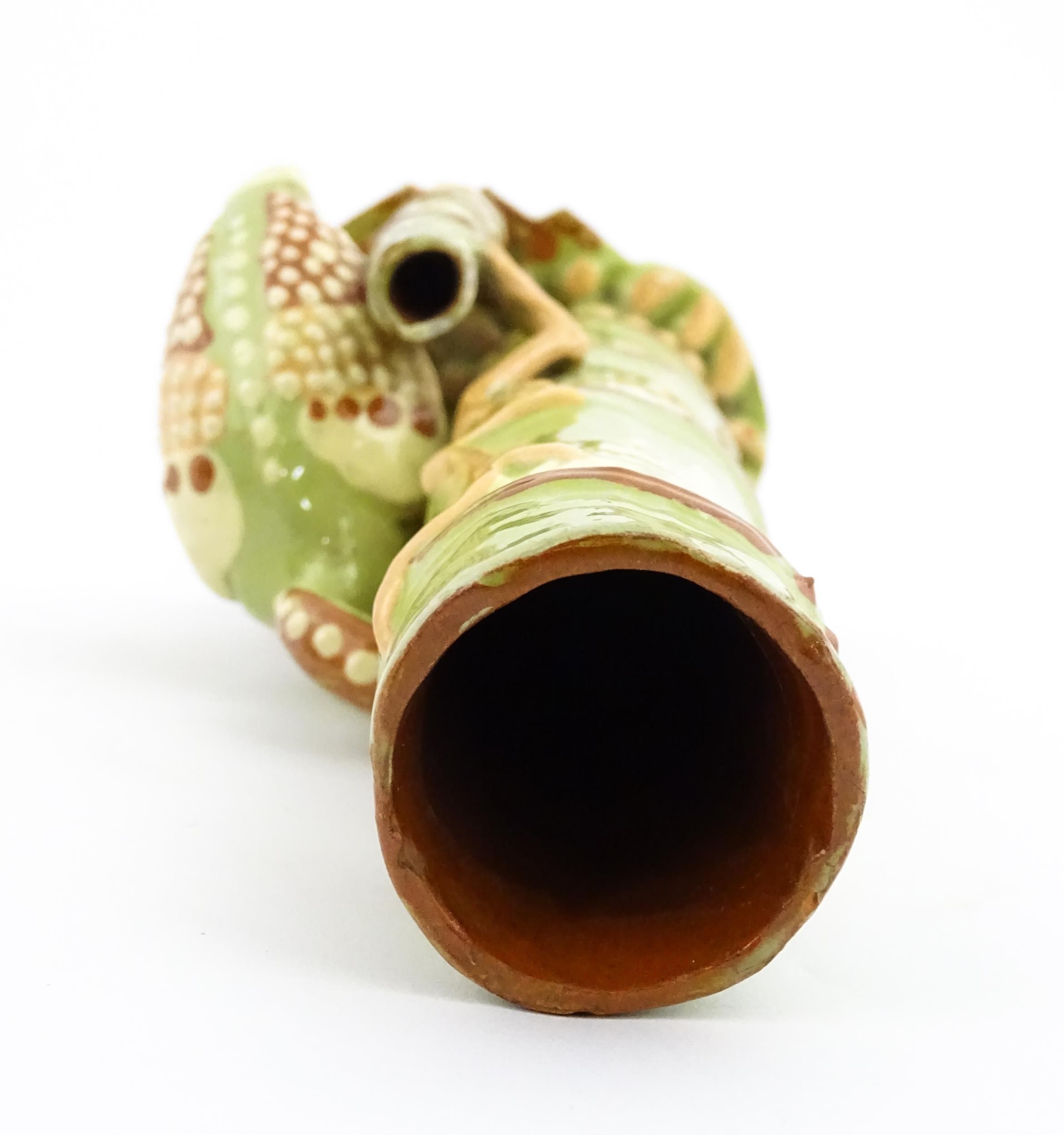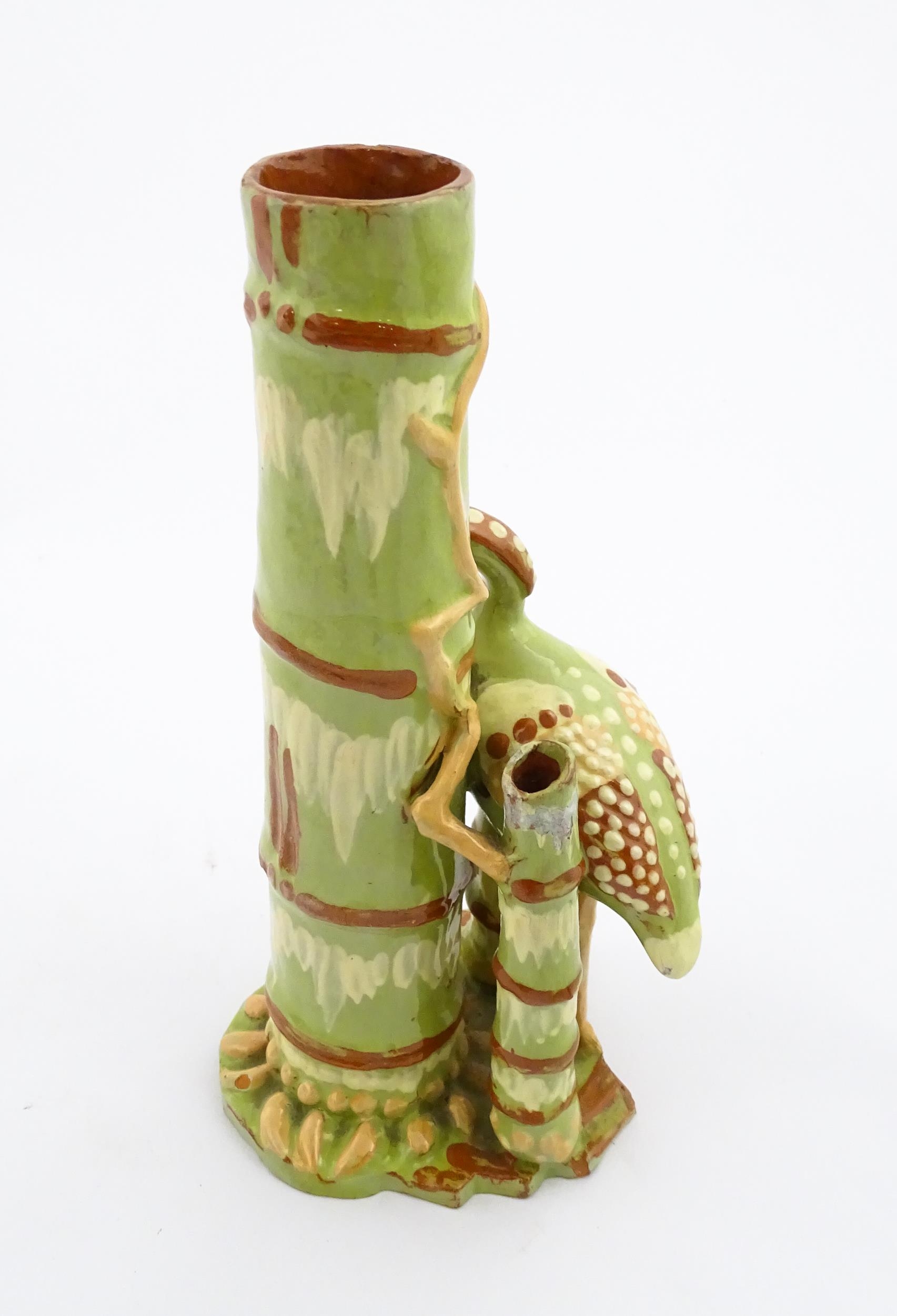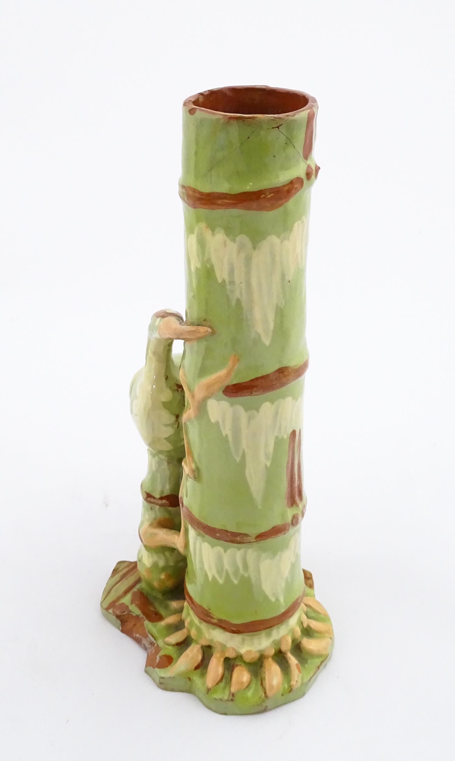 A C. H. Brannam Barum art pottery spill vase of bamboo form with heron bird detail. Signed and dated 1896 under. Approx. 9 1/2" high