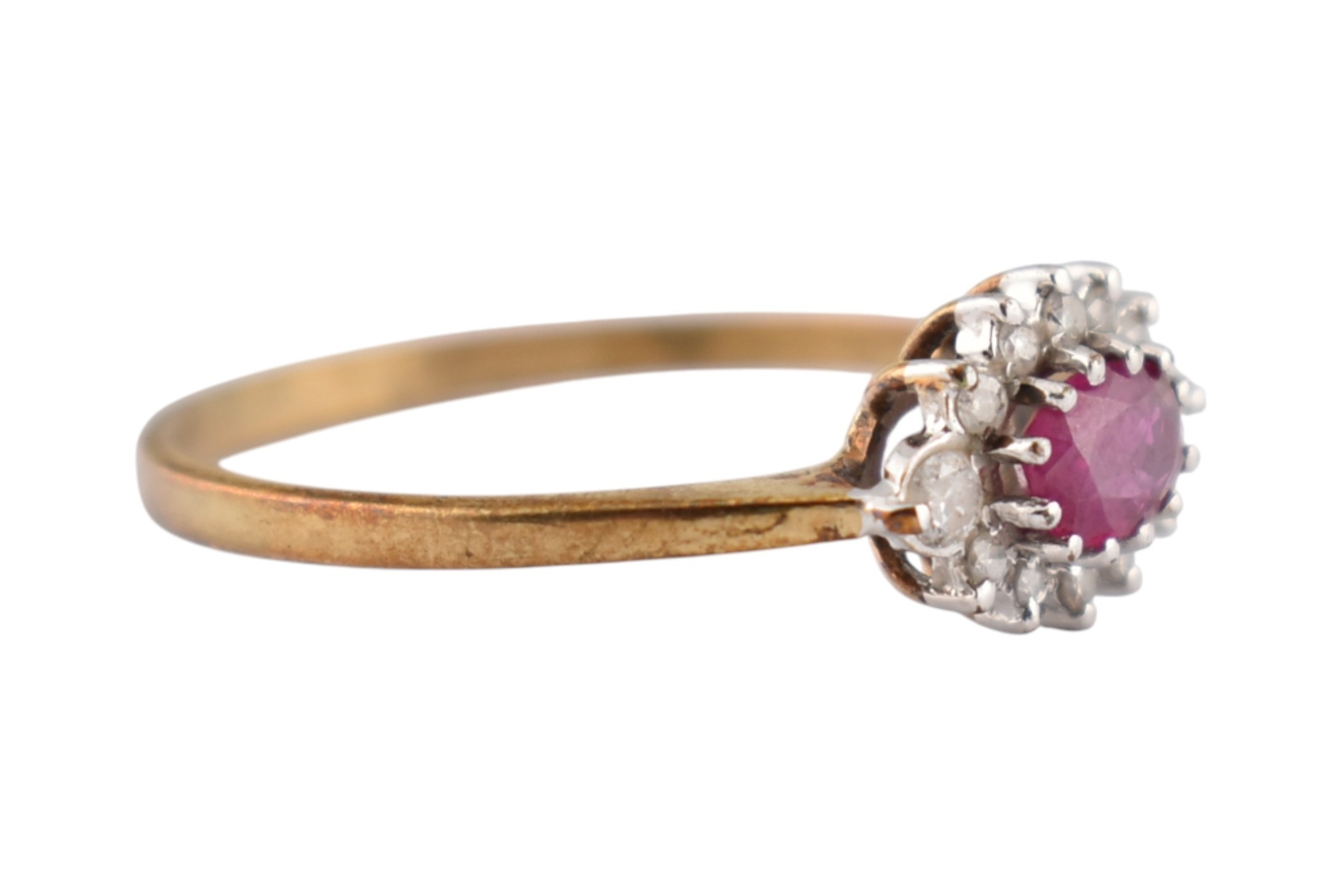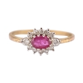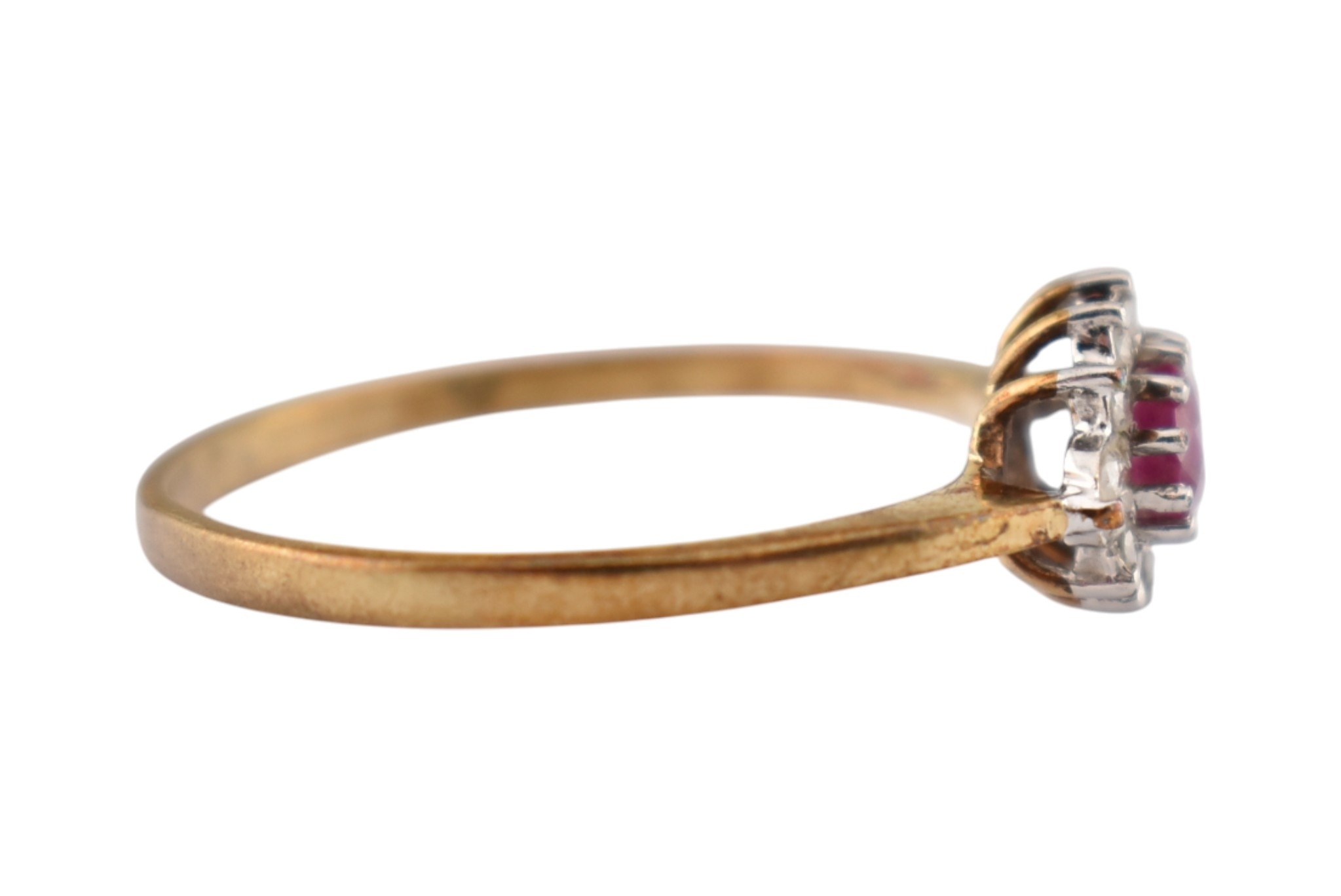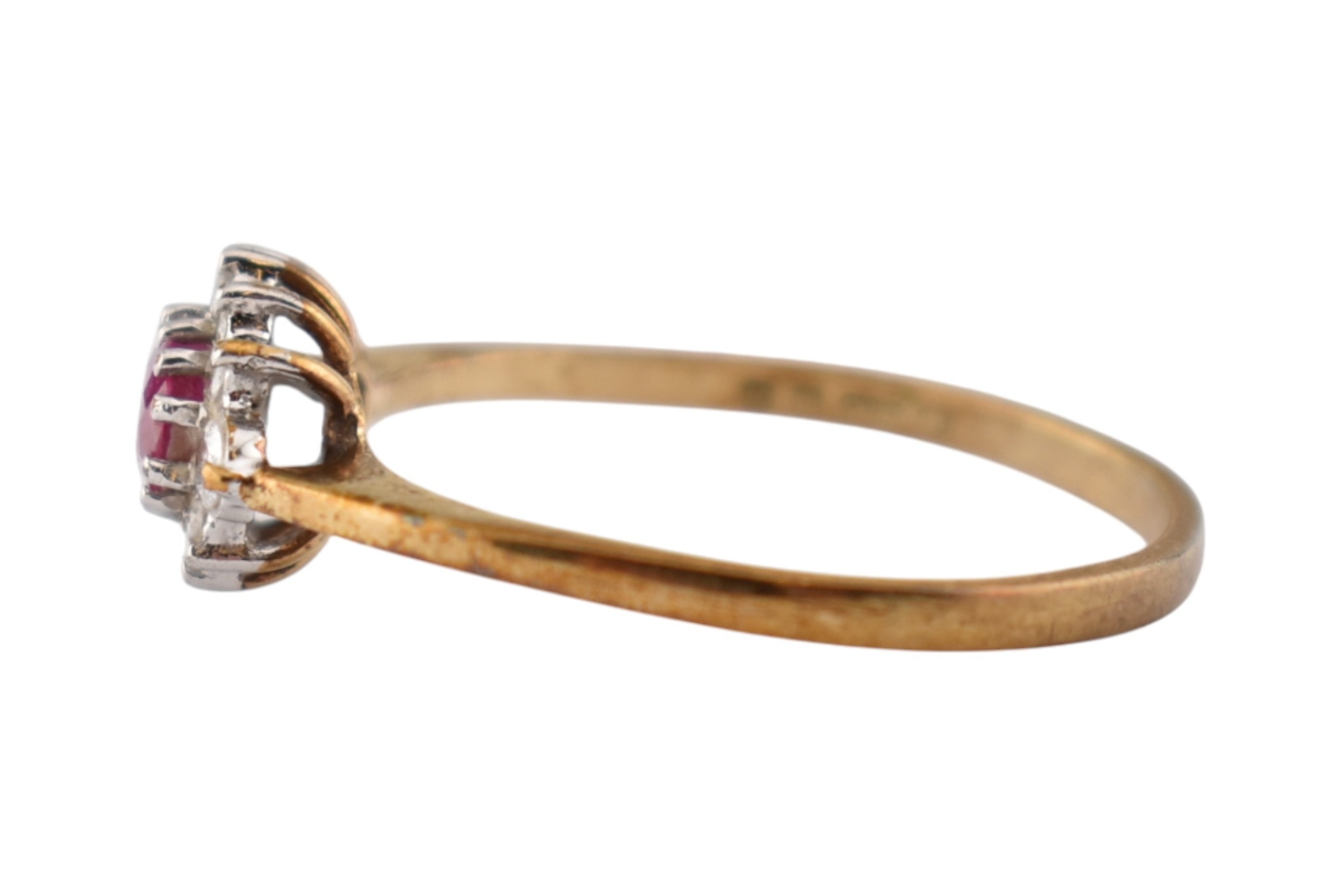 A hallmarked 9ct gold ruby and diamond halo ring. Weight 1.9g. Size U