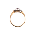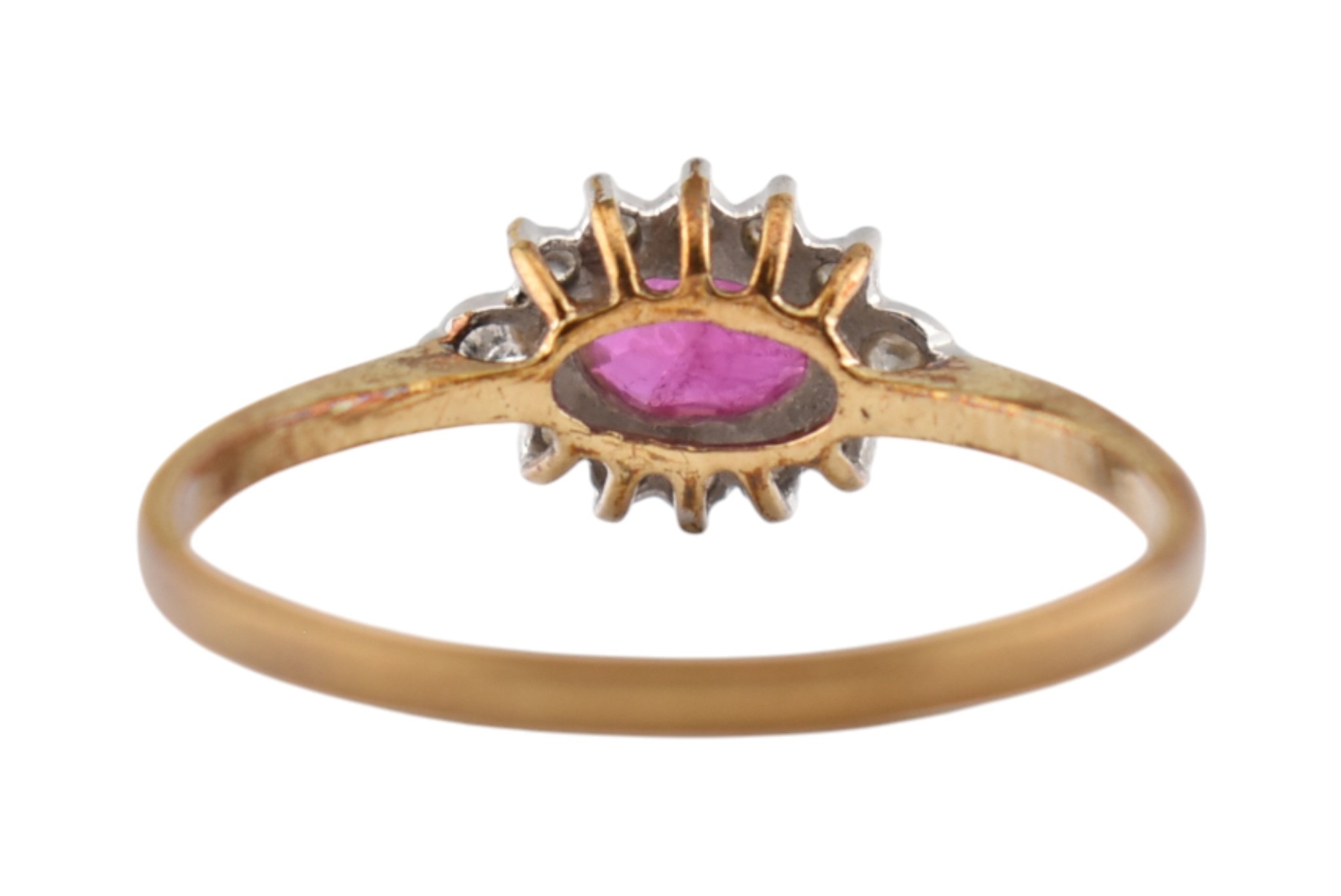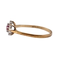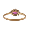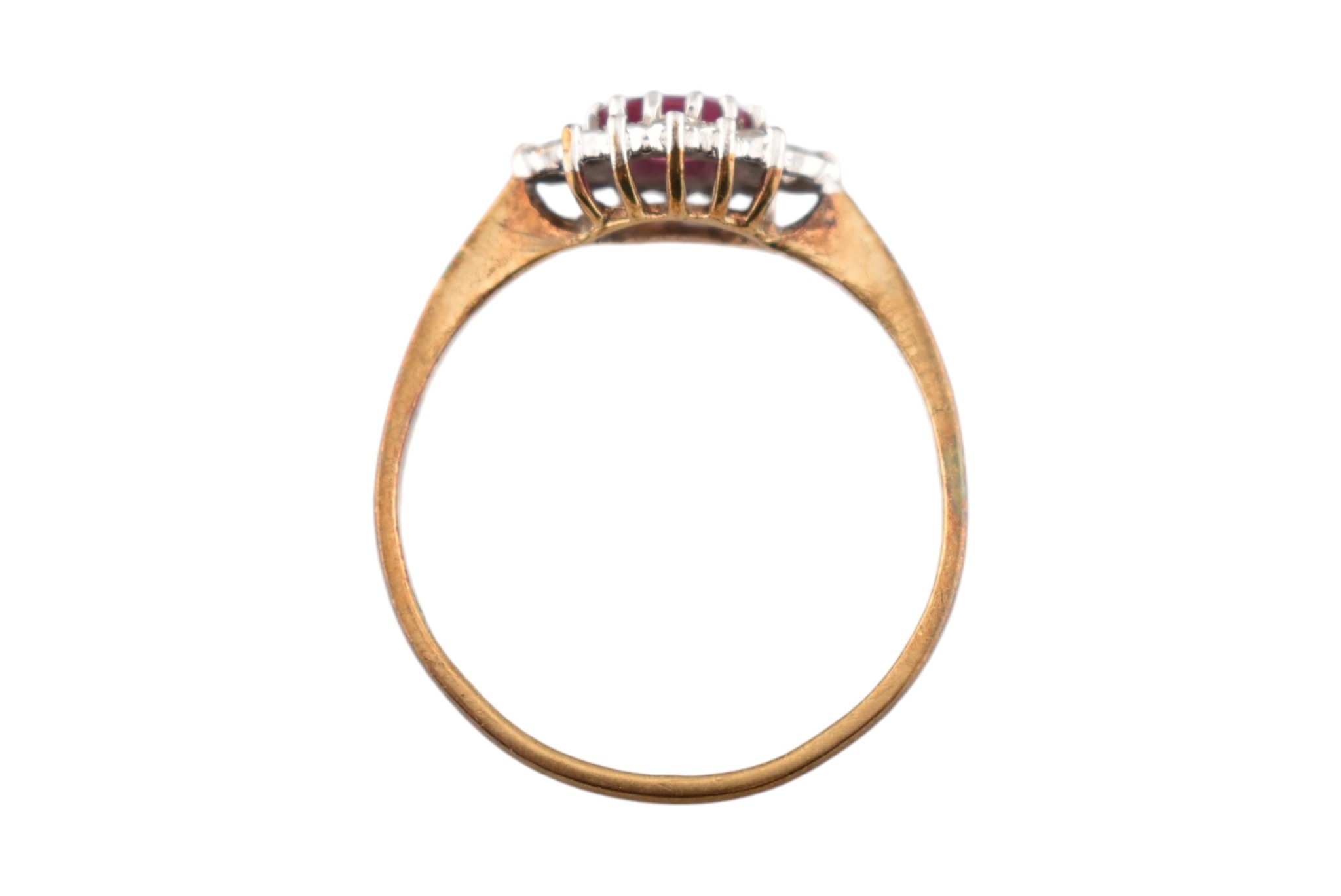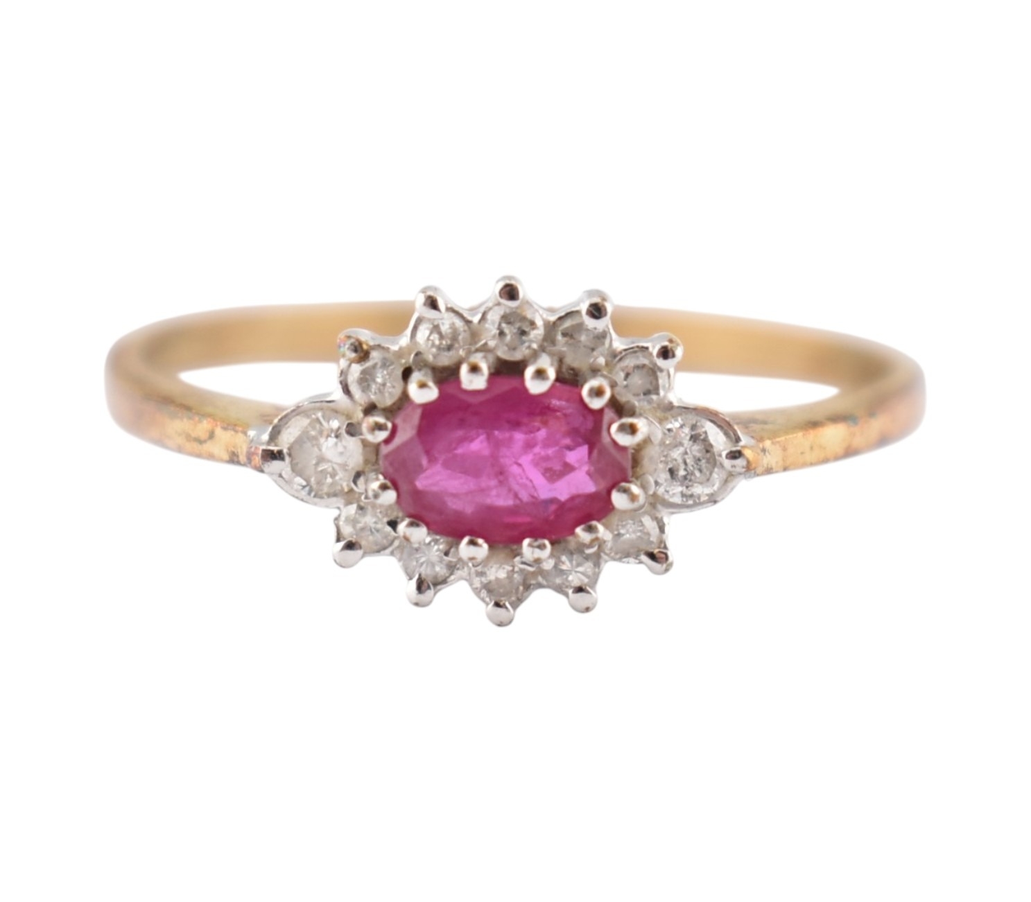 A hallmarked 9ct gold ruby and diamond halo ring. Weight 1.9g. Size U