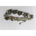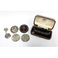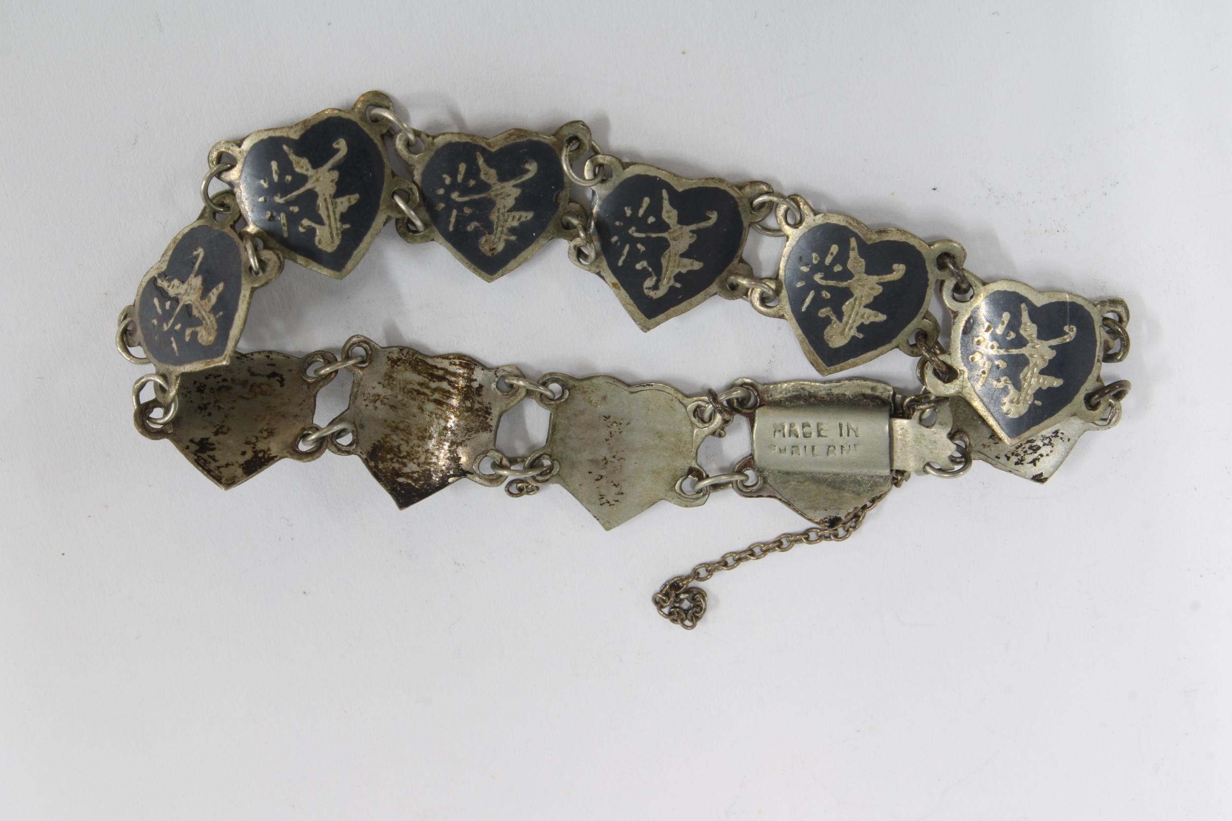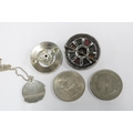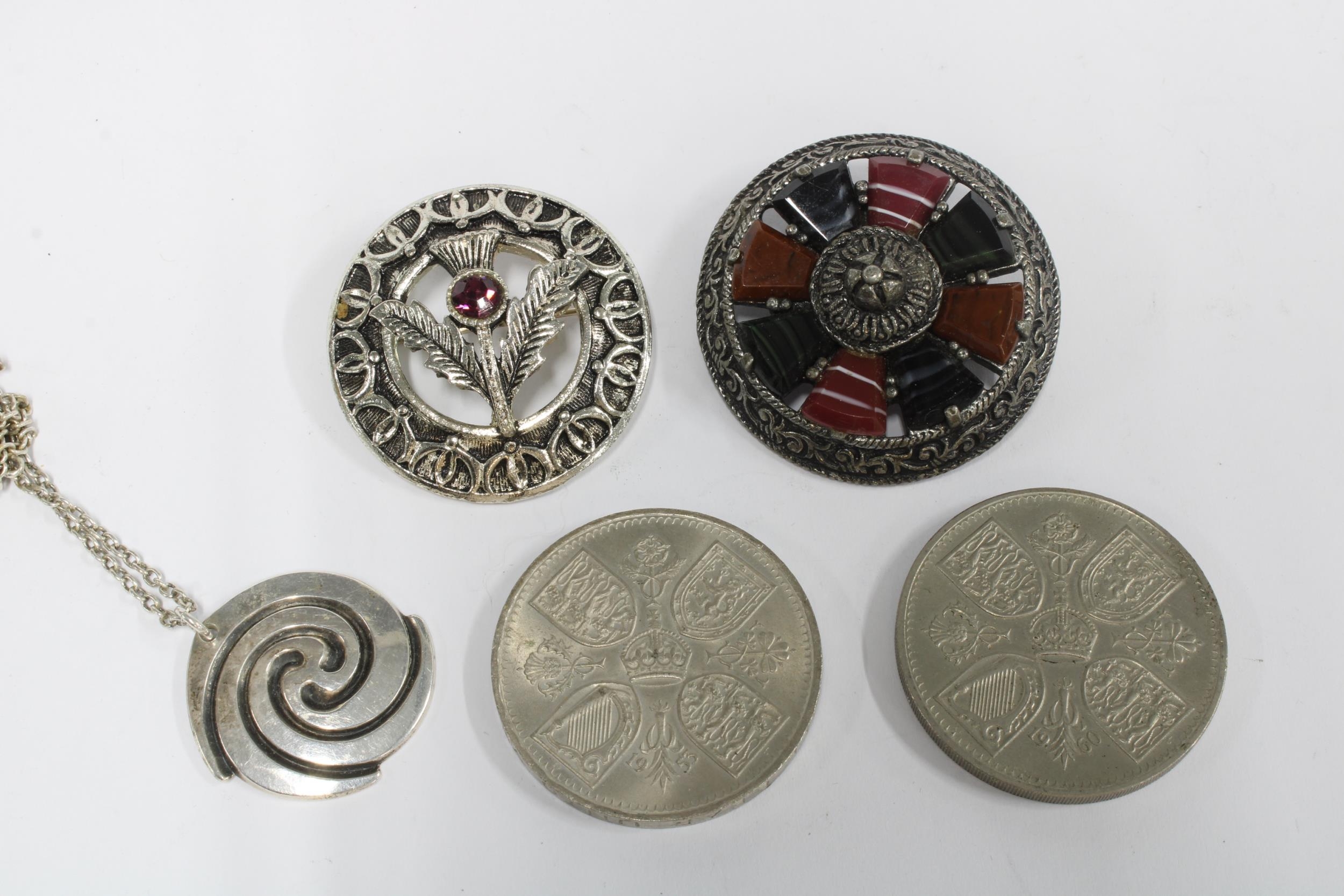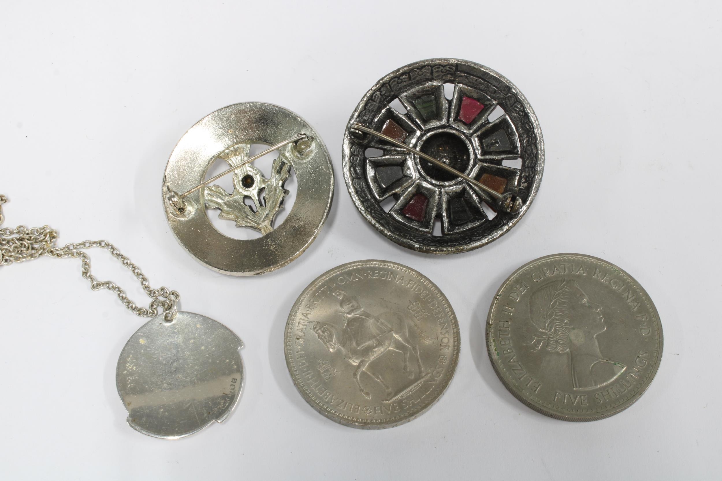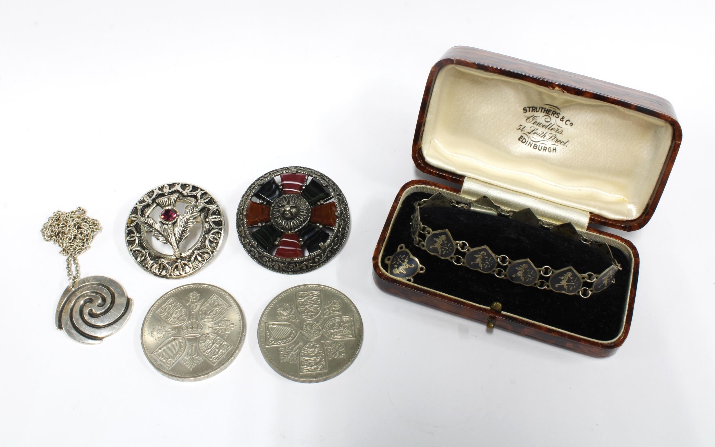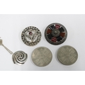 Vintage silver pendant necklace, a Siam silver bracelet, costume jewellery brooches and two commemorative coins.