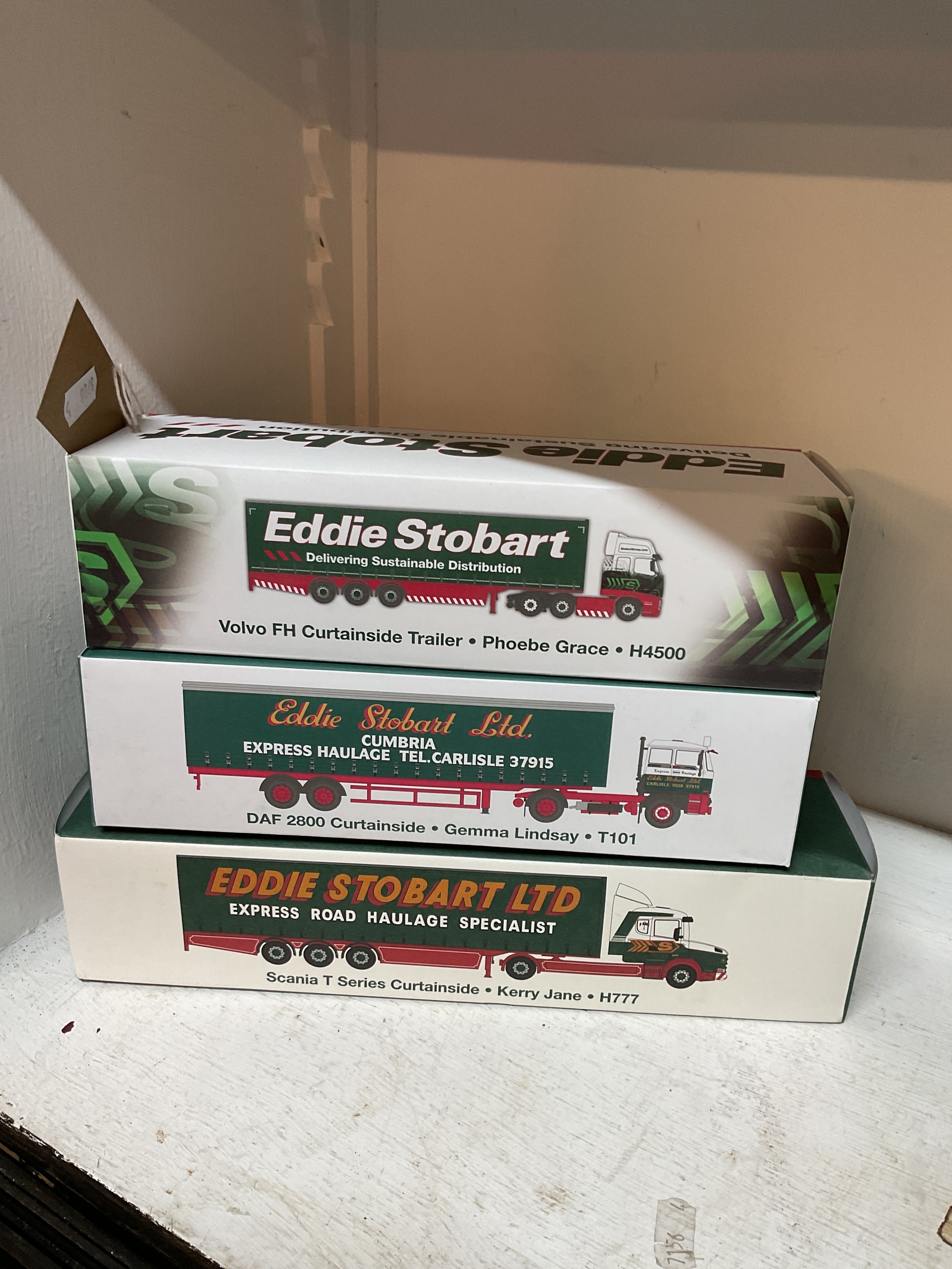 Three boxed as new Atlas Edition Eddie Stobart lorries to include 'Volvo FH Curtainside Trailer Pheobe Grace H4500', 'DAF 2800 Curtainside Gemma Lindsay T101' and 'Scania T Series Curtainside Kerry Jane H777'
