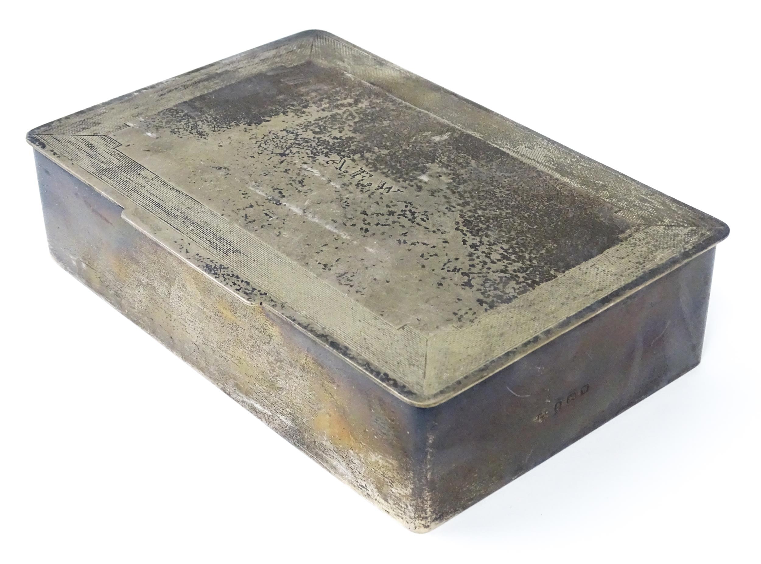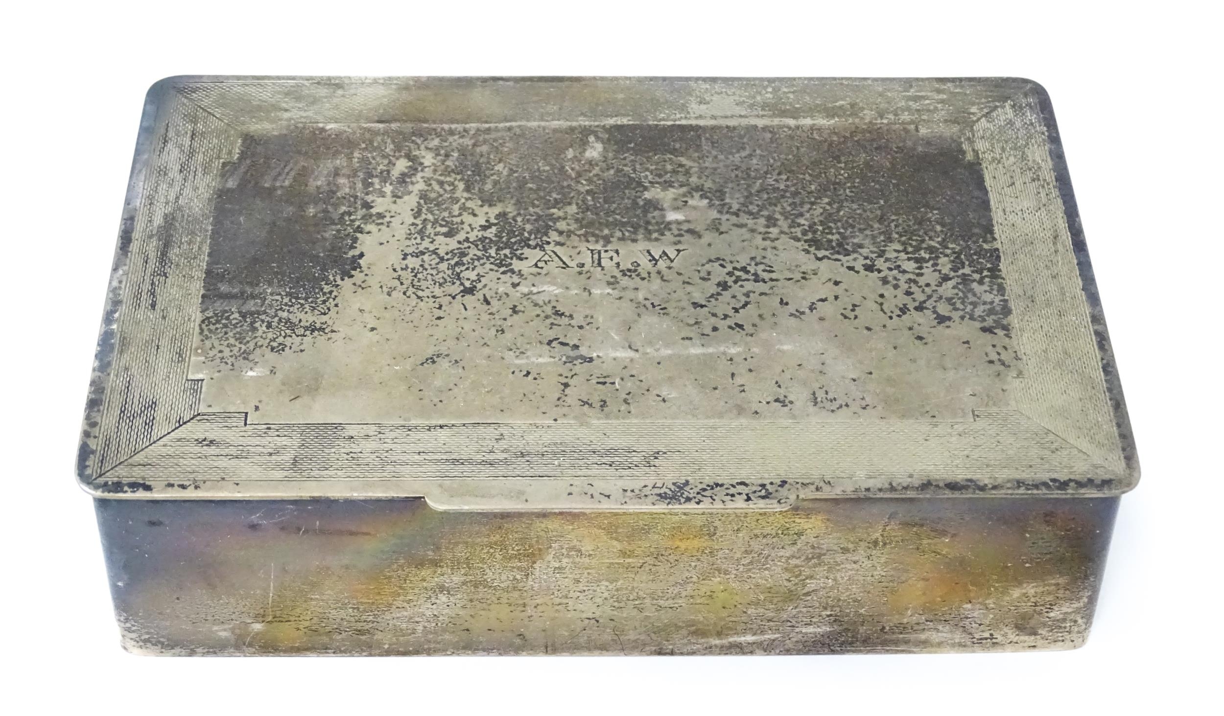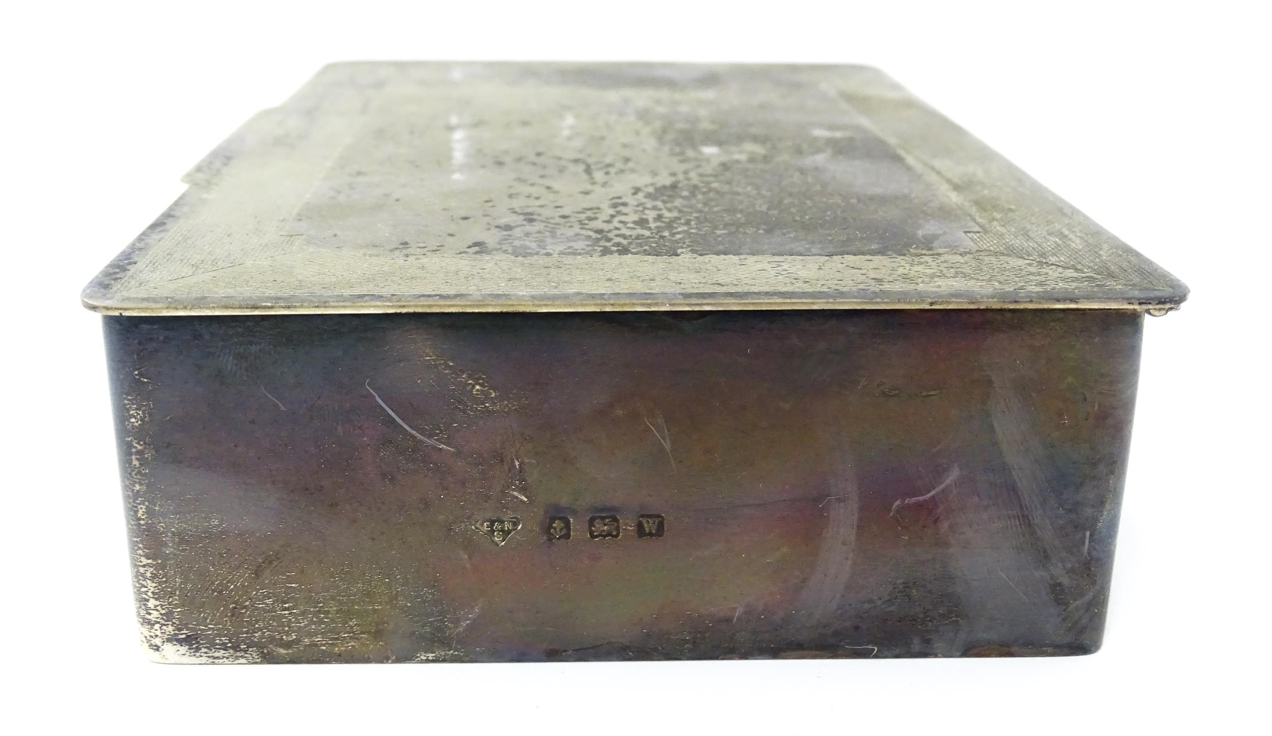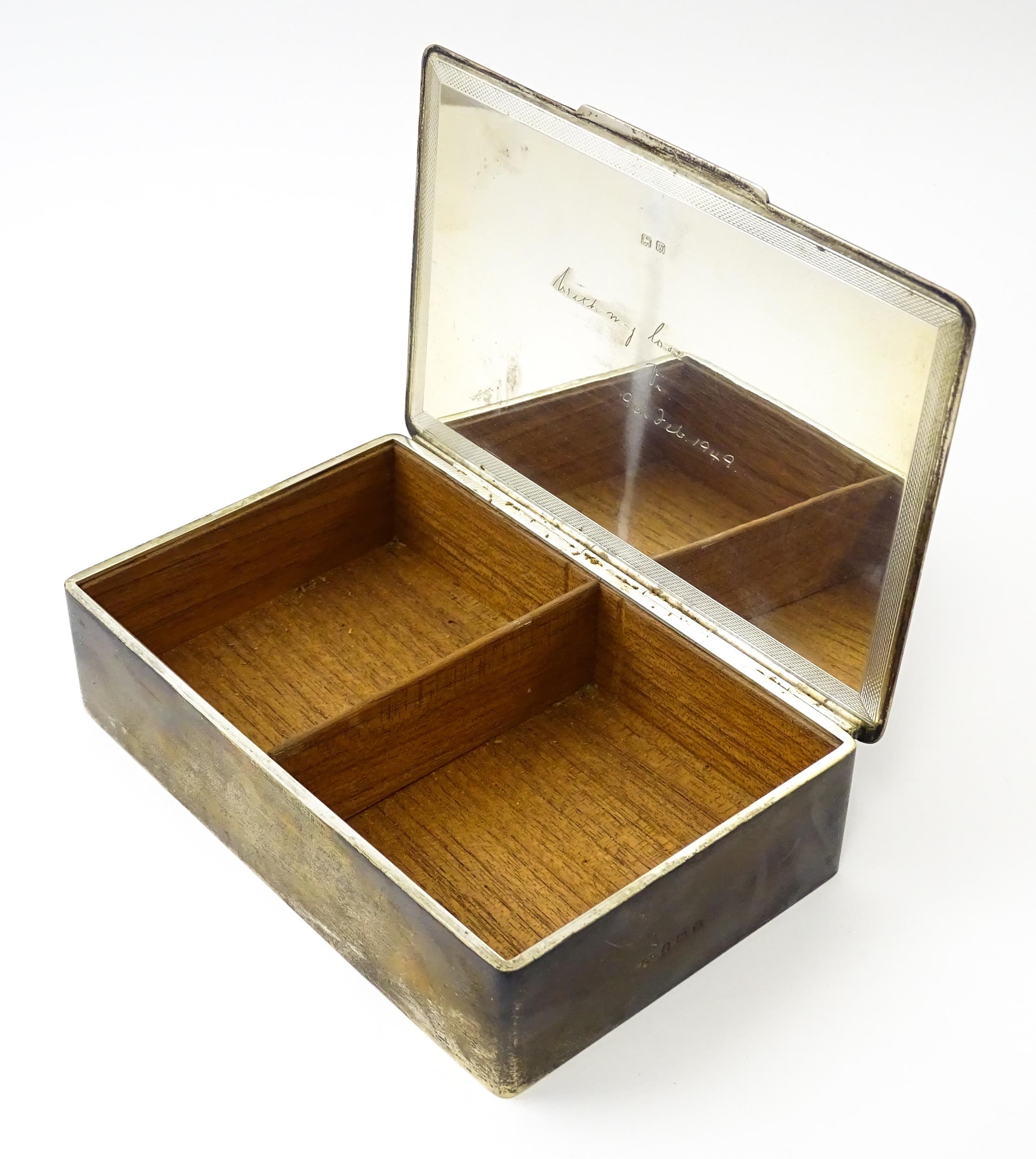 An Art Deco silver cigarette box with engine turned decoration, opening to reveal a wood lined interior, hallmarked Birmingham 1946, maker E. & N. Speak. Approx. 1 1/2" high x 6 3/4" wide x 4 1/2" deep