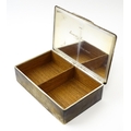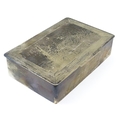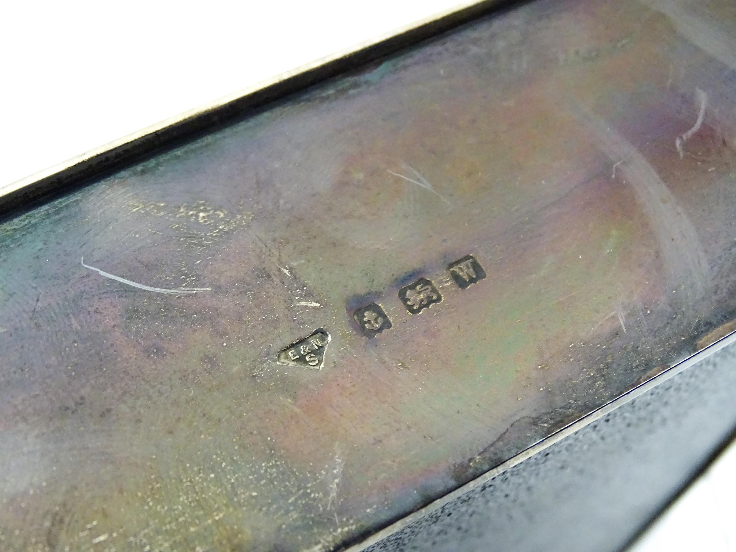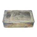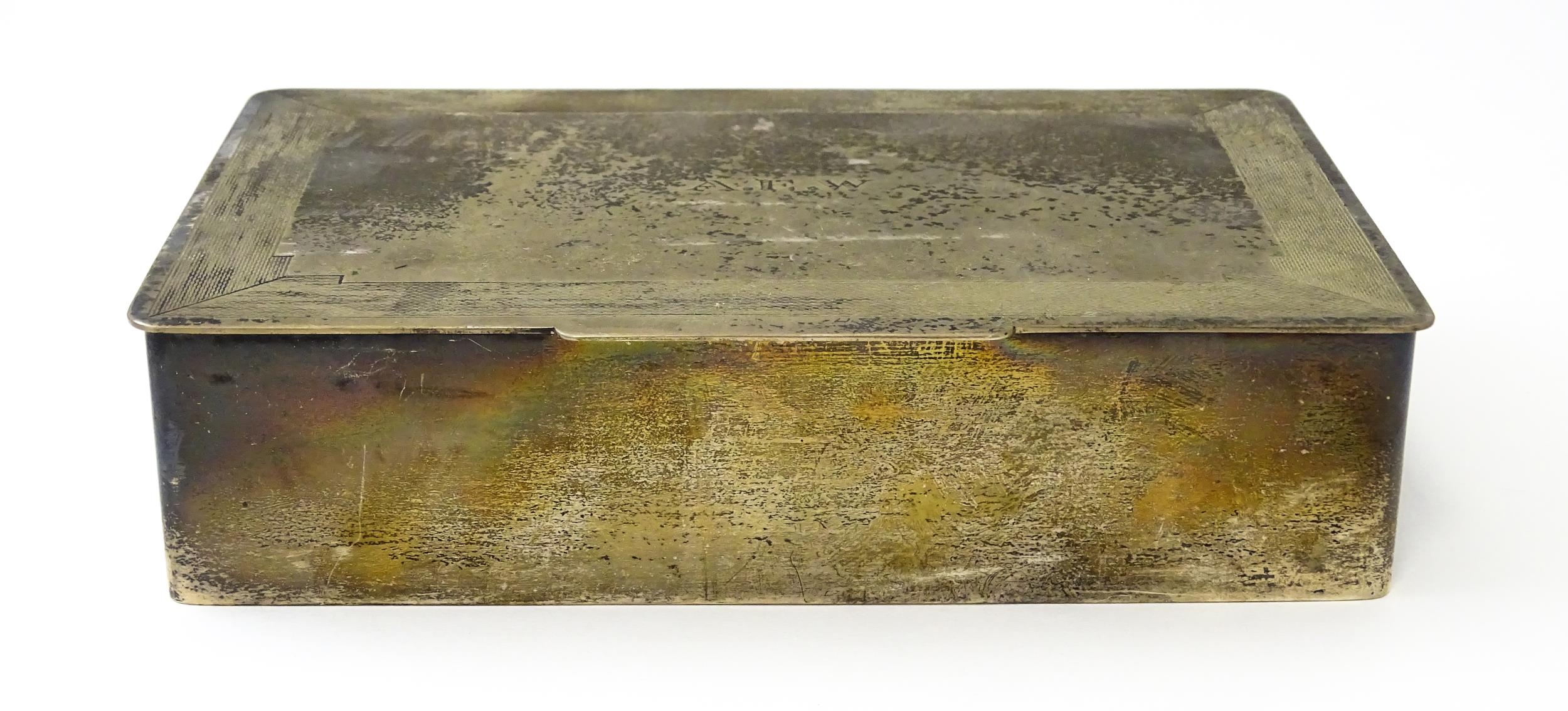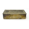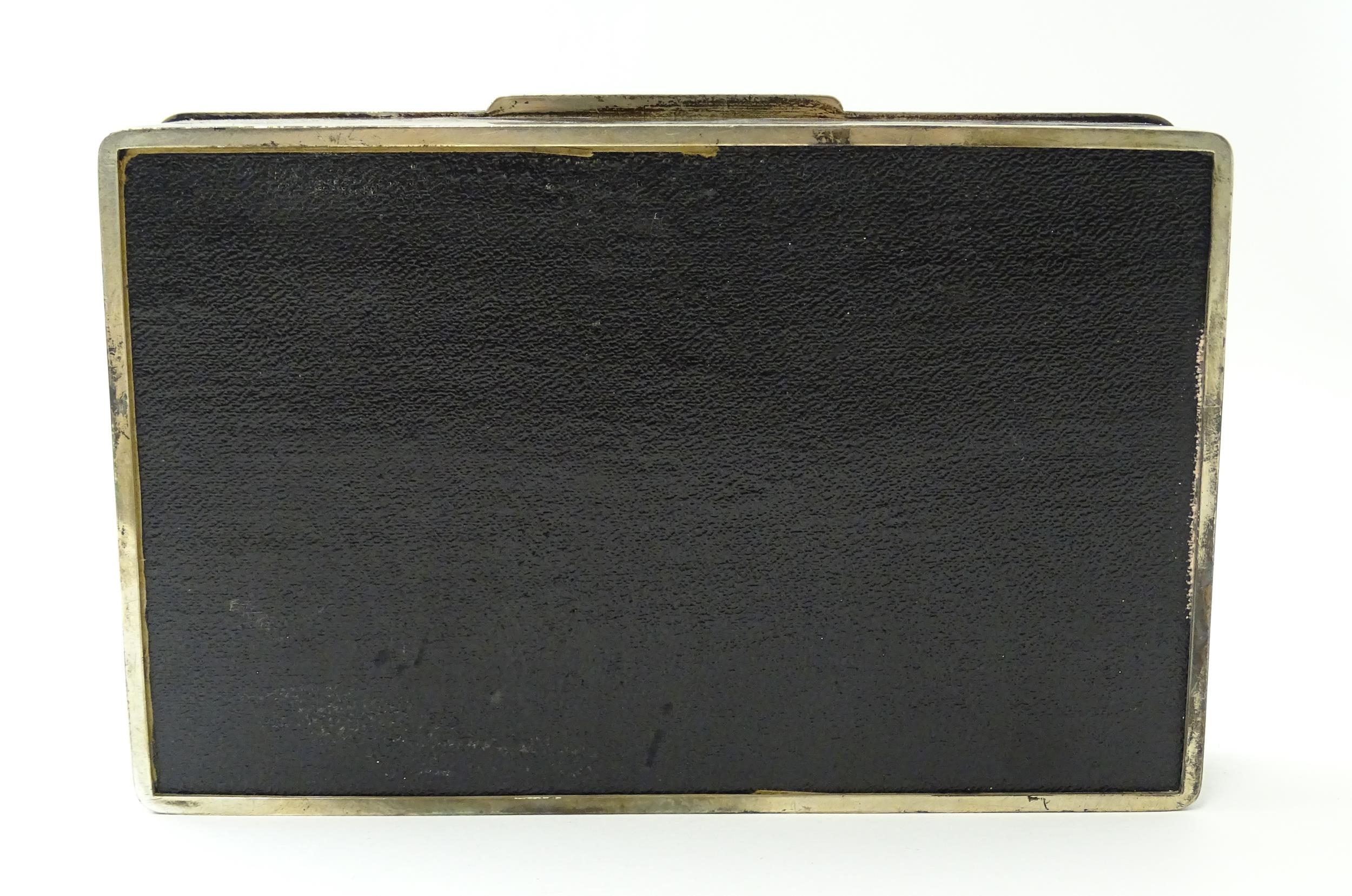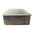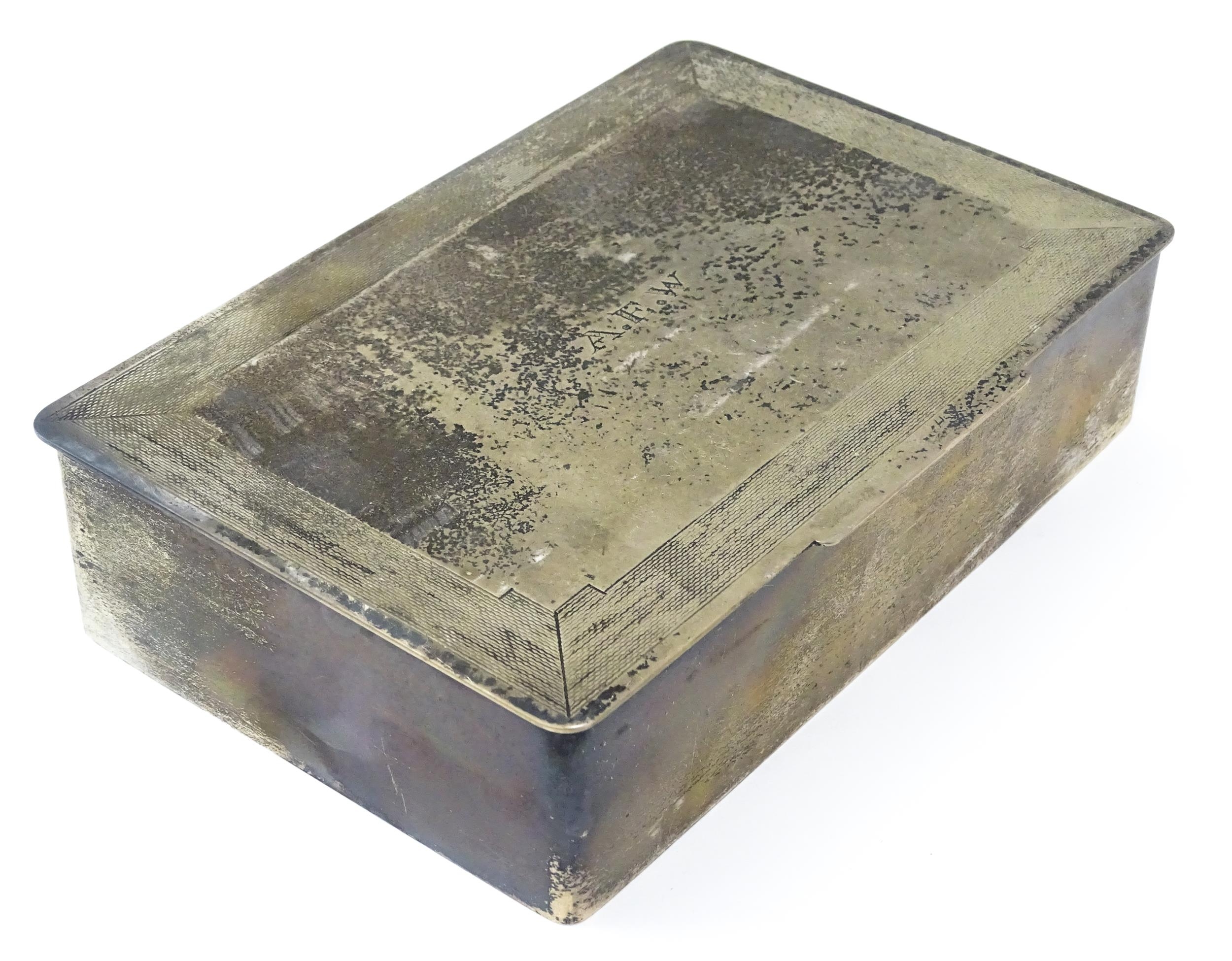 An Art Deco silver cigarette box with engine turned decoration, opening to reveal a wood lined interior, hallmarked Birmingham 1946, maker E. & N. Speak. Approx. 1 1/2" high x 6 3/4" wide x 4 1/2" deep