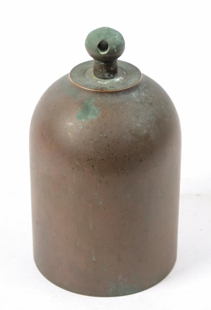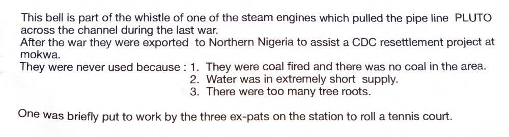Of WWII 'Pluto' (Pipeline Under The Ocean) interest. A brass bell constructed from the whistle cap of a steam engine used to pull the pipeline across the channel: with attached note of provenance, 17cm high.