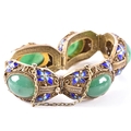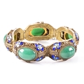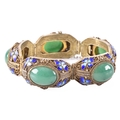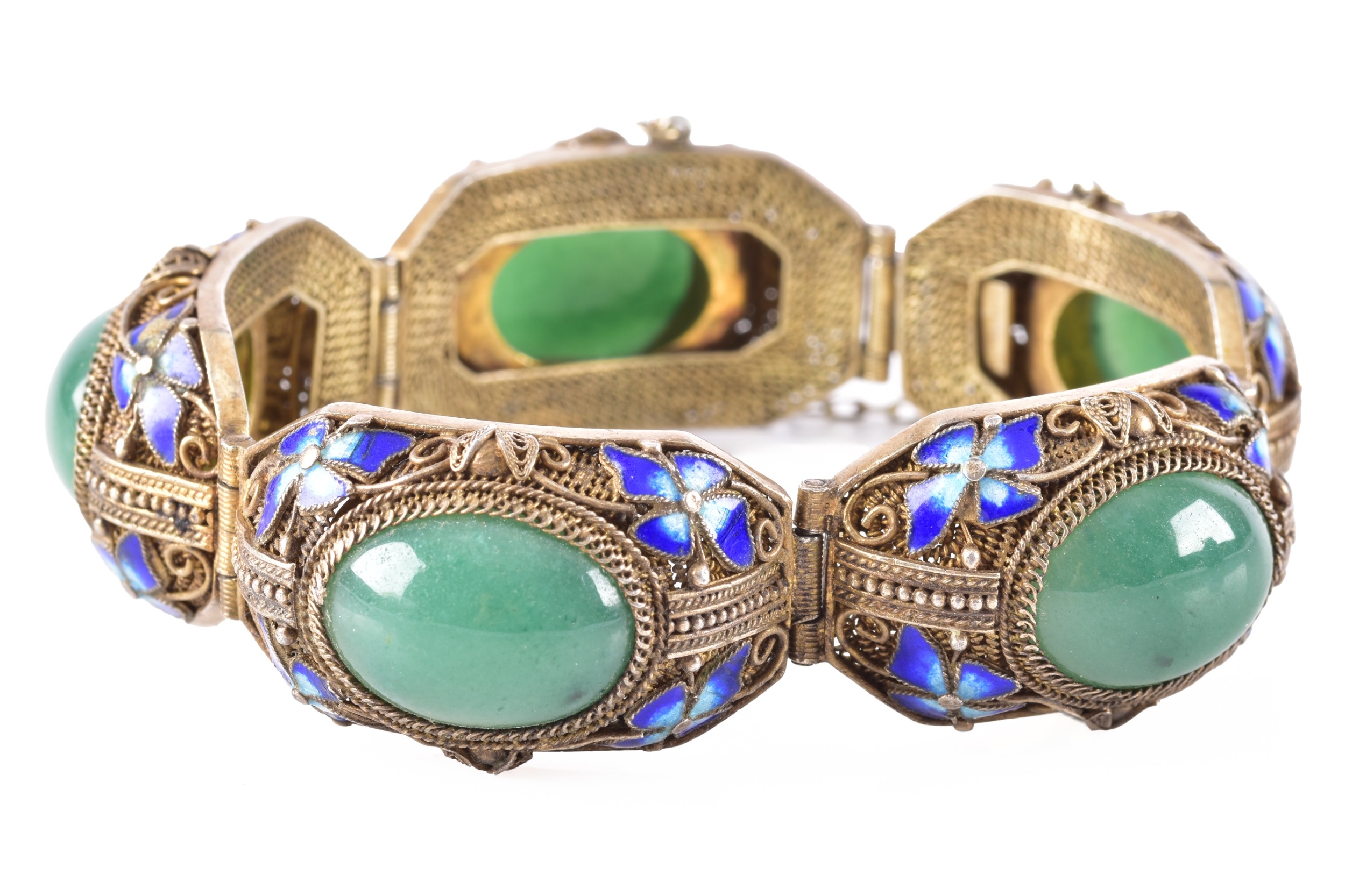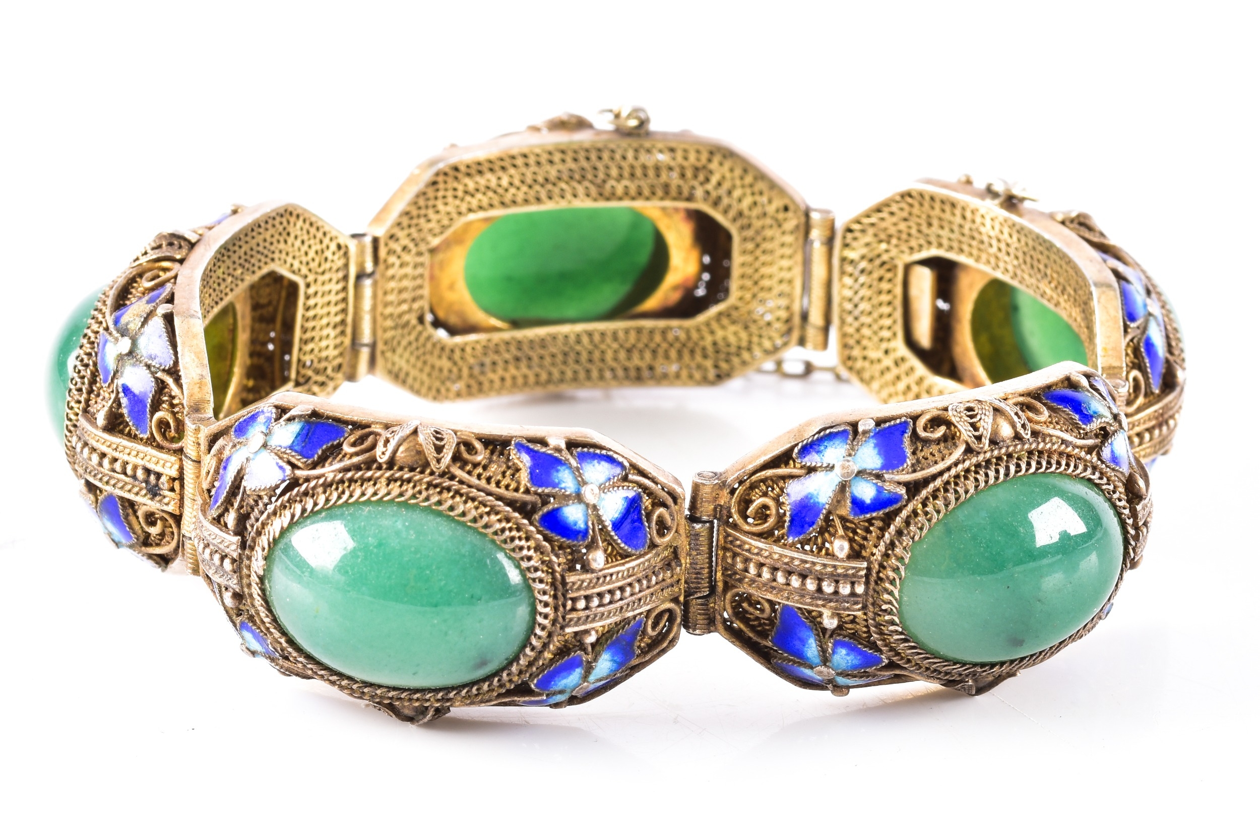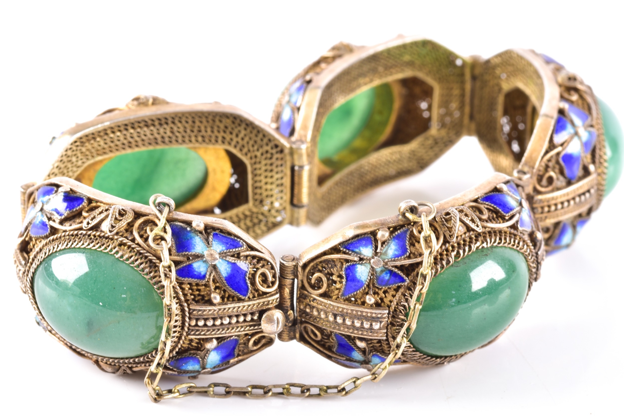 A silver gilt Chinese export cloisonne fiigree bracelet featuring jadeite cabochons, surrounded by blue enamel floral detail, fitted with safety chain.