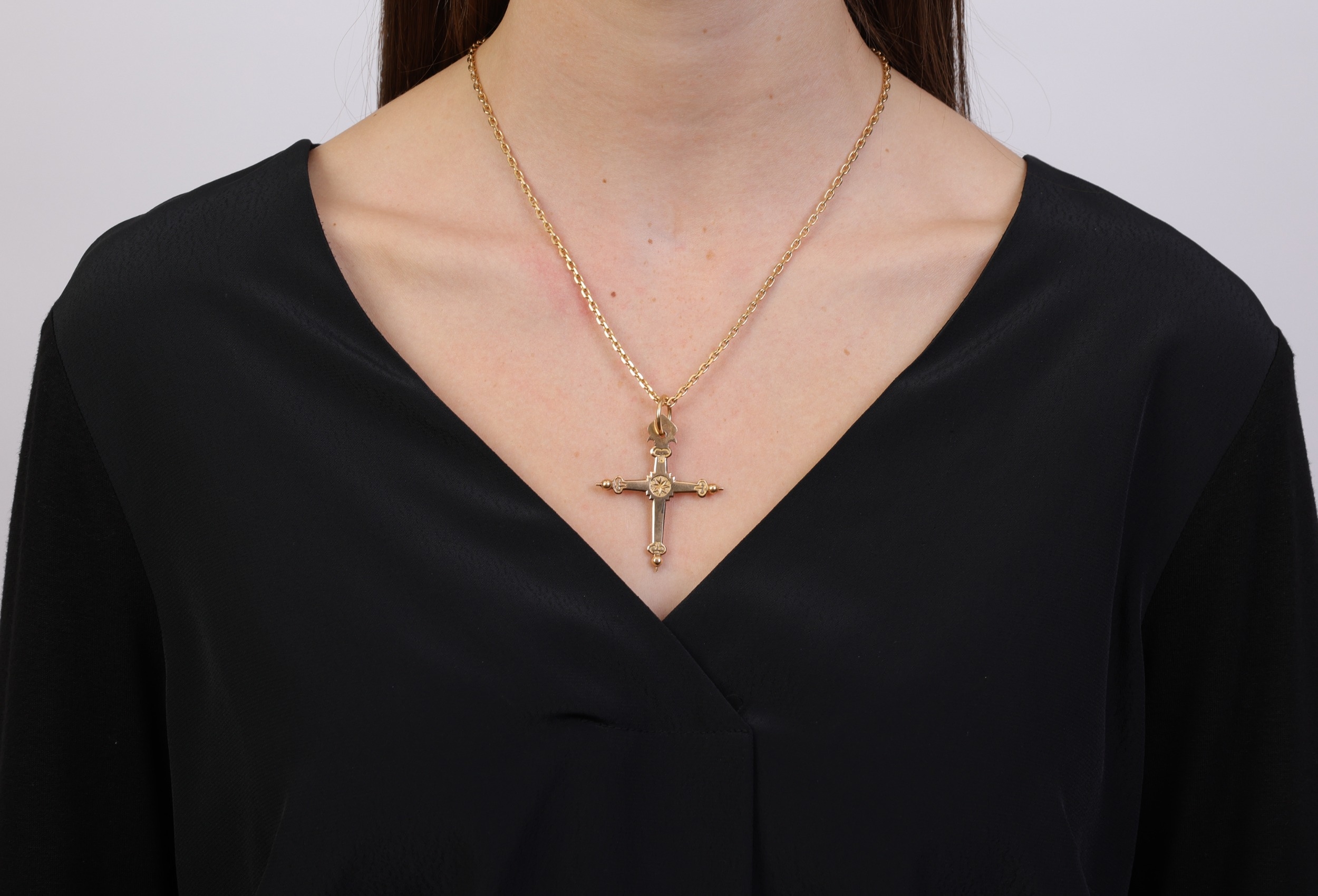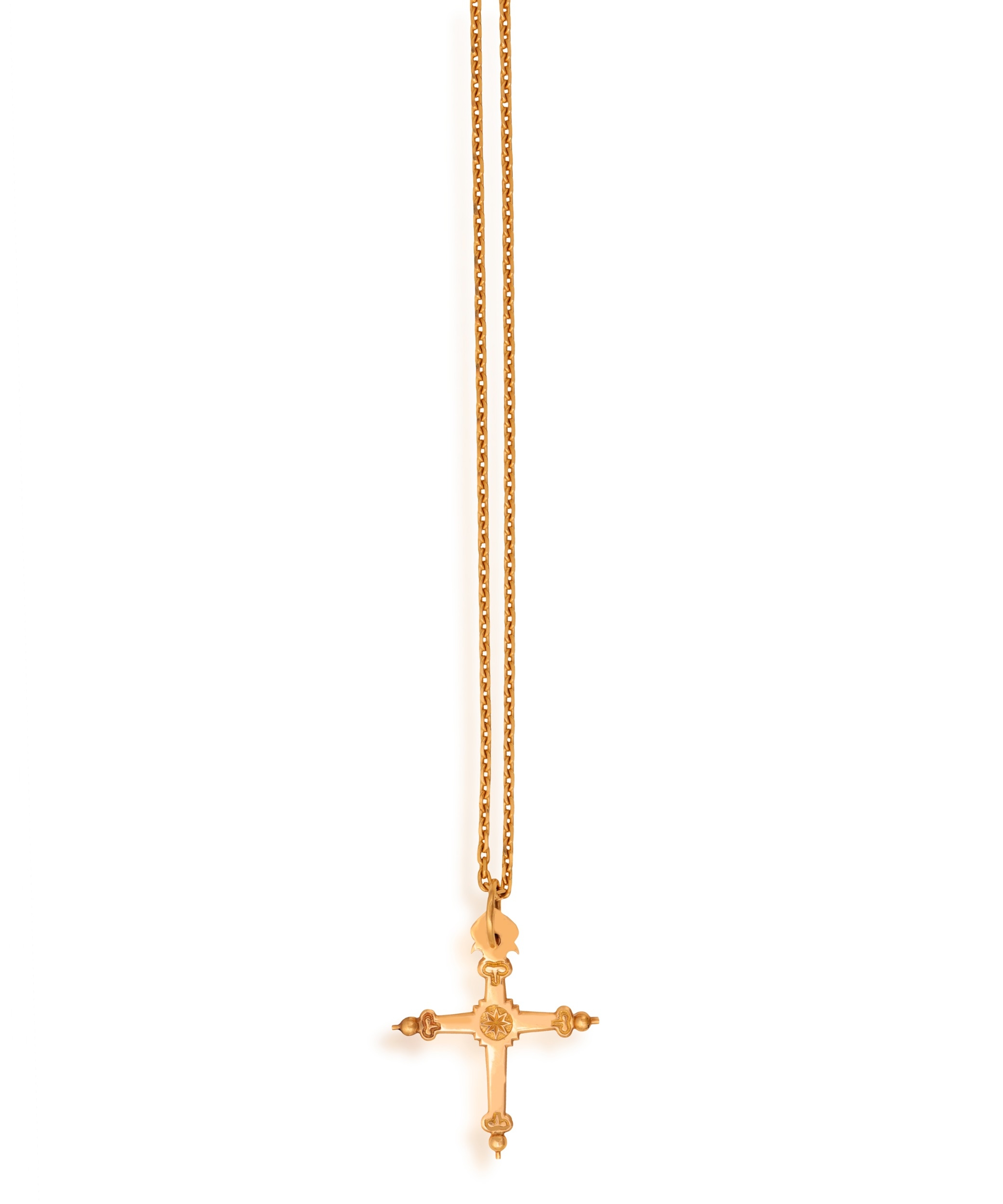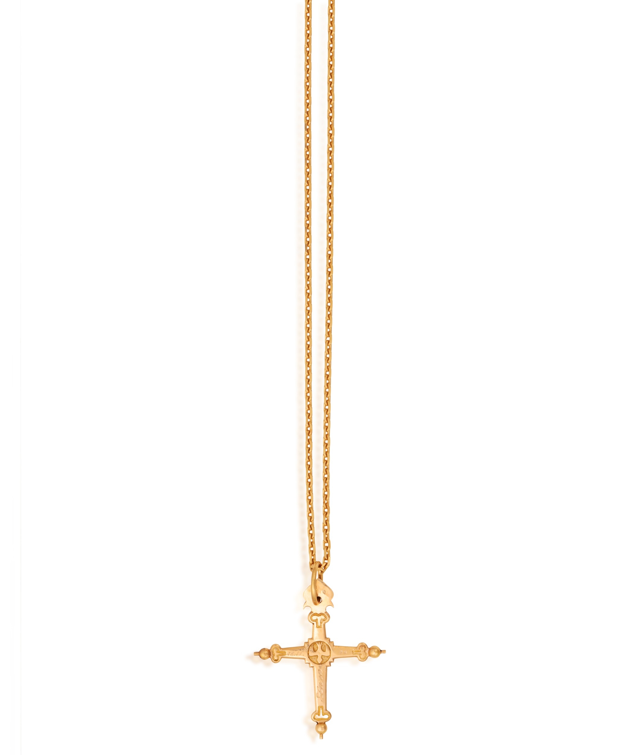 A GOLD PENDANT ON CHAIN The cross pendant with engraving and beading detailing, with suspension loop, suspending from a cable-link chain, both in 18K gold, with maker's marks, French assay marks, pendant length (including suspension loop): 5.4cm, chain length 50cm