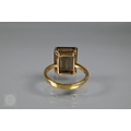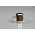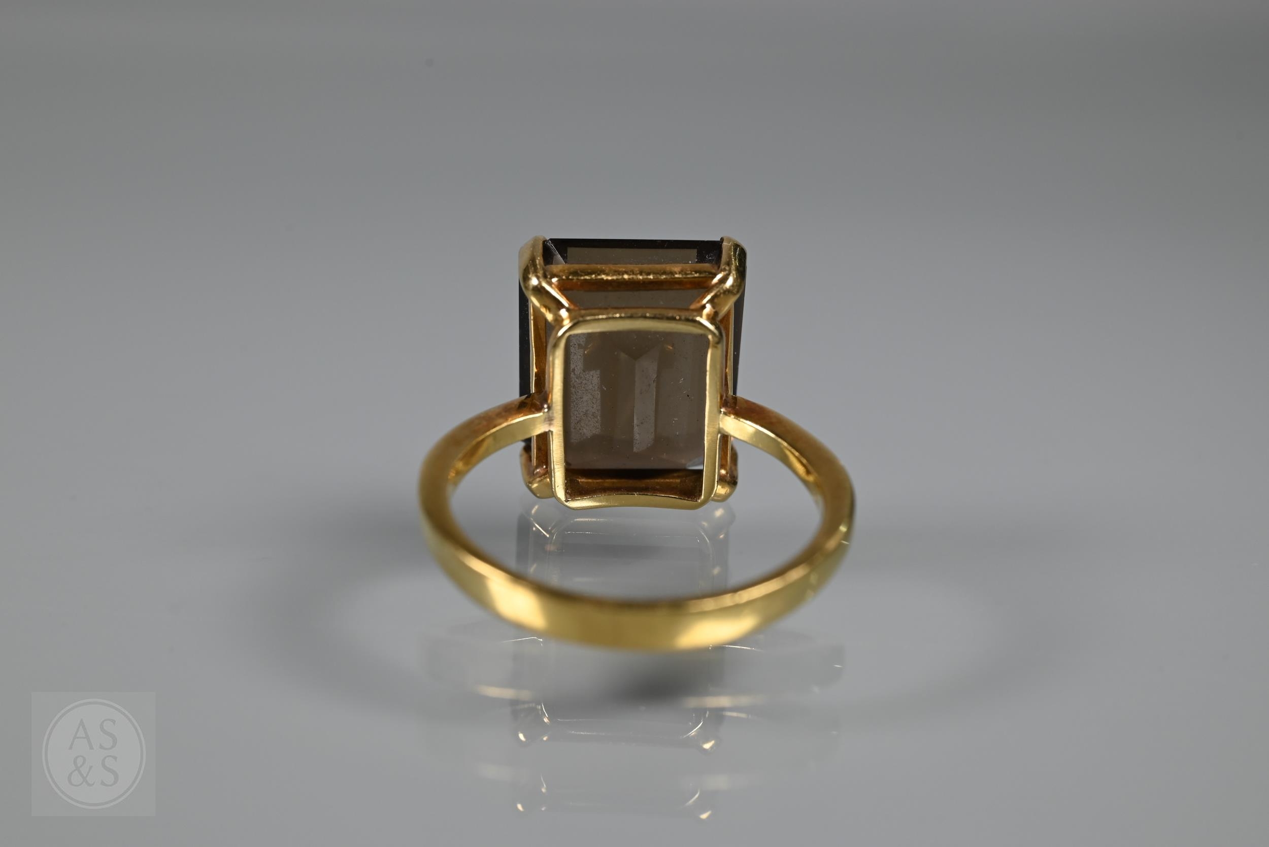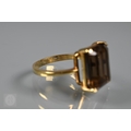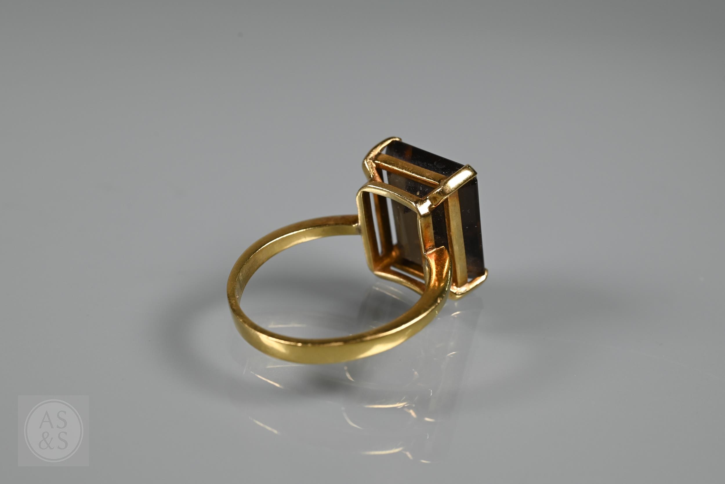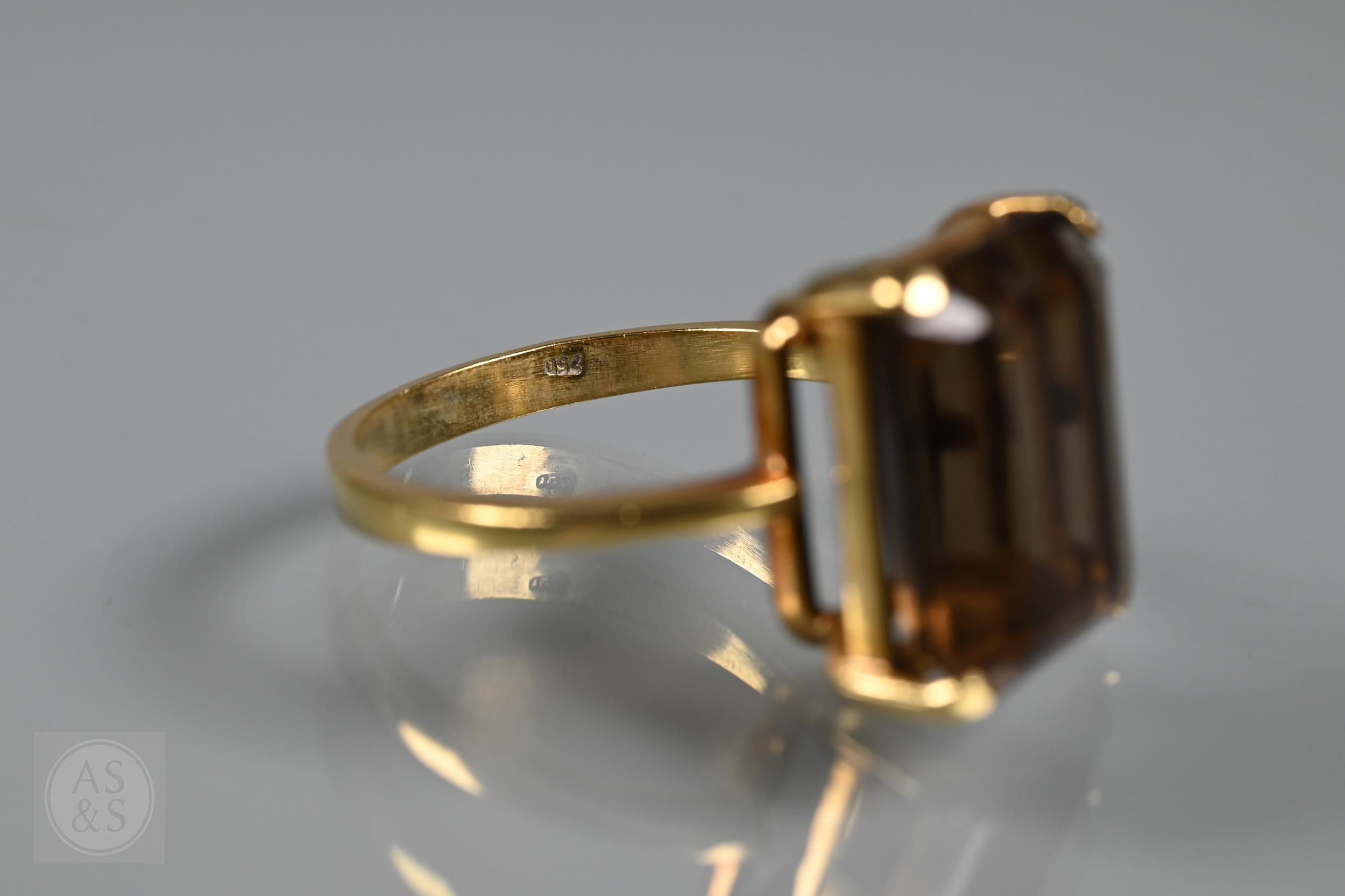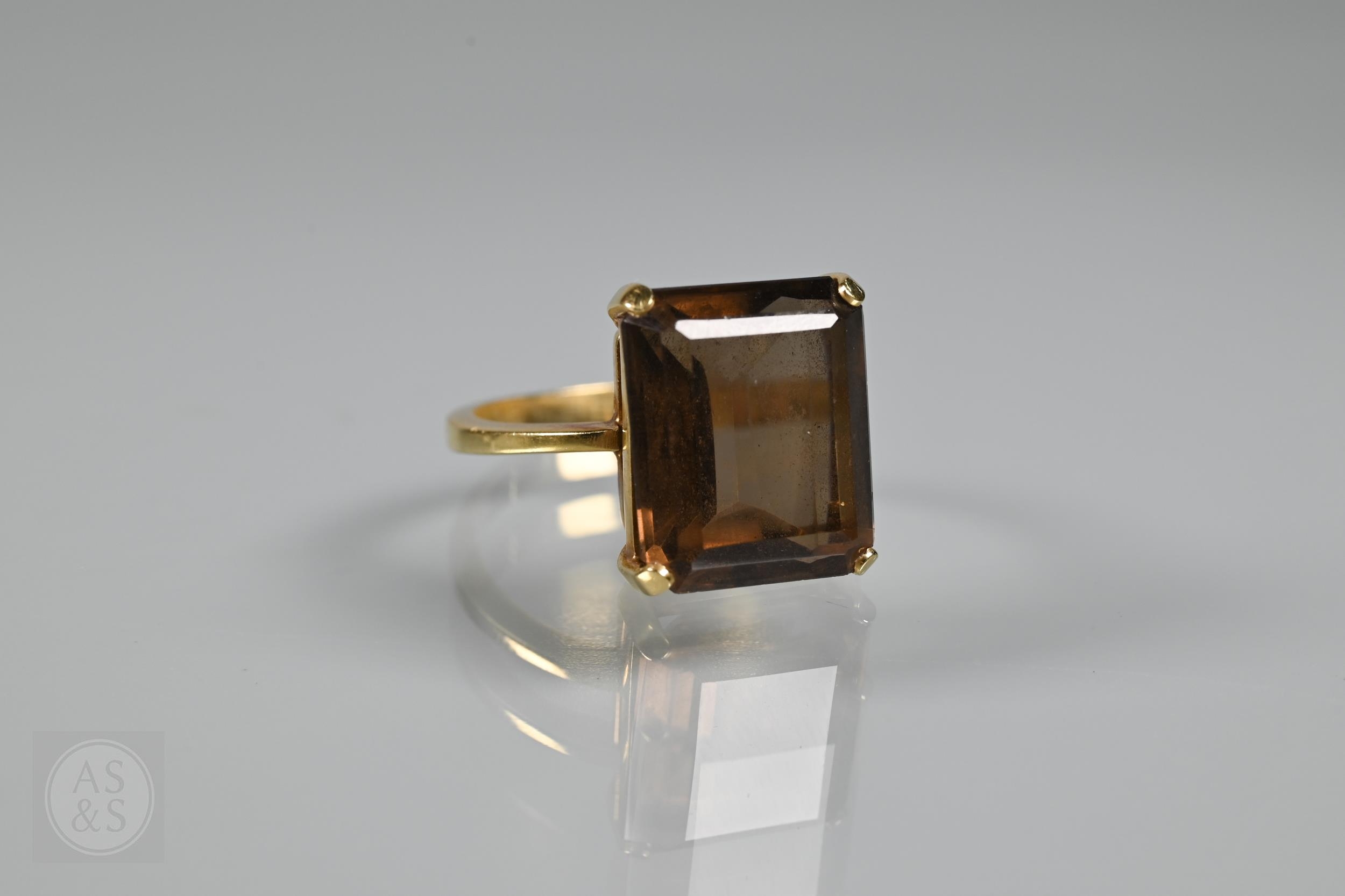 A single stone rectangular citrine set ring, yellow metal stamped 750, size Q, citrine 1.4 x 1cm