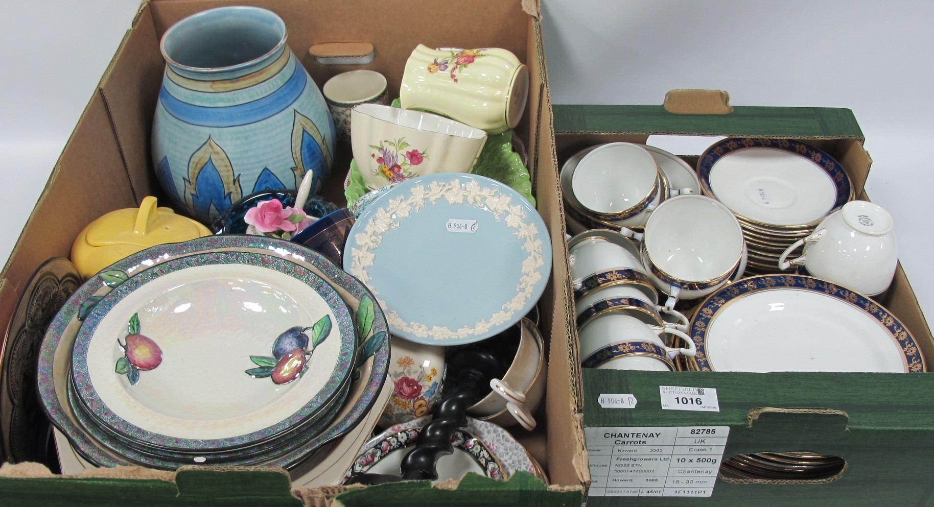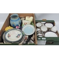 Ceramics, including Royal Albert Imperial Blue tea service, Wedgwood Jasperware pedestal dish, Carlton Ware items, Hornsea plate and cup, Royal Albert willow pattern tray etc. Two boxes.