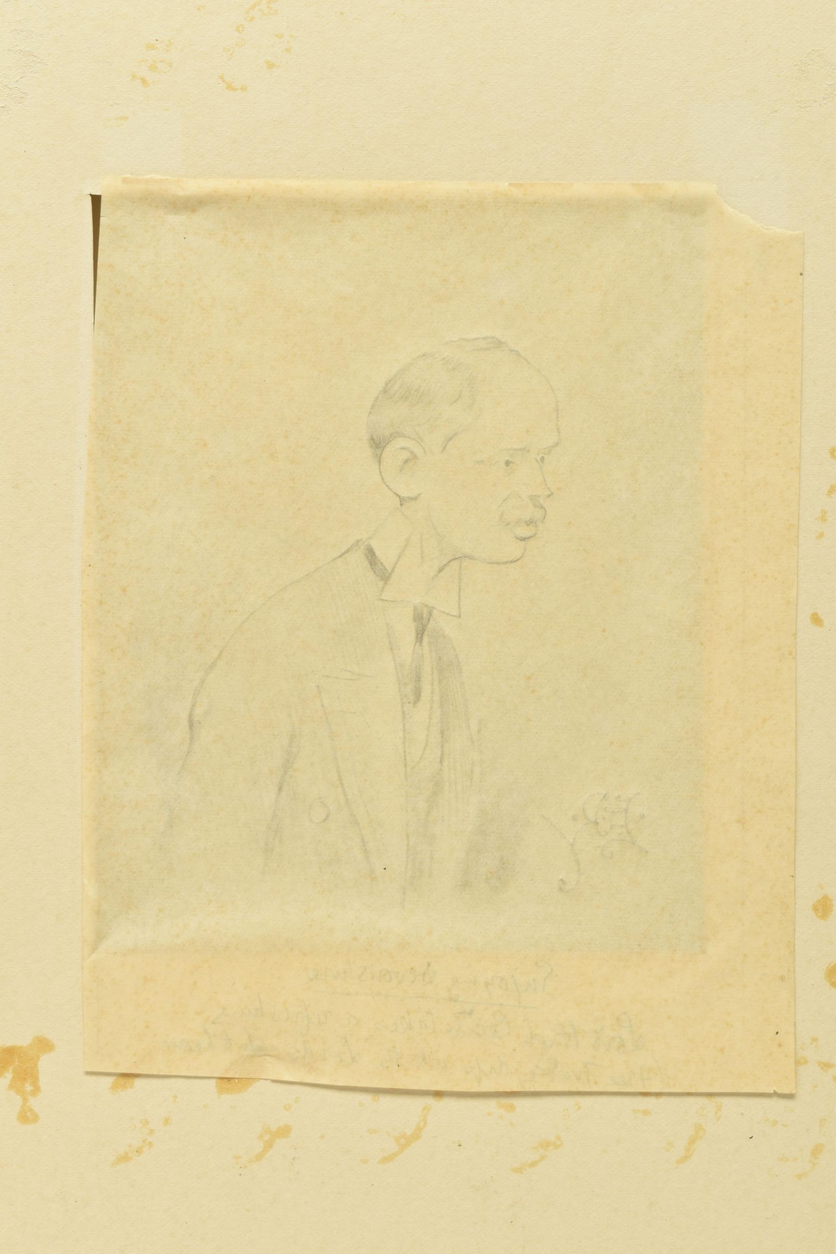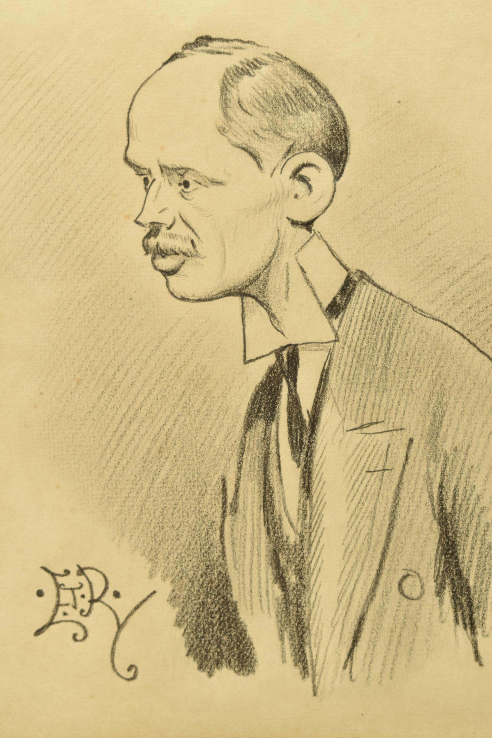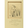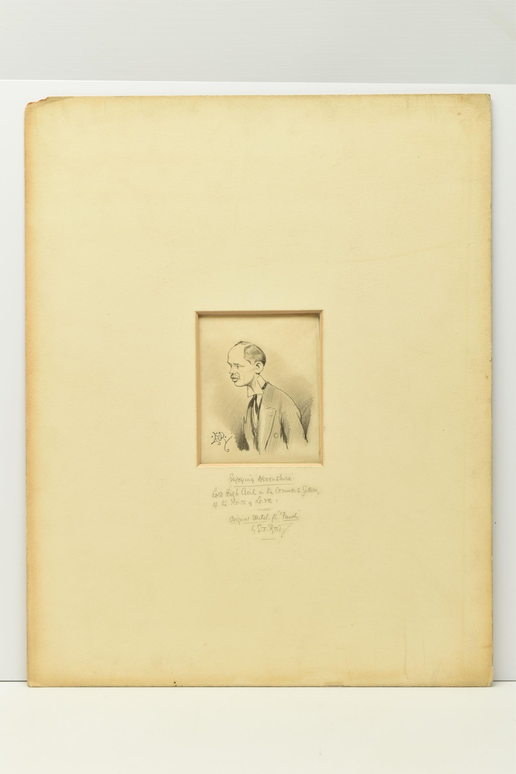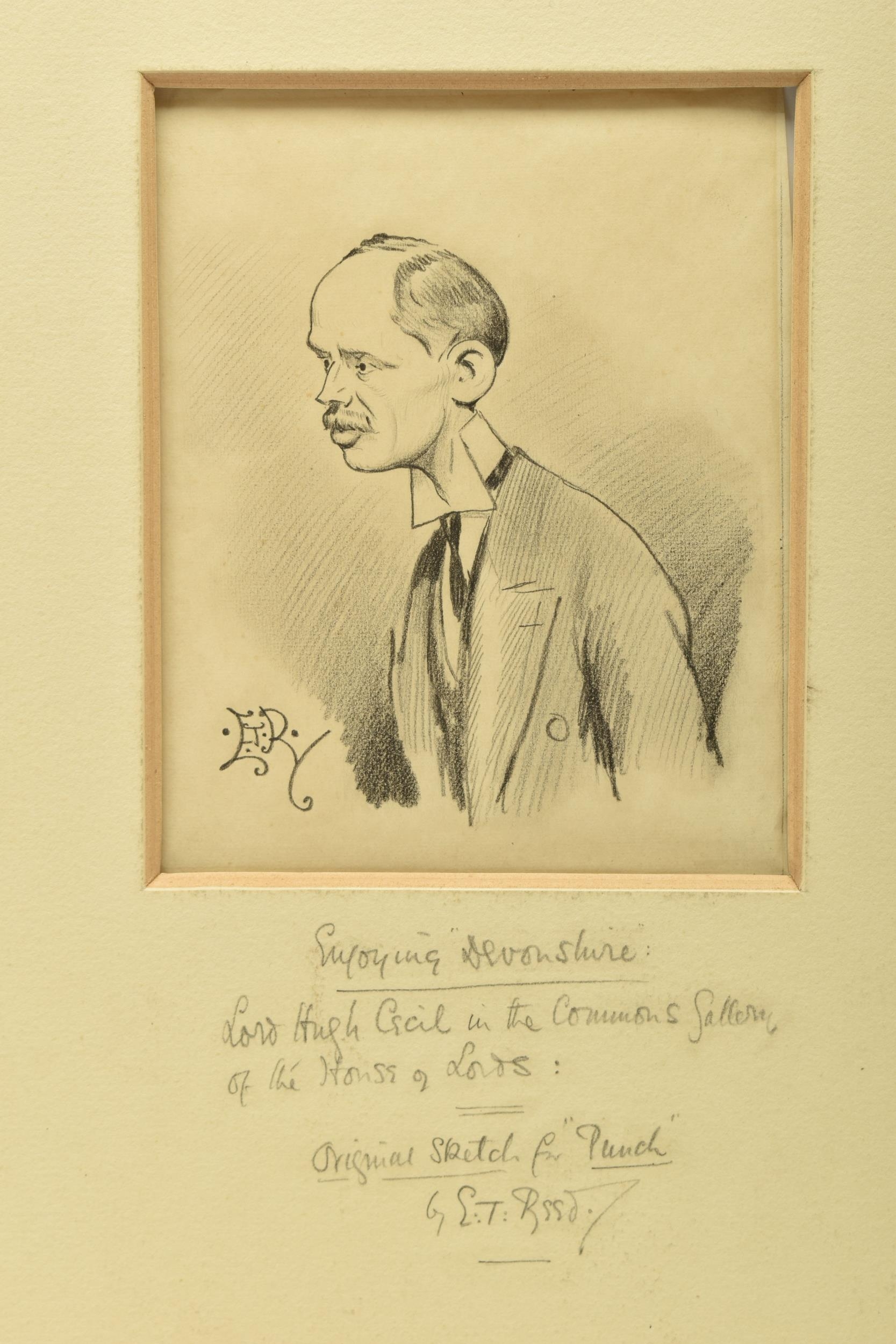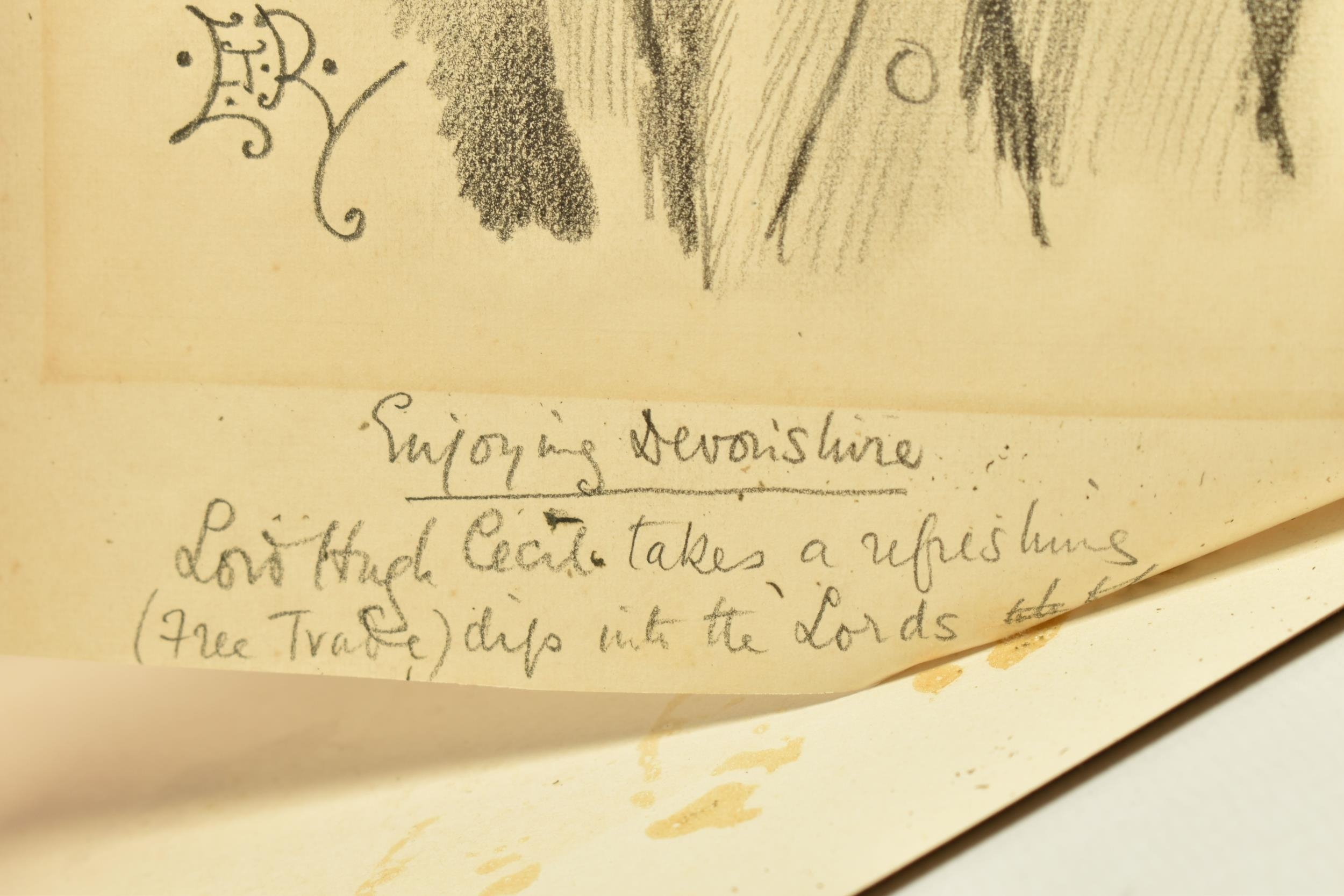 EDWARD TENNYSON REED (1860-1933) 'ENJOYING DEVONSHIRE', a political sketch for Punch magazine, text to the mount reads 'Lord Hugh Cecil in the Commons Gallery in the House of Lords', initialled to the sketch and signed to the mount, further text below the mount, pencil on paper, approximate size 12.5cm x 10cm, Condition Report: sketch is loose in the mount light discolouration to the paper, mount has dirty marks and damaged corners