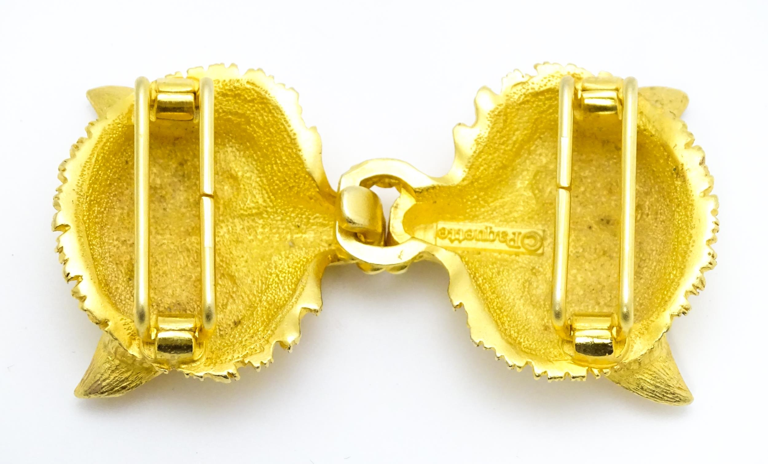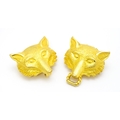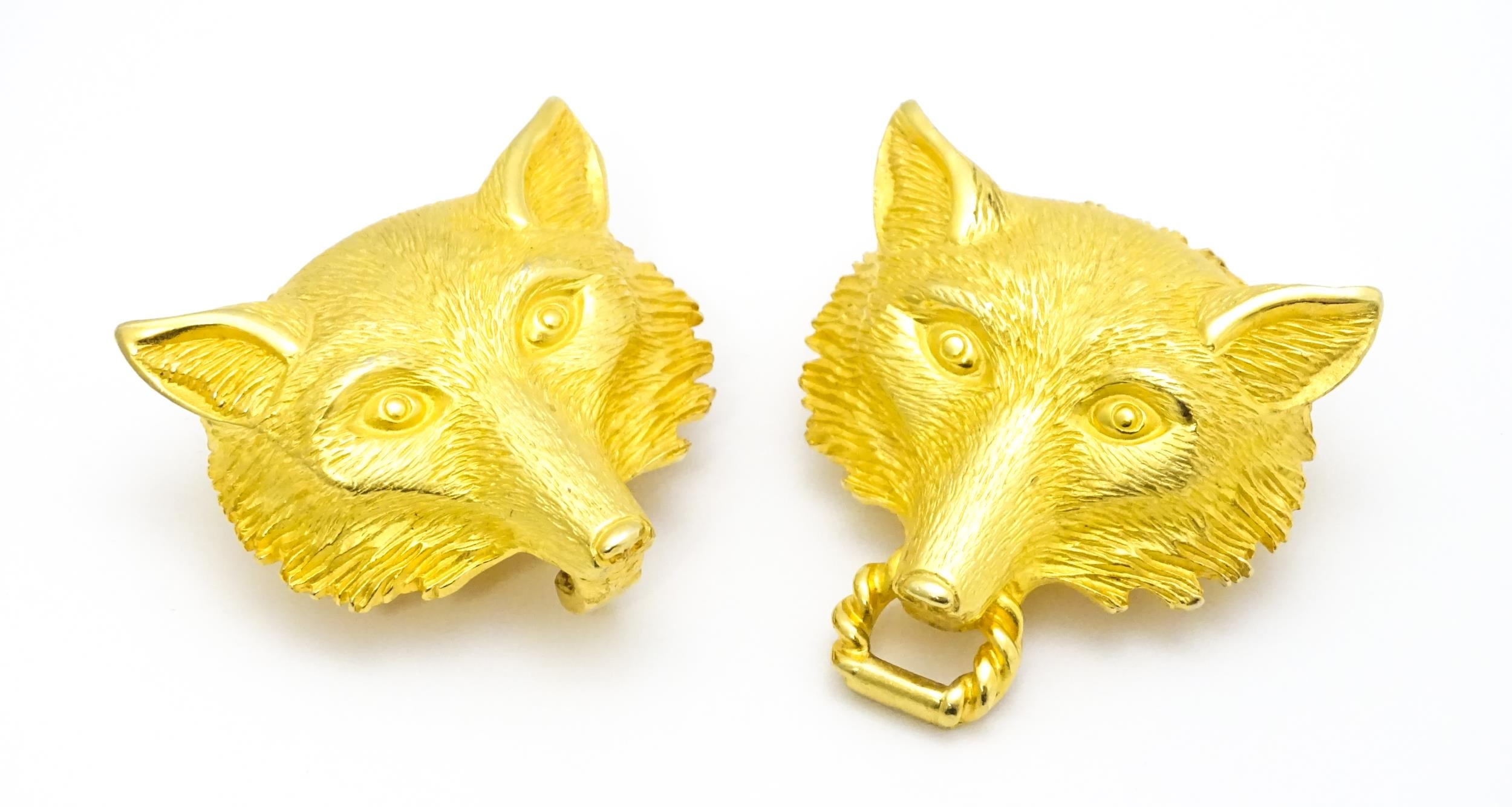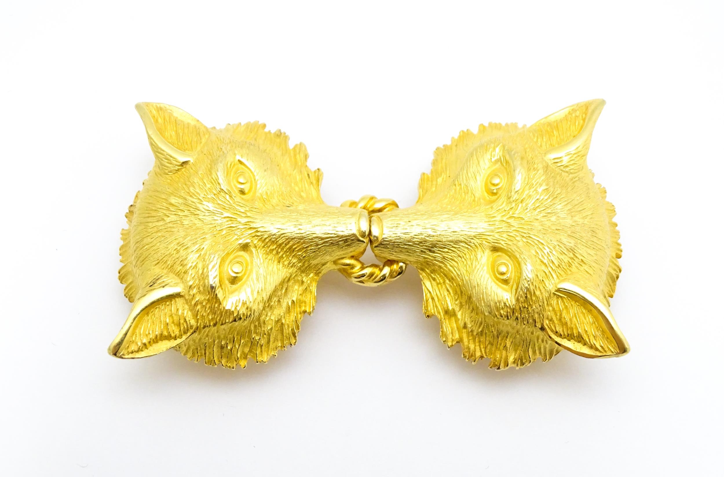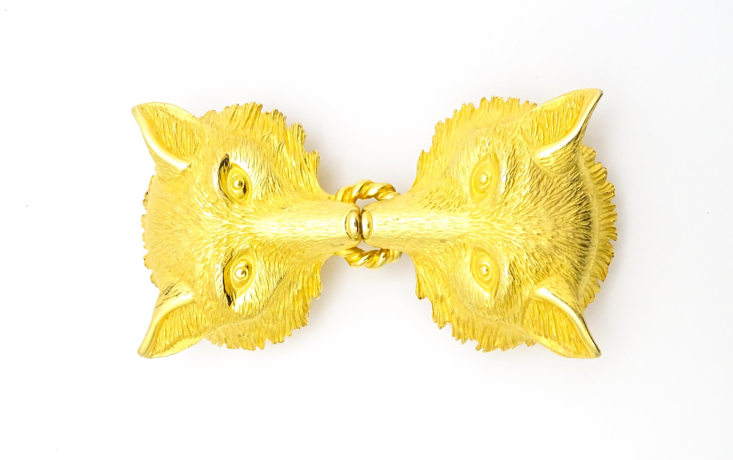 A gilt metal two part belt buckle with fox head detail by Paquette. Approx. 3 1/2" wide overall