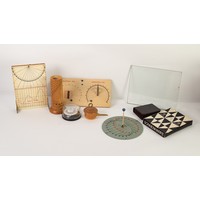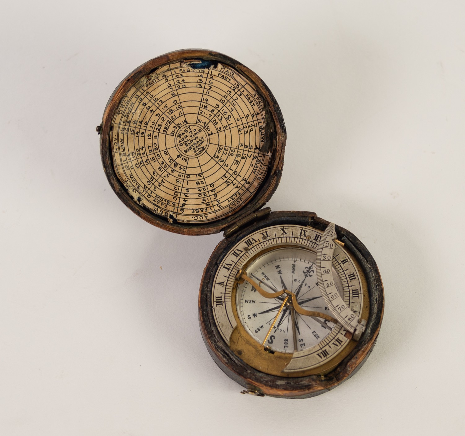 BAKER OF LONDON 19th CENTURY POCKET COMPASS AND SUNDIAL, with fold-down 90 degree quadrant and hinged silvered dial with brass sighting needle, in BLACK MOROCCO CLAD SOFT WOOD CIRCULAR CASE, with monthly paper chart to underside of hinged cover (case with wear and losses)