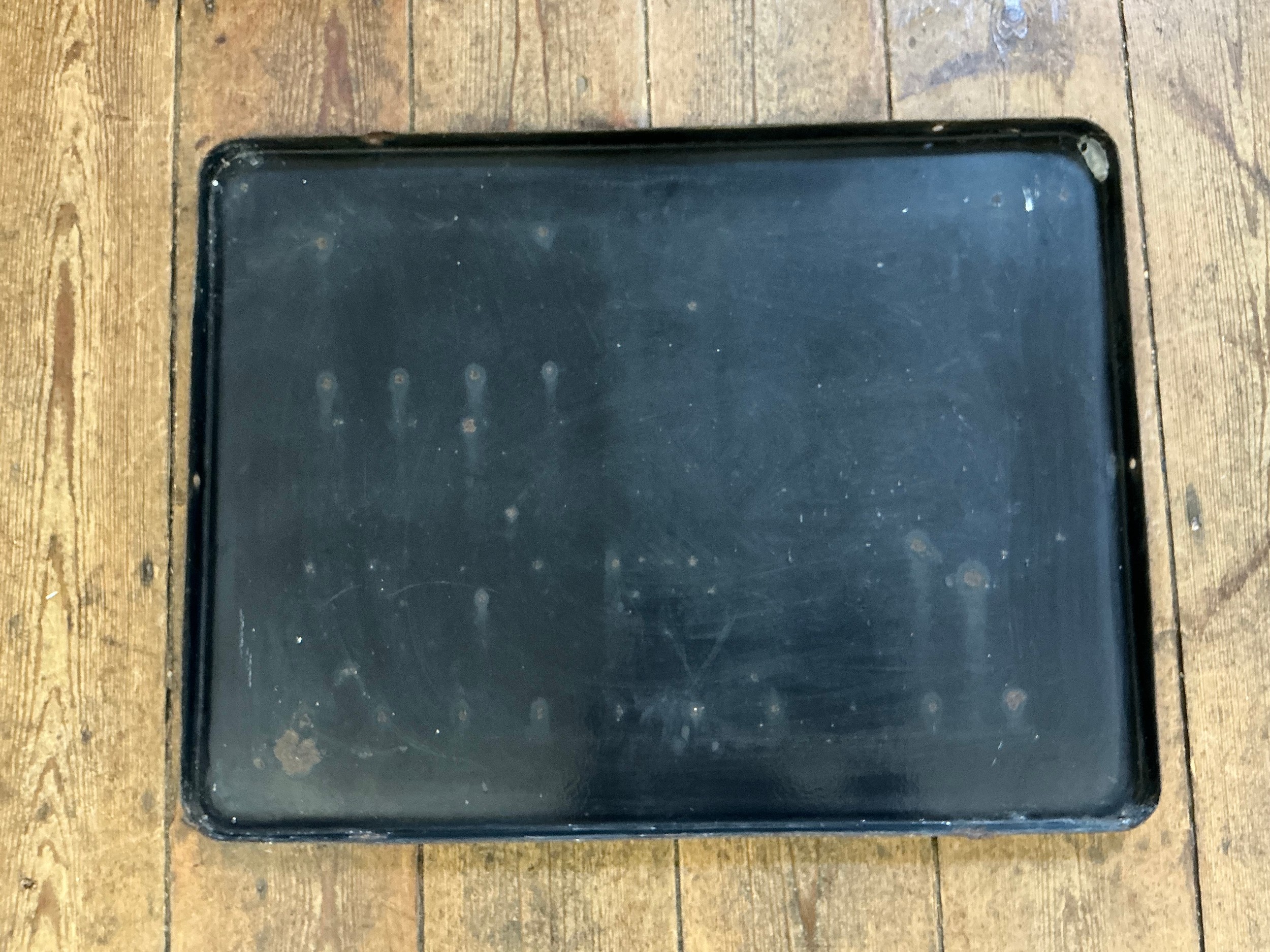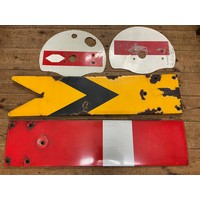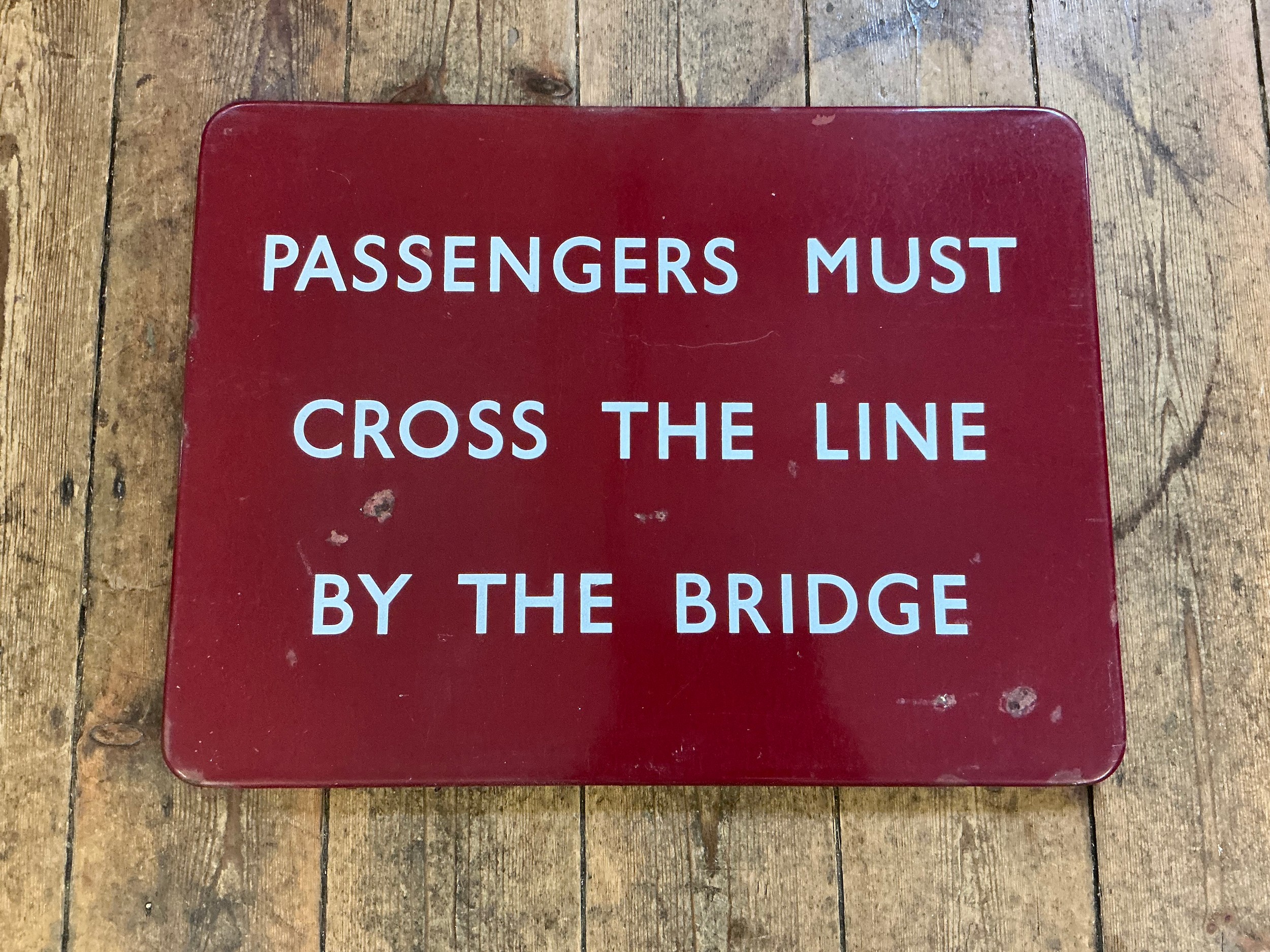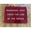 An Original Vintage Railway Station Tin/Enamel Sign "PASSENGERS MUST CROSS THE LINE BY THE BRIDGE" in Dark Maroon & White. Measuring: 61cms x 45cms.