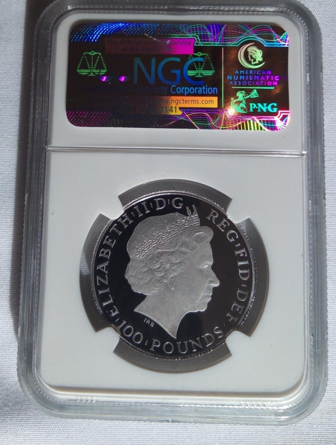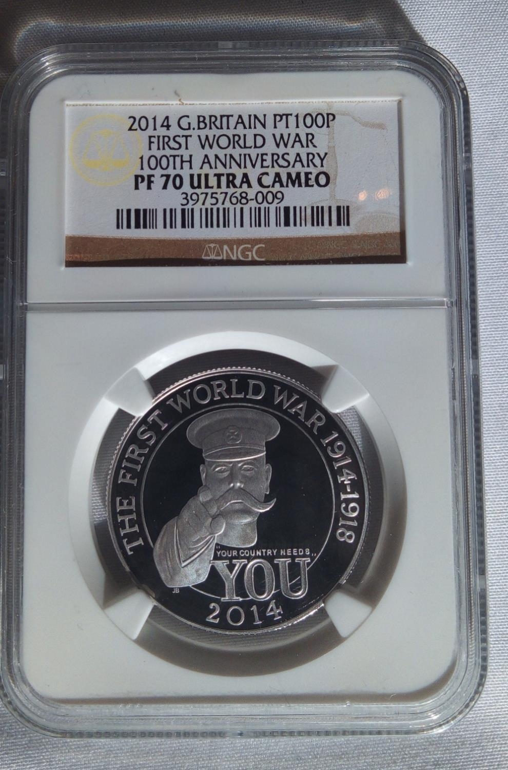 The First World War 100th Anniversary £100 coin, with Lord Kitchener cameo to reverse, in a protective NGC capsule.