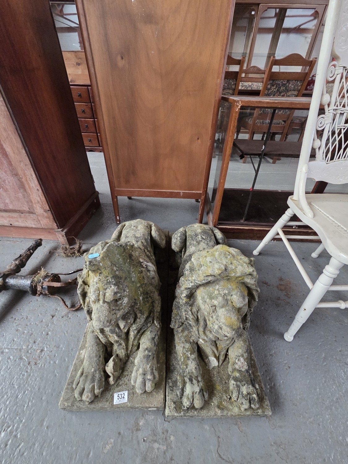 A pair of early recumbent lion sculptures fashioned from cast reconstituted stone - Height 46cm, length, 84cm