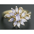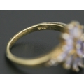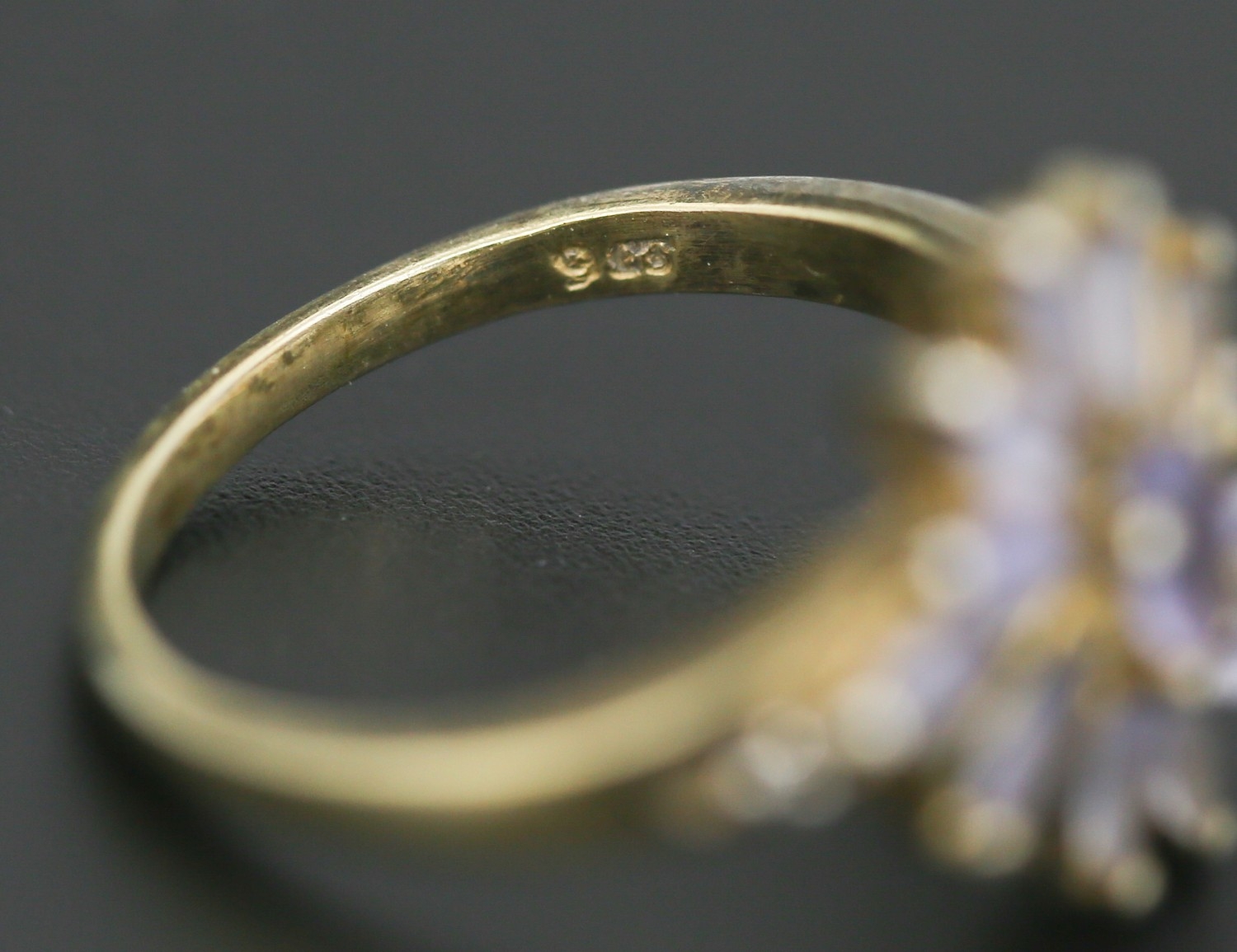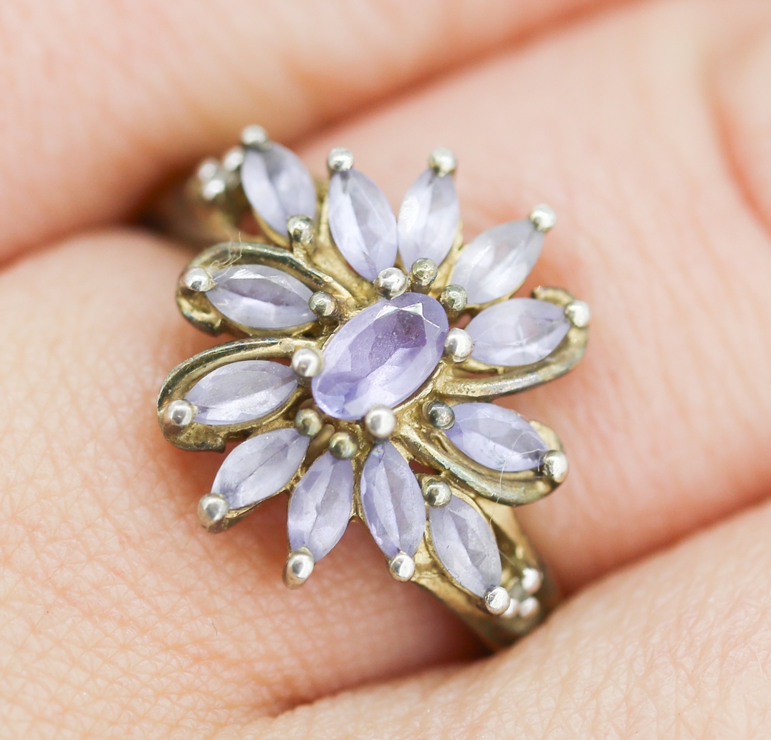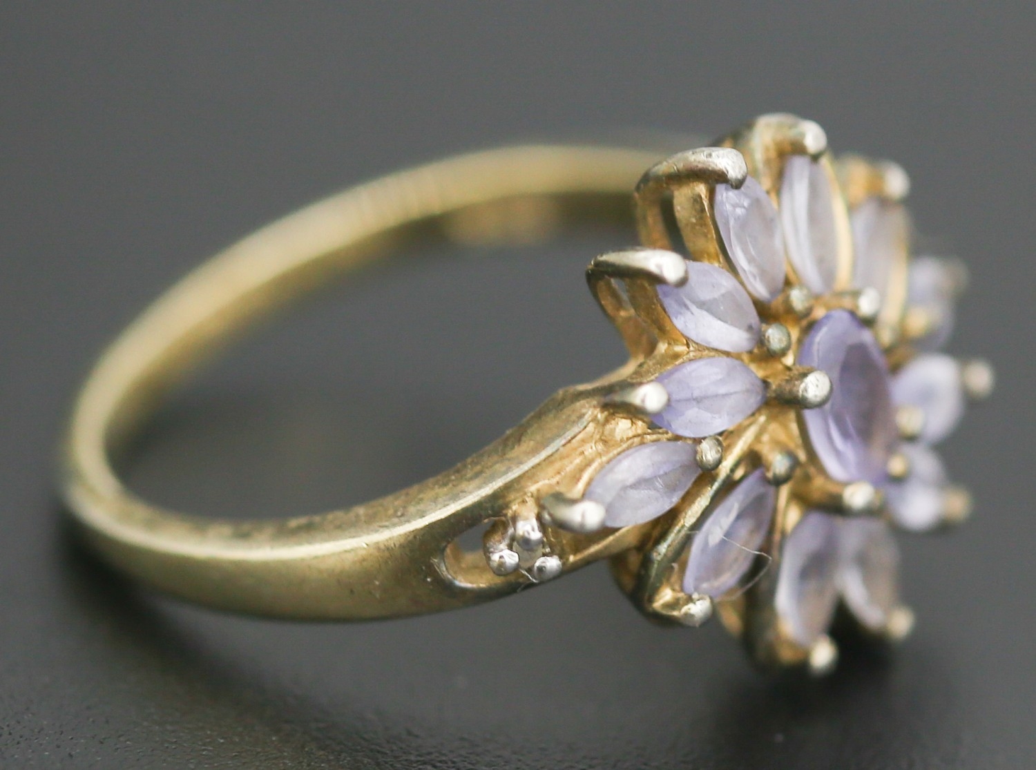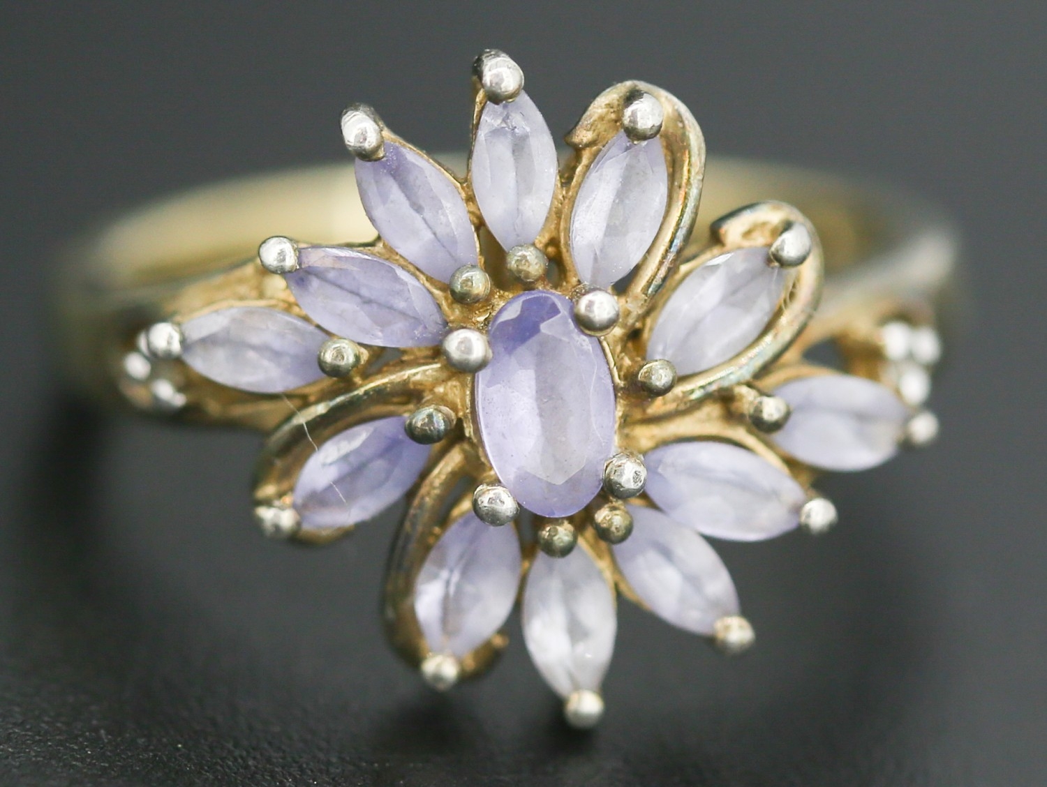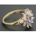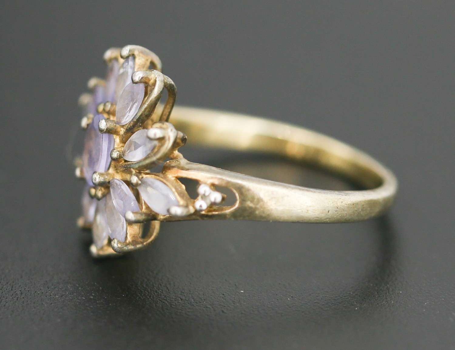 Marquise Cut Pale Tanzanite Set Floral Motif Cluster Ring Mounted in 9 Carat Yellow Gold Ring Size N and a Half