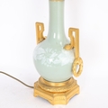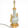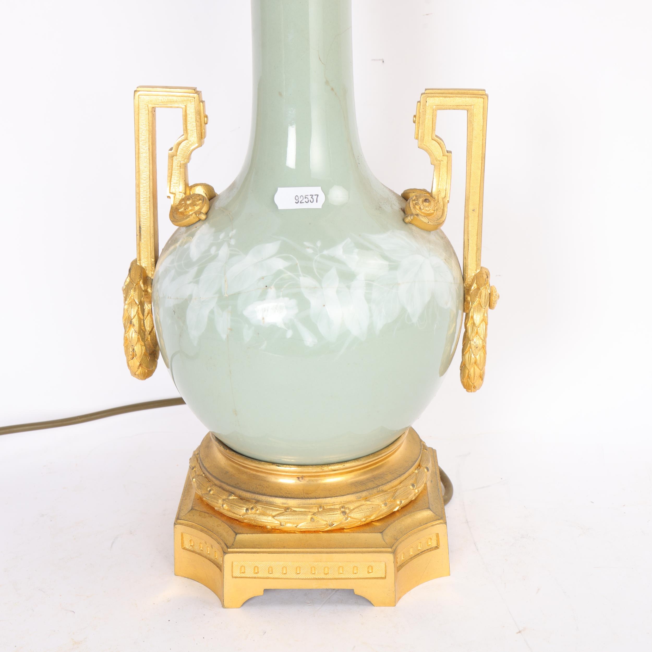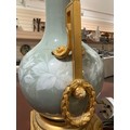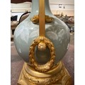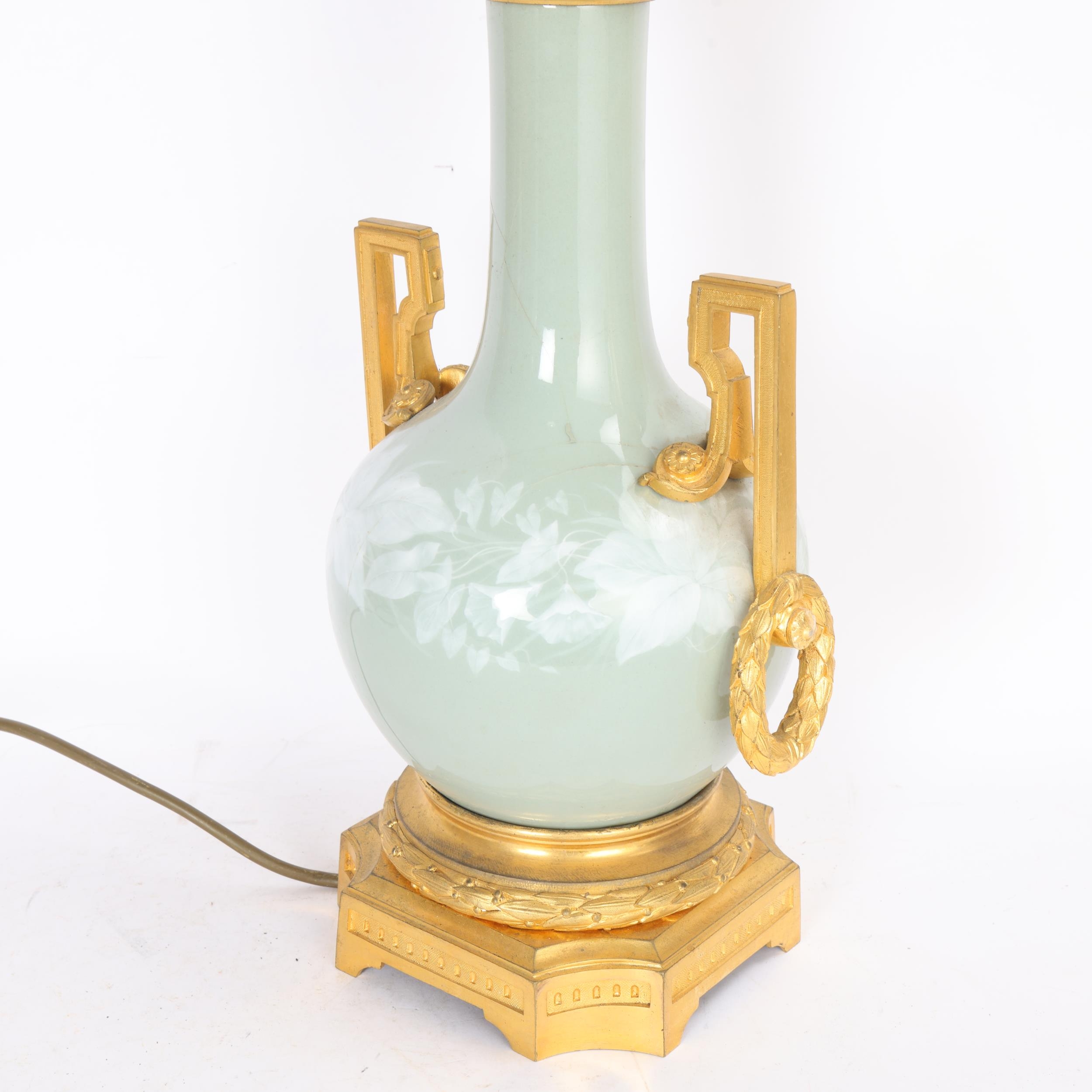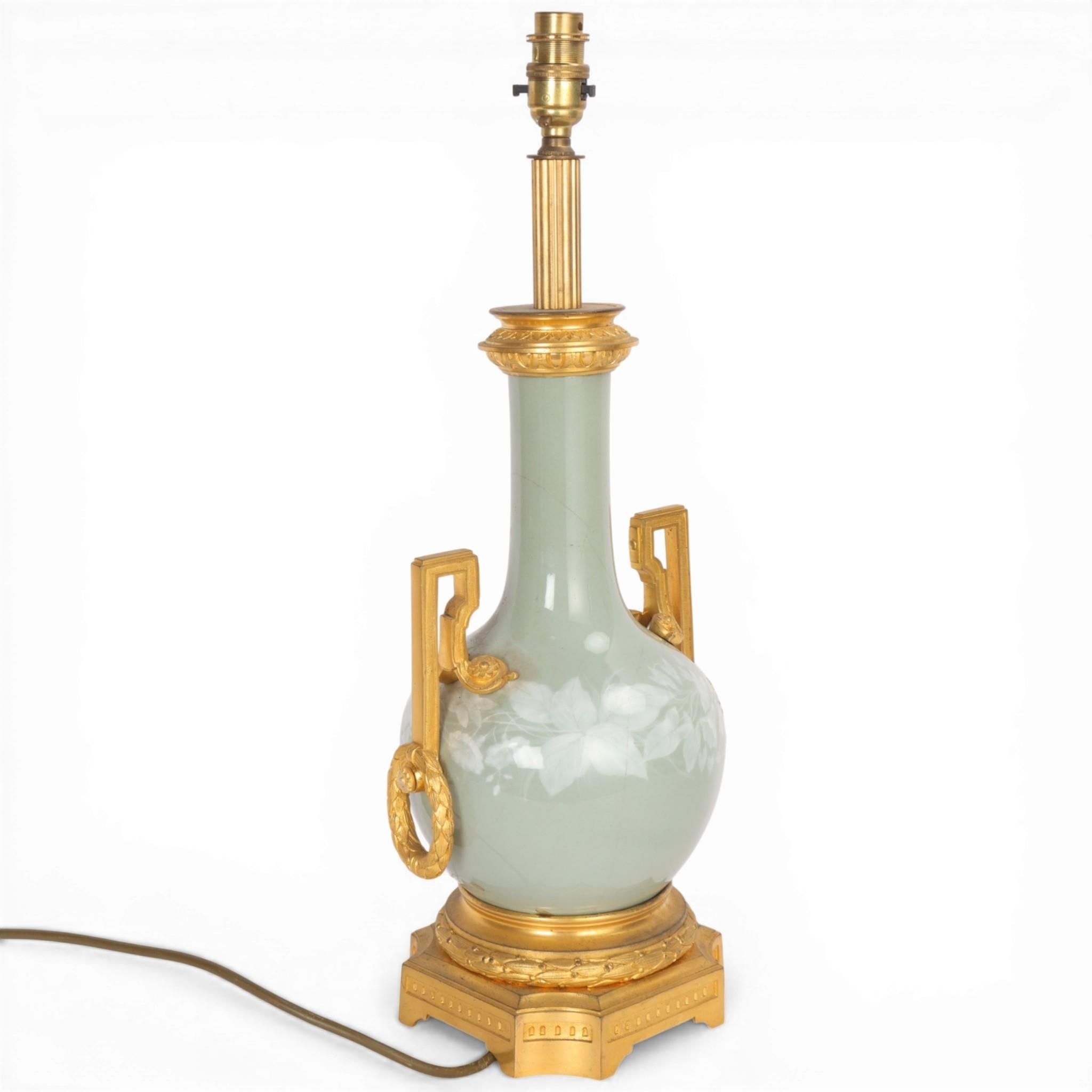 A 19th century French porcelain and ormolu mounted table lamp, overall height including fitting 52cm