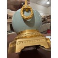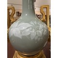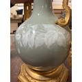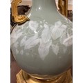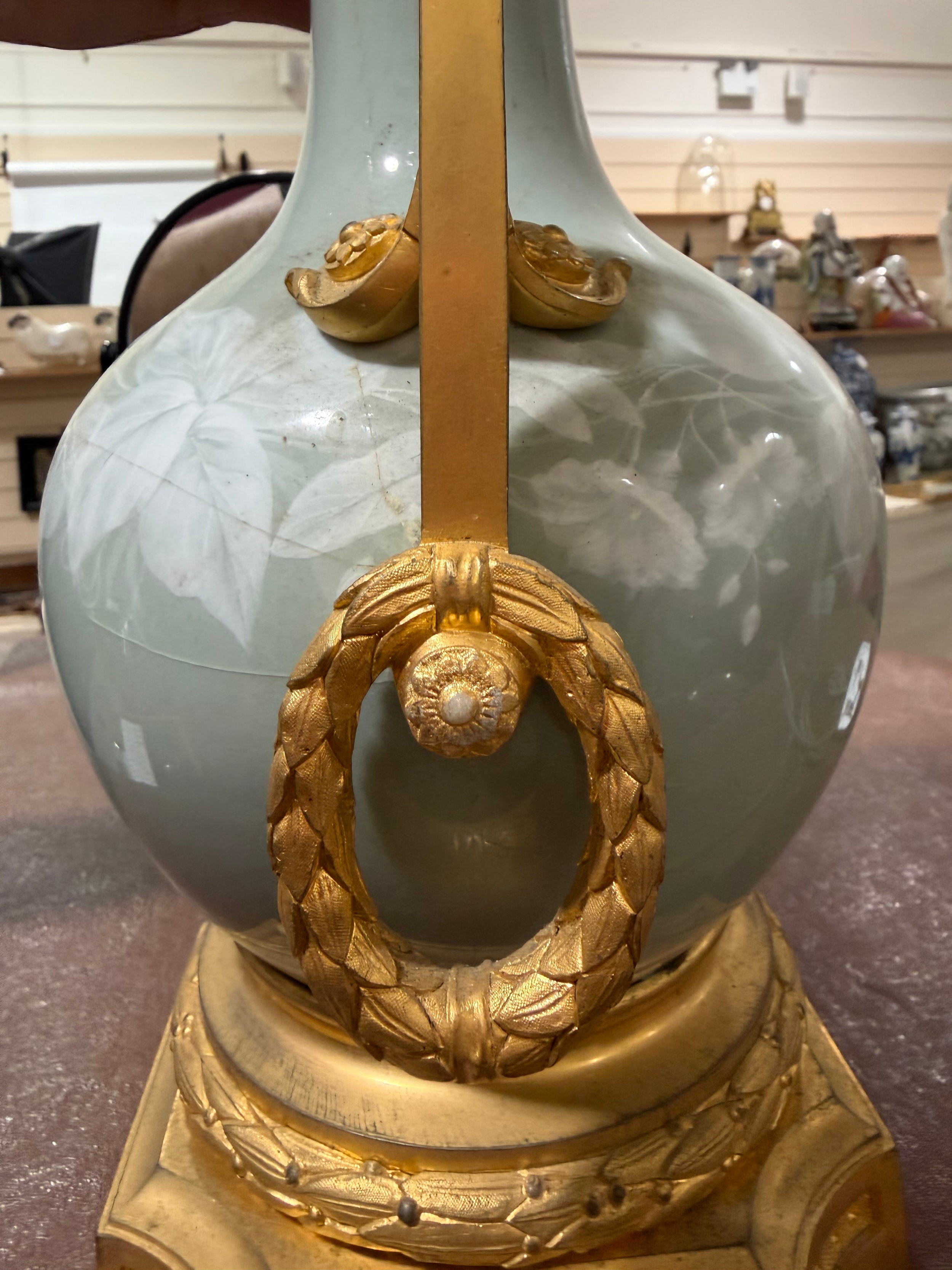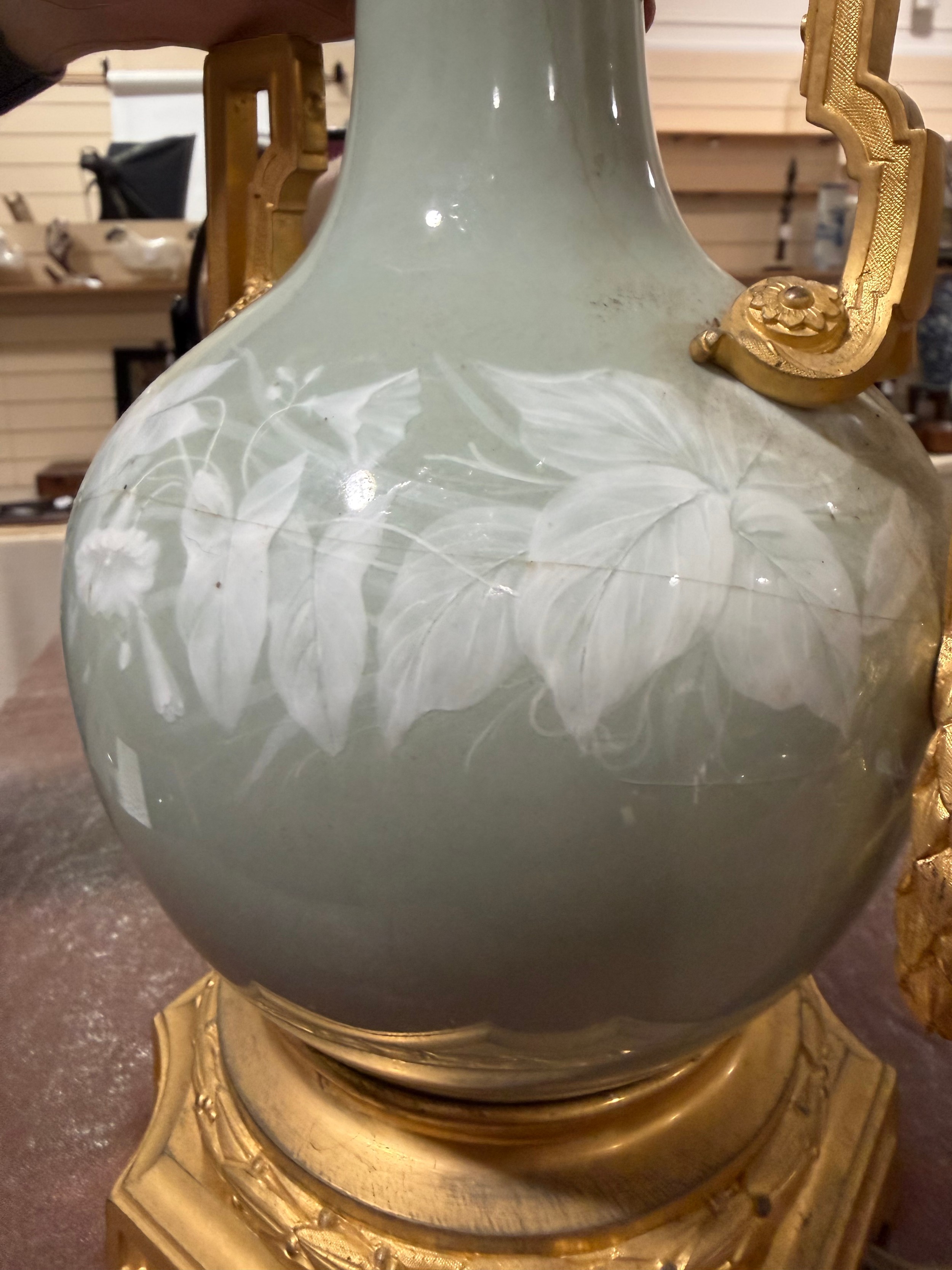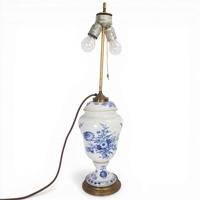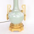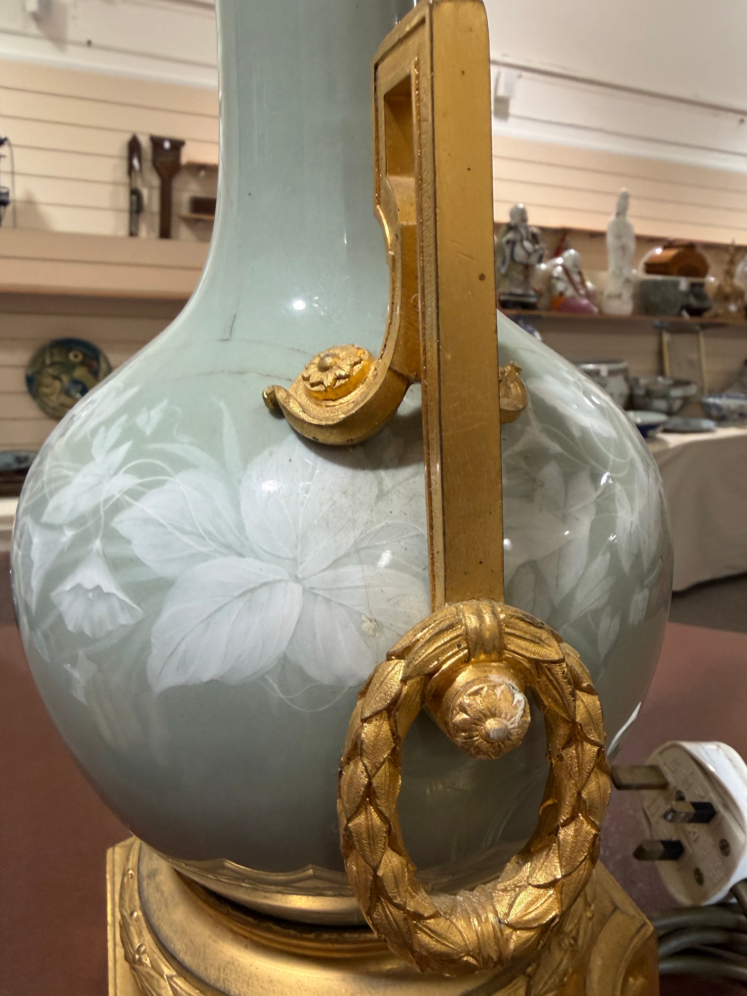 A 19th century French porcelain and ormolu mounted table lamp, overall height including fitting 52cm