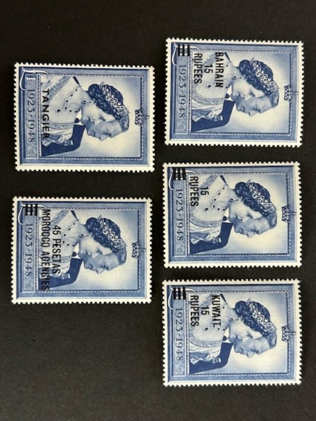 Omnibus Issues 1948 Wedding overprints on £1 for Bahrain, BPAEA, Kuwait, Morocco & Tangier, virtually U/M. (5) (S)