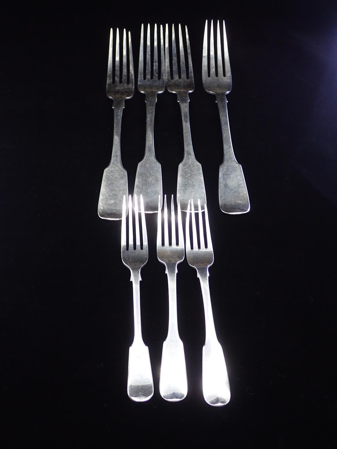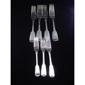 Four Irish silver dinner forks and a two silver dessert forks (total weight 386 grams) and a silver plated dessert fork