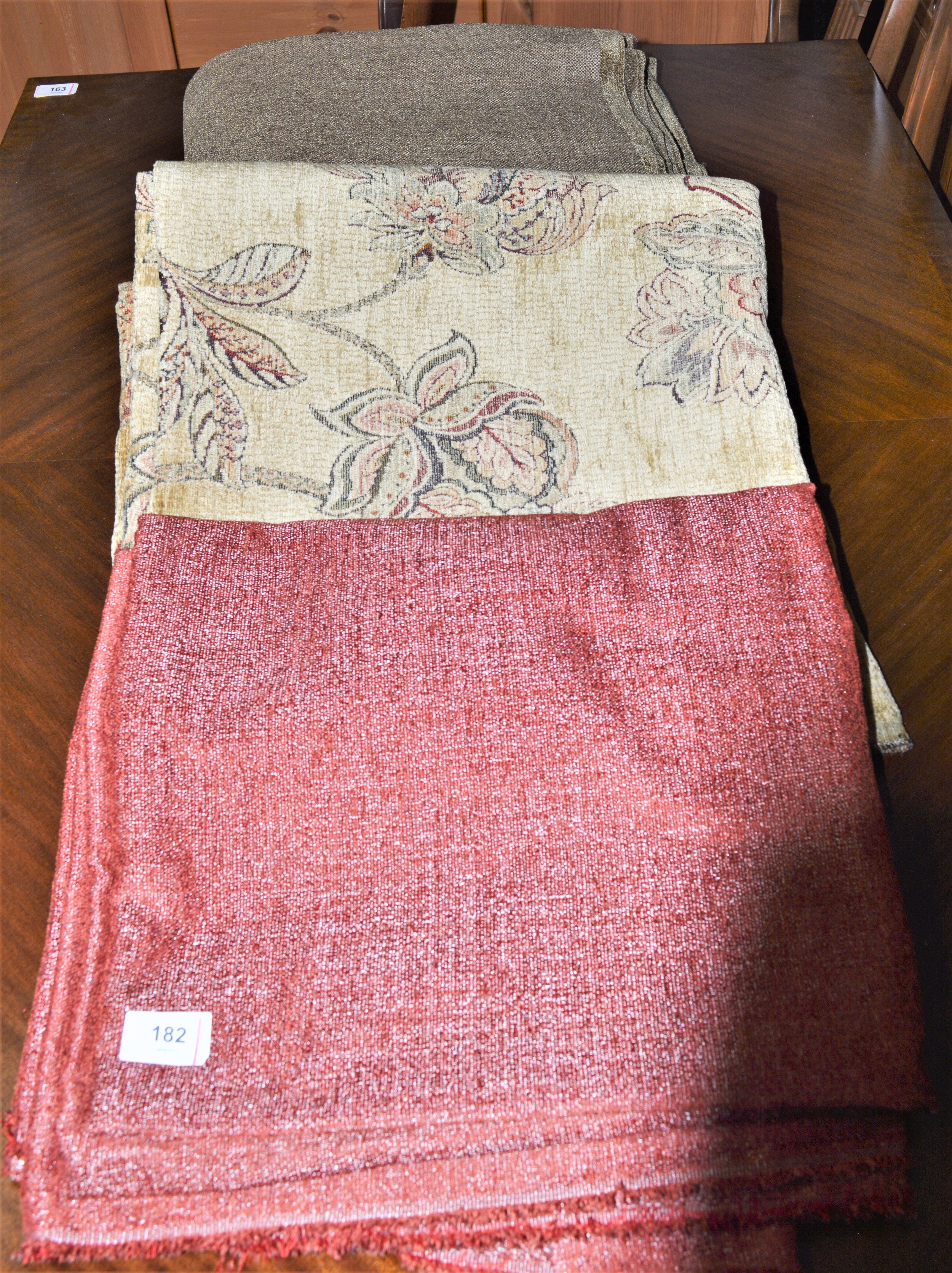 Three Bolts of Fabric: Heavy Duty Upholstery (Gold Background with Floral Colour Detail - 148 cm Width x 240 cm Length), Upholstery/Curtain Fabric (Tobacco Colour - 145 cm Width x 450 cm Length), Curtain Fabric (Berry Colour - 140 cm Width x 270 cm Length)
