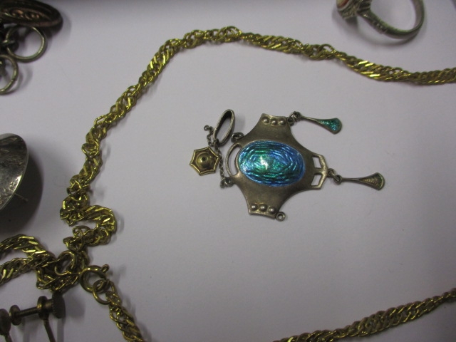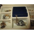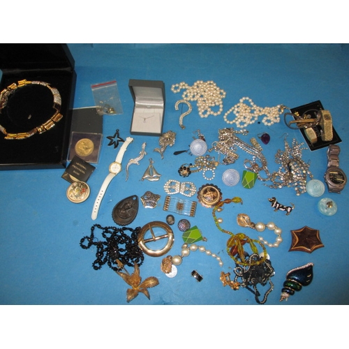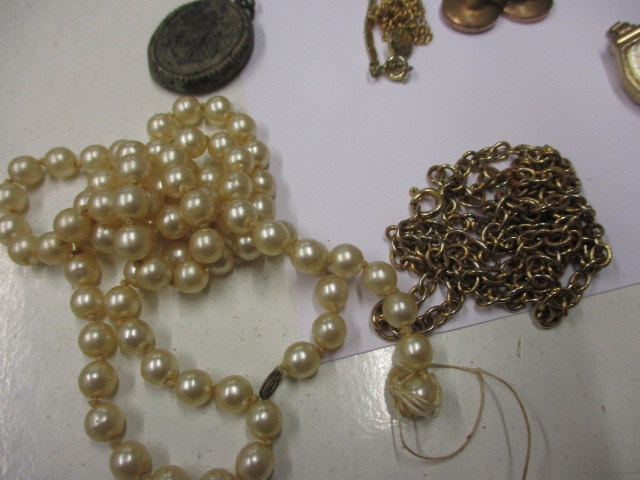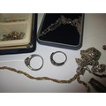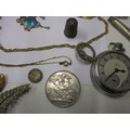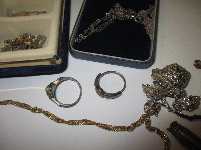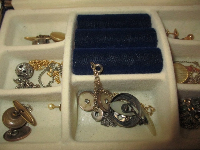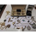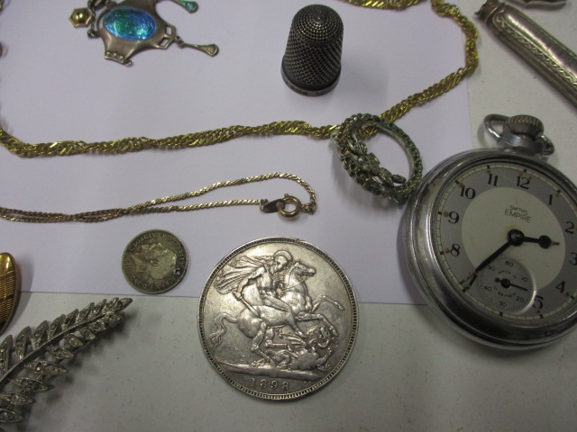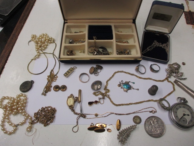 A jewellery box with contents, to include some silver items and a Victorian crown dated 1898, all in used condition