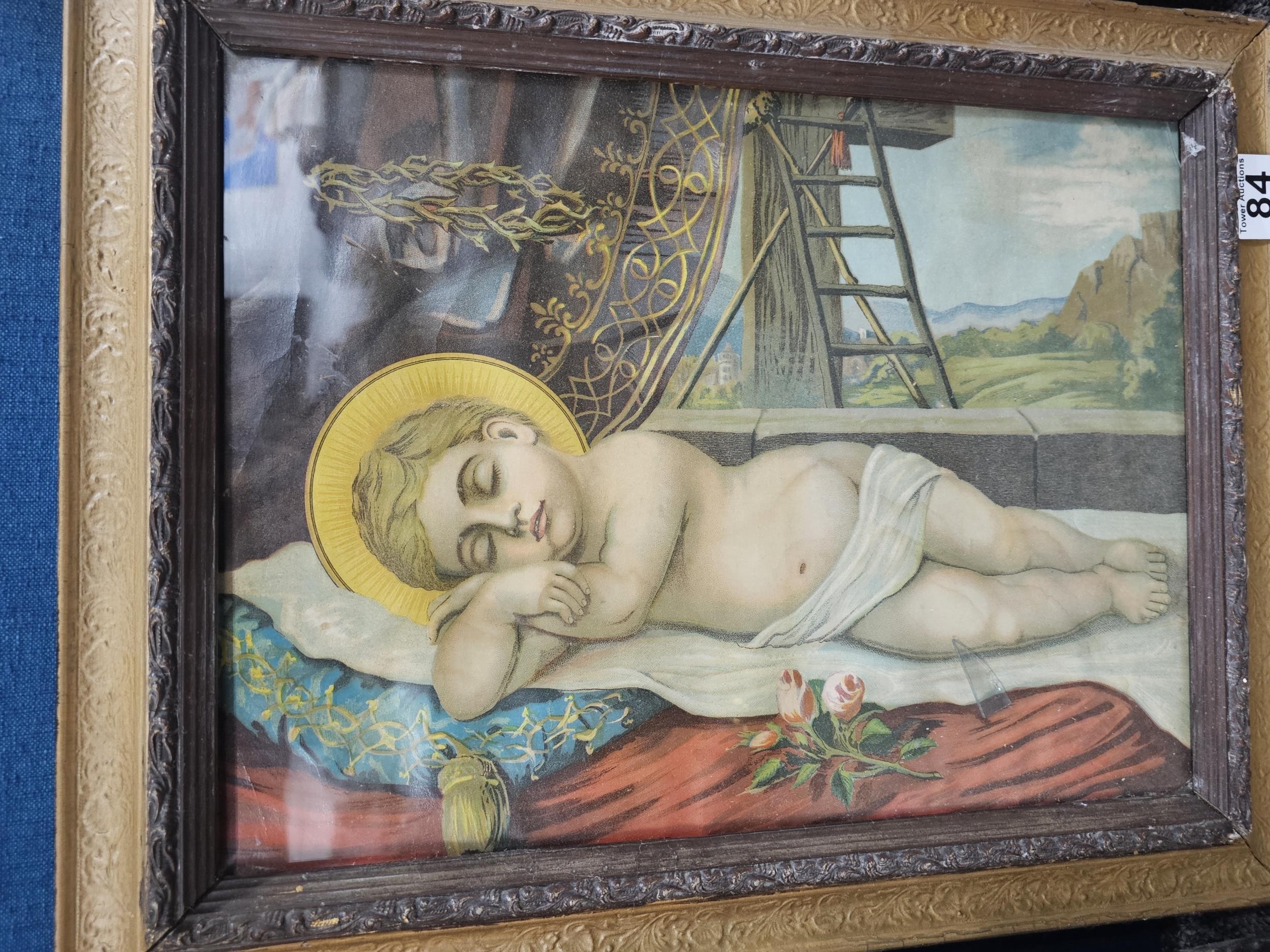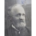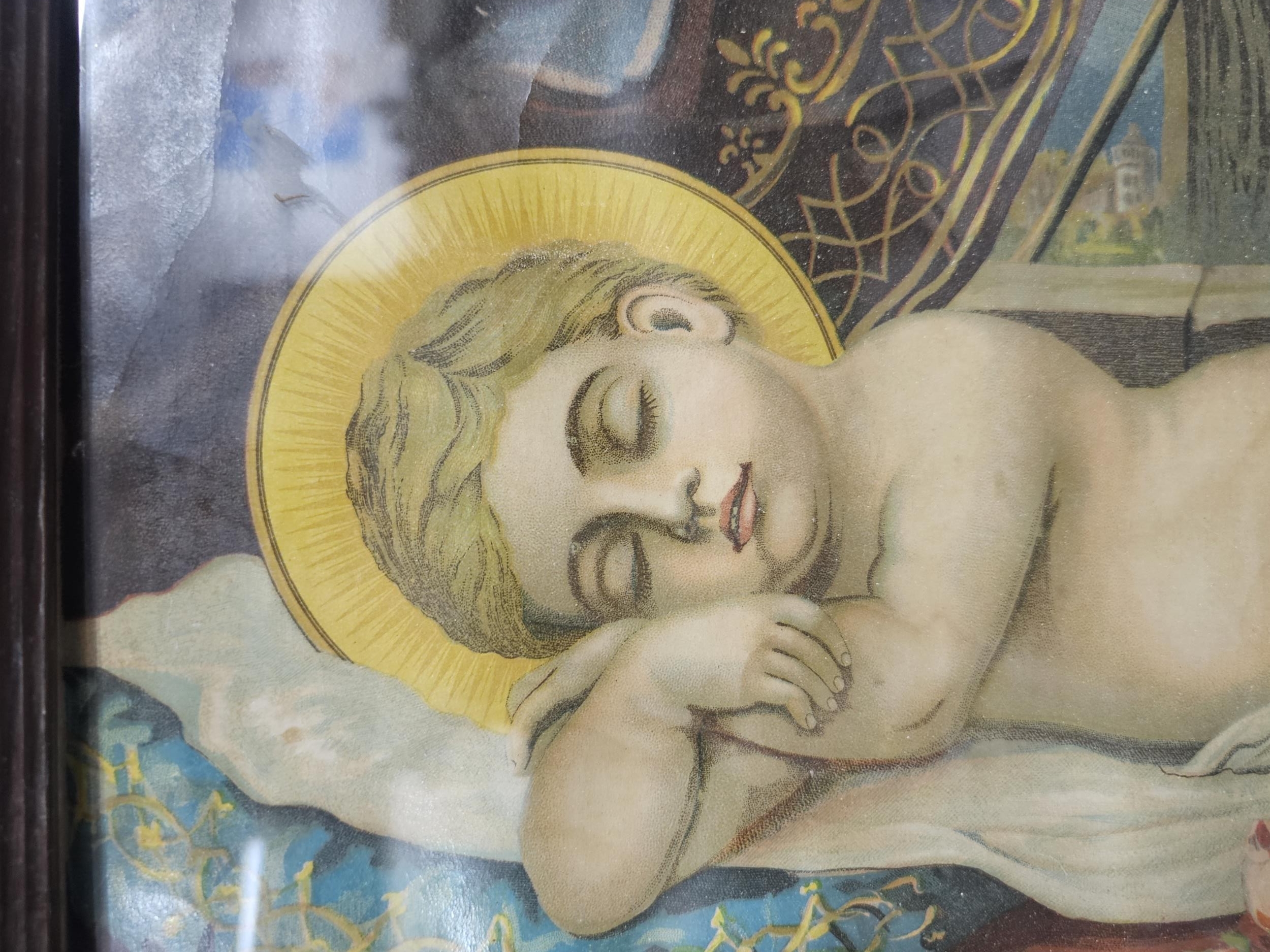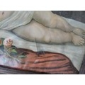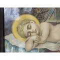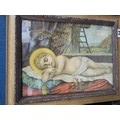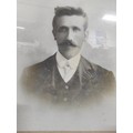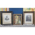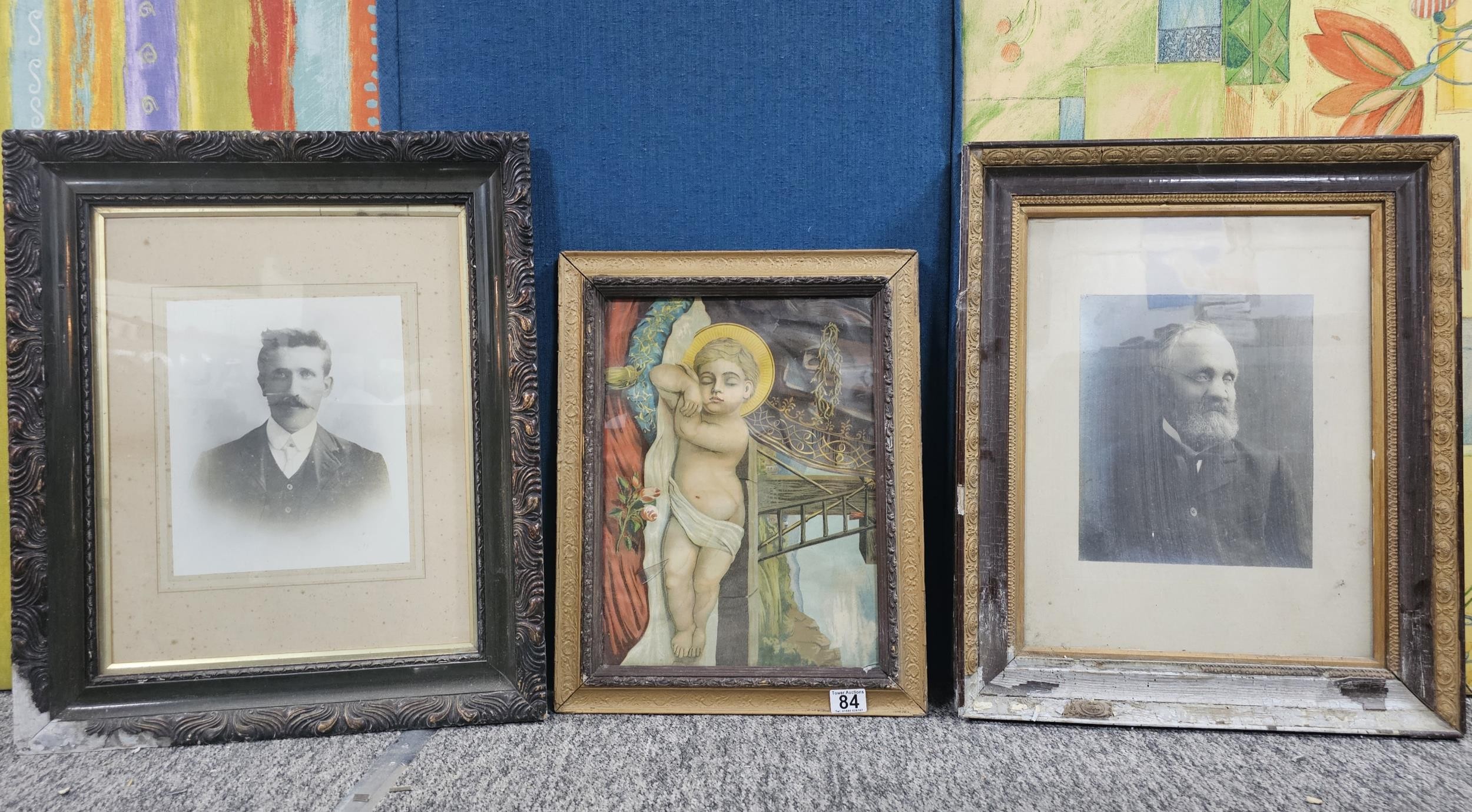 A collection of 3x pictures to include 2x antique photographs of two gentlemen, one appears to be bling in one eye, both frames are in need of restoration along with a print of a sleeping angelic child. largest photo frame measures 62cm high by 50cm wide