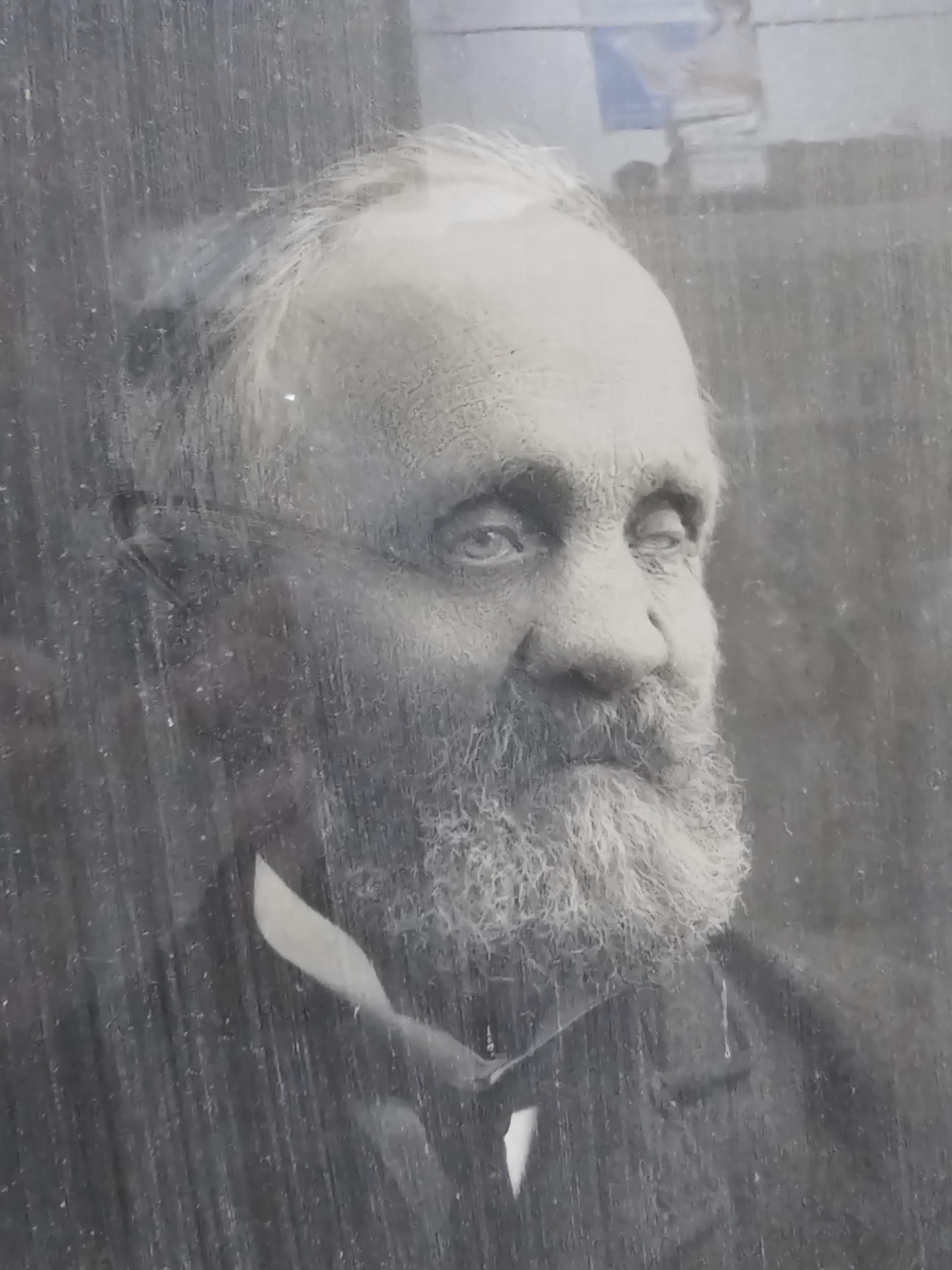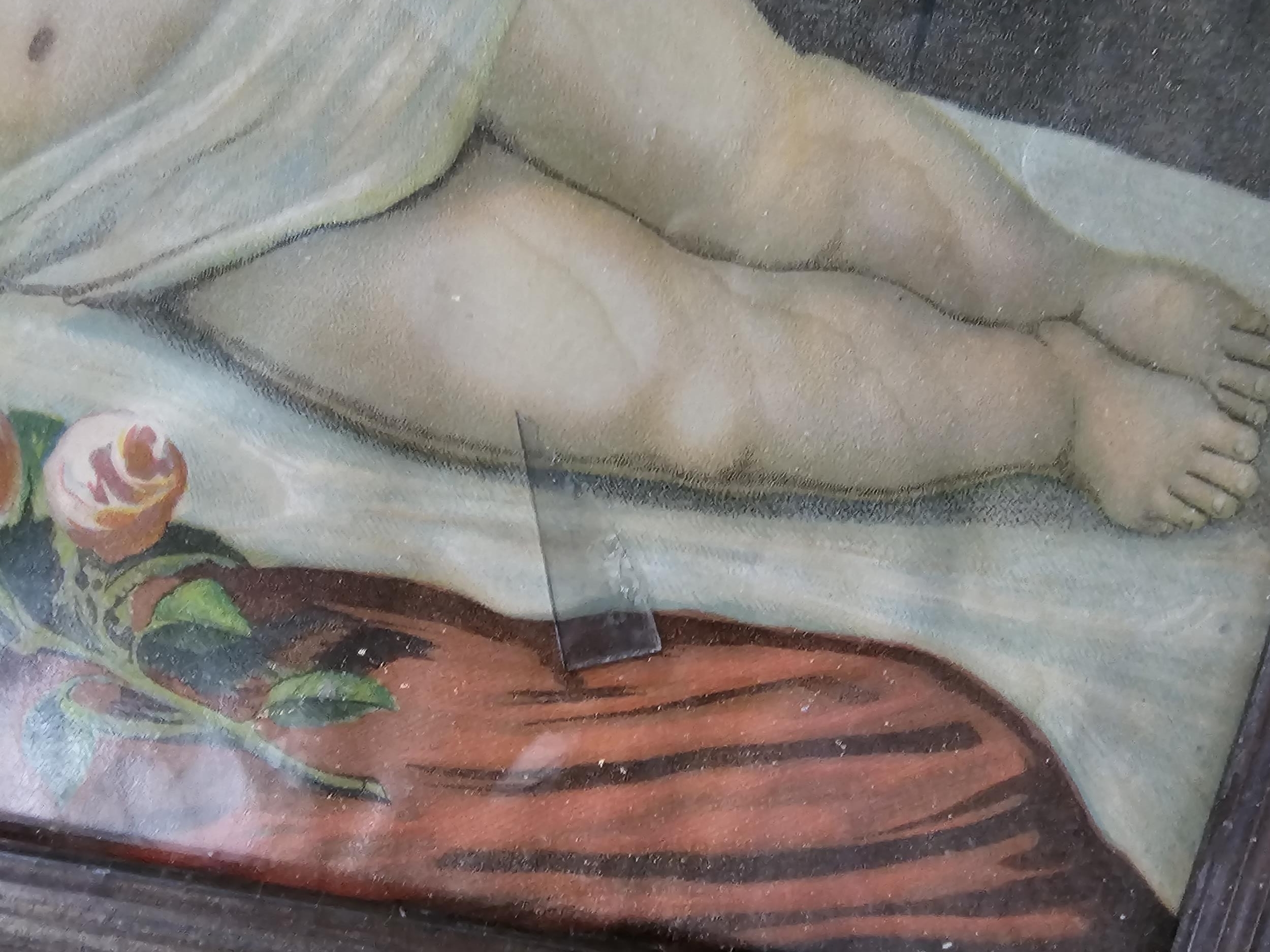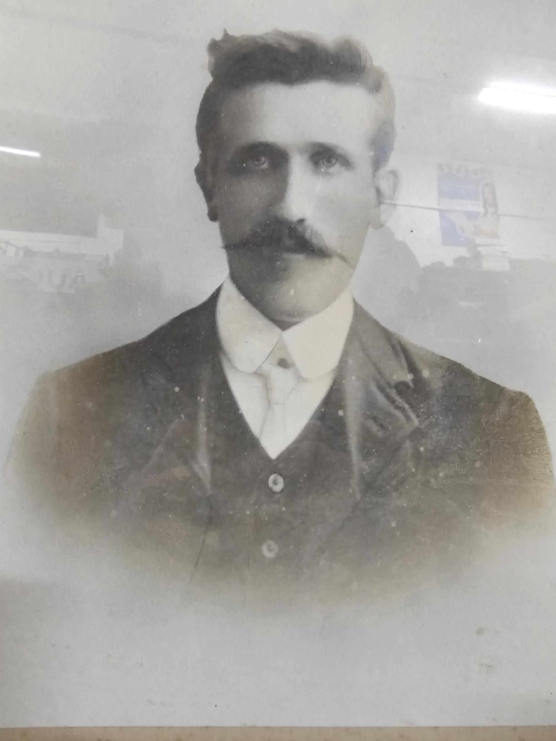 A collection of 3x pictures to include 2x antique photographs of two gentlemen, one appears to be bling in one eye, both frames are in need of restoration along with a print of a sleeping angelic child. largest photo frame measures 62cm high by 50cm wide