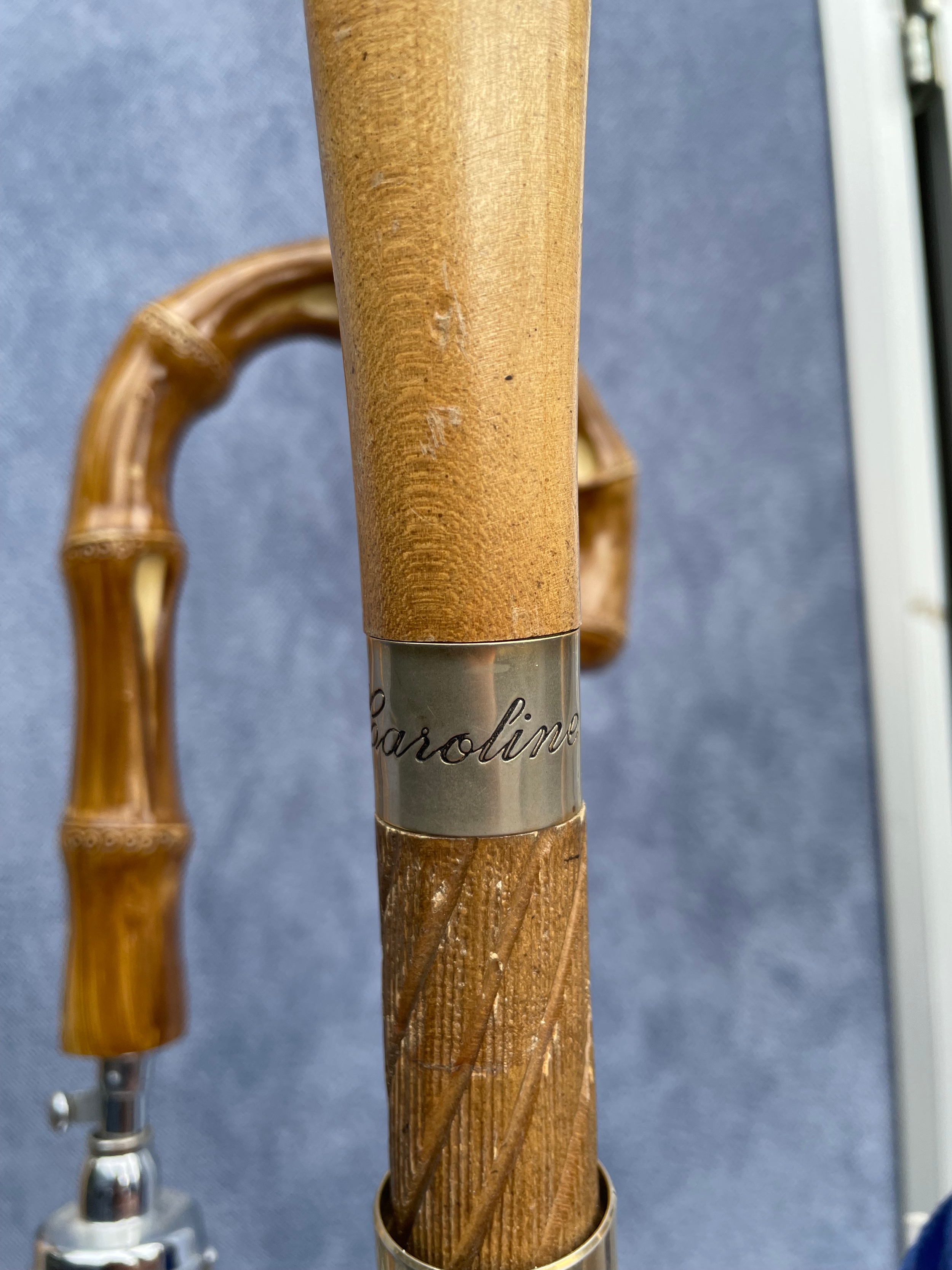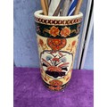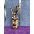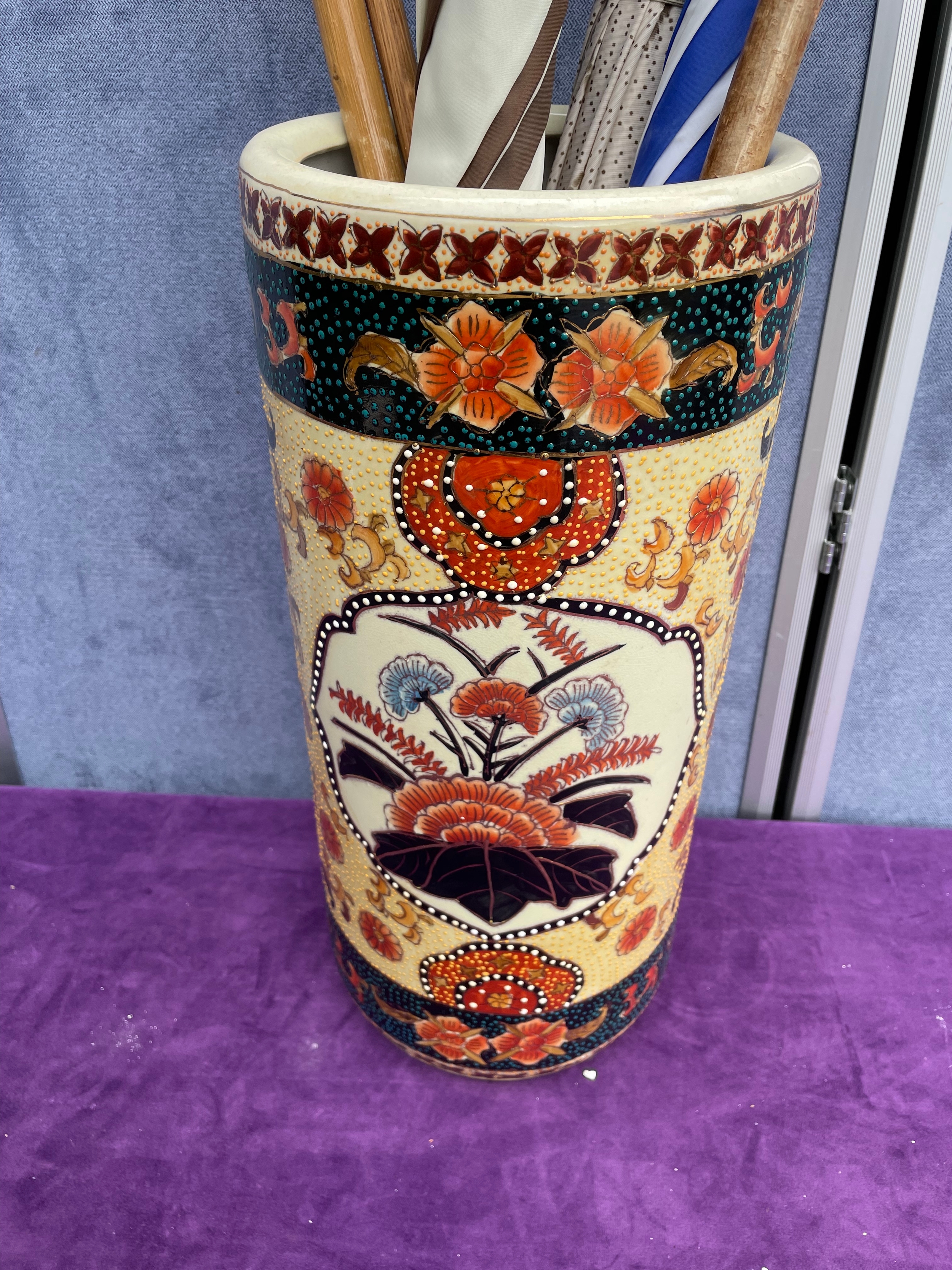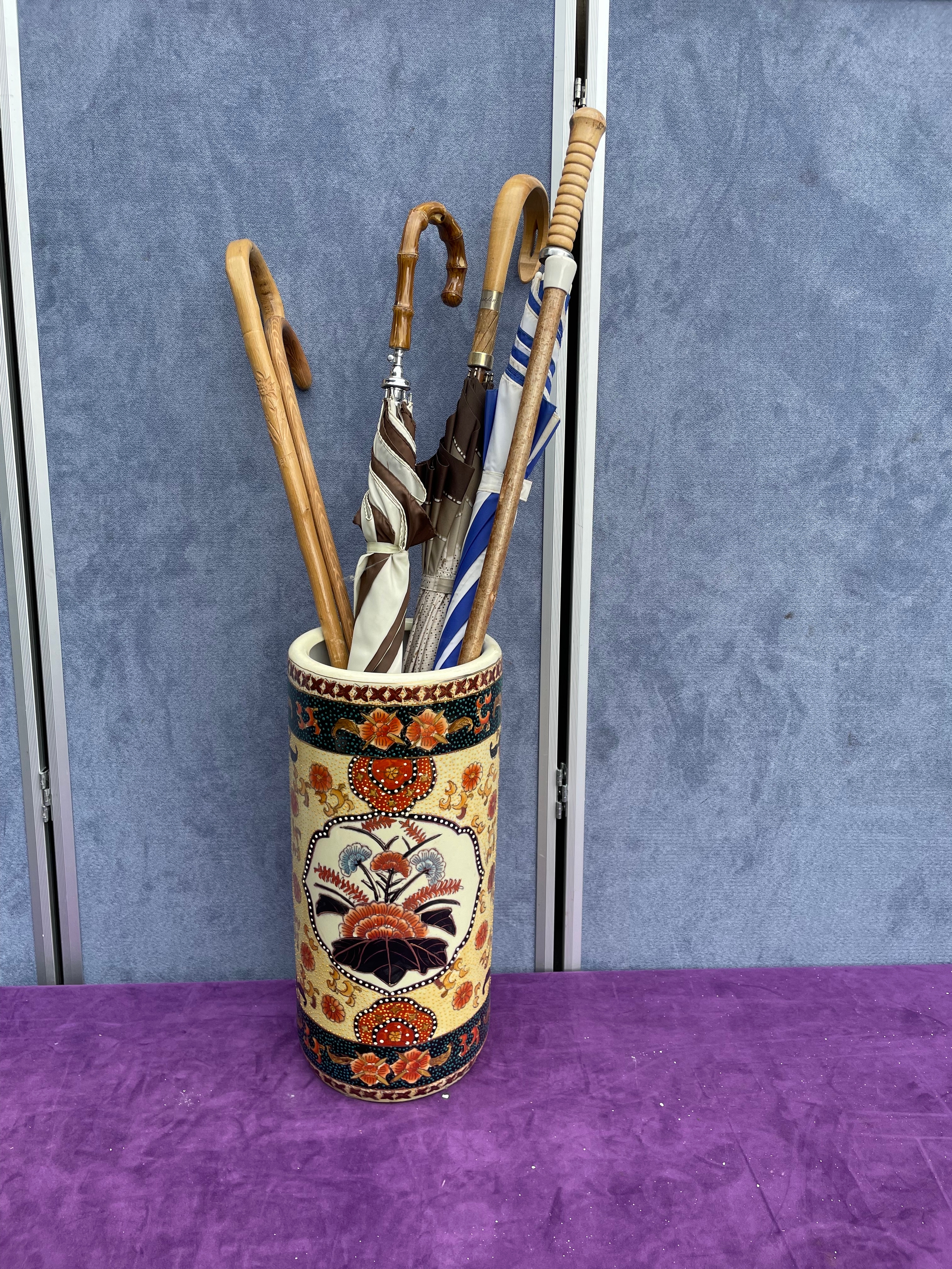 Decorative Ceramic Umbrella/stick stand with wooden walking sticks and Umbrellas.