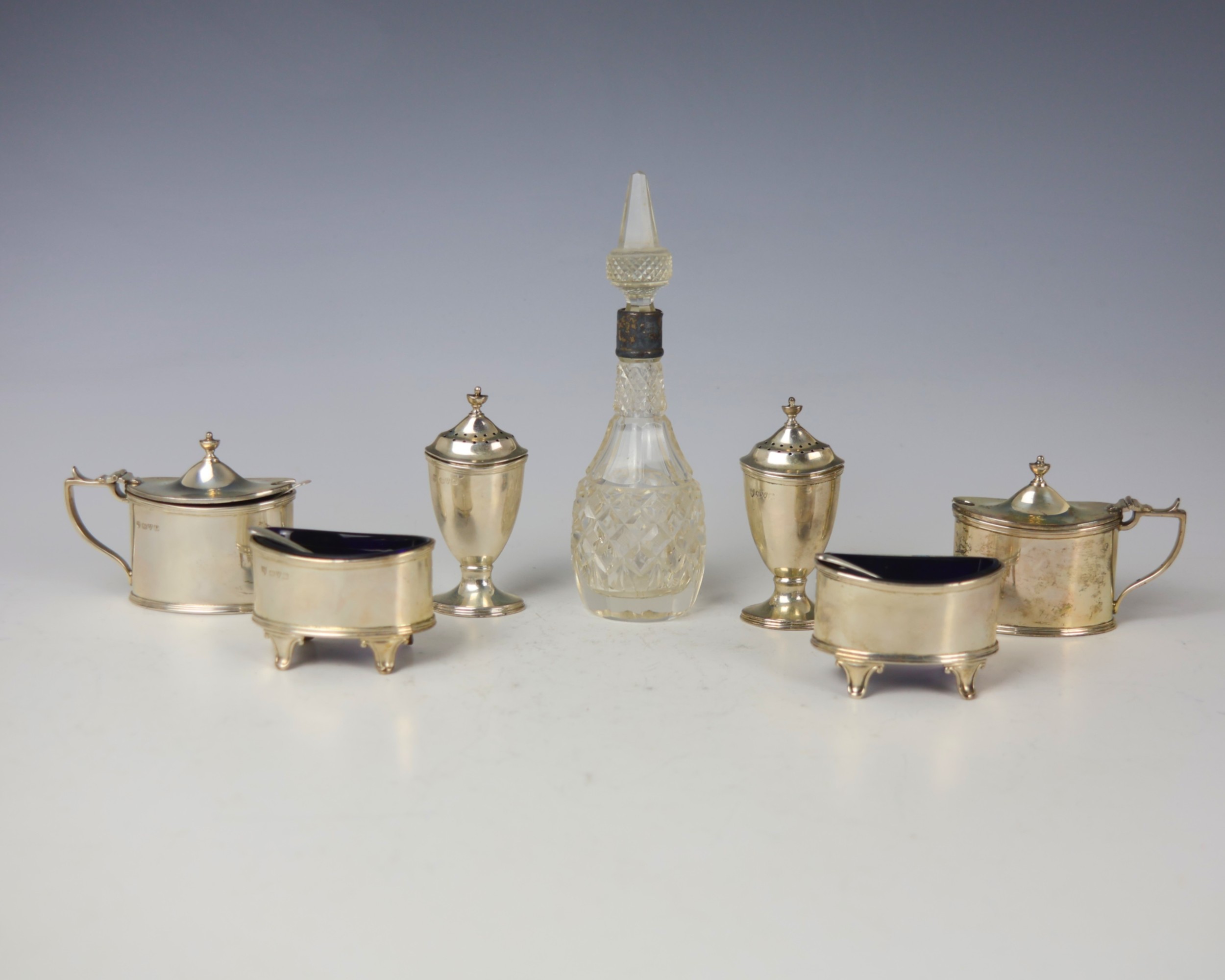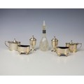 A George V silver double condiment set, Haseler and Bill, Chester 1921, comprising two mustard pots, open salts, pepperettes, of plain polished navette form, pepperettes 9cm high, with further silver mounted and silver coloured pieces, gross weight of hallmarked items 9ozt (12)